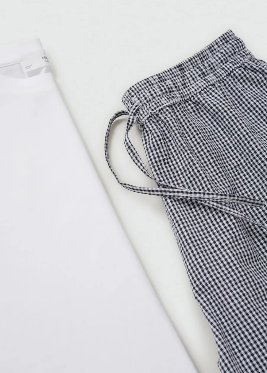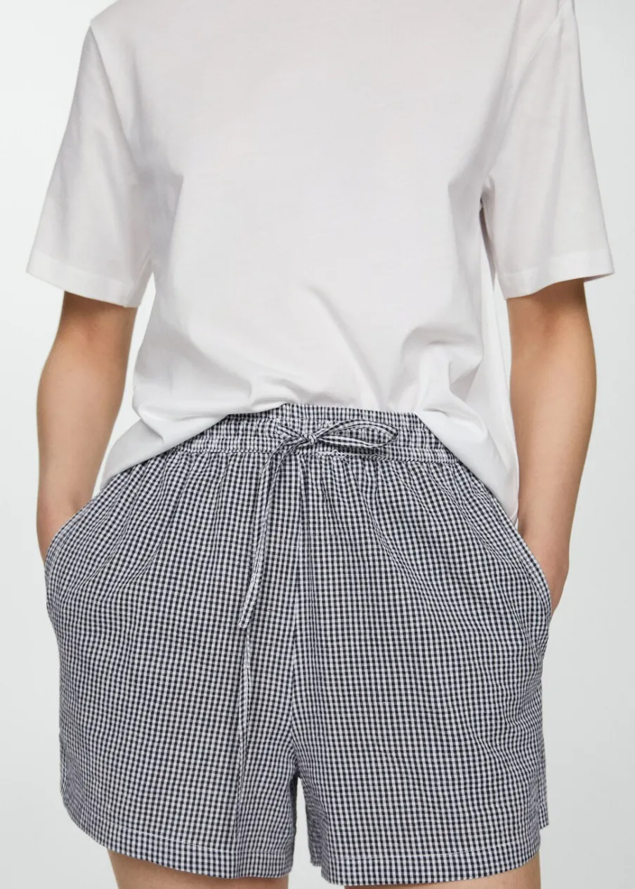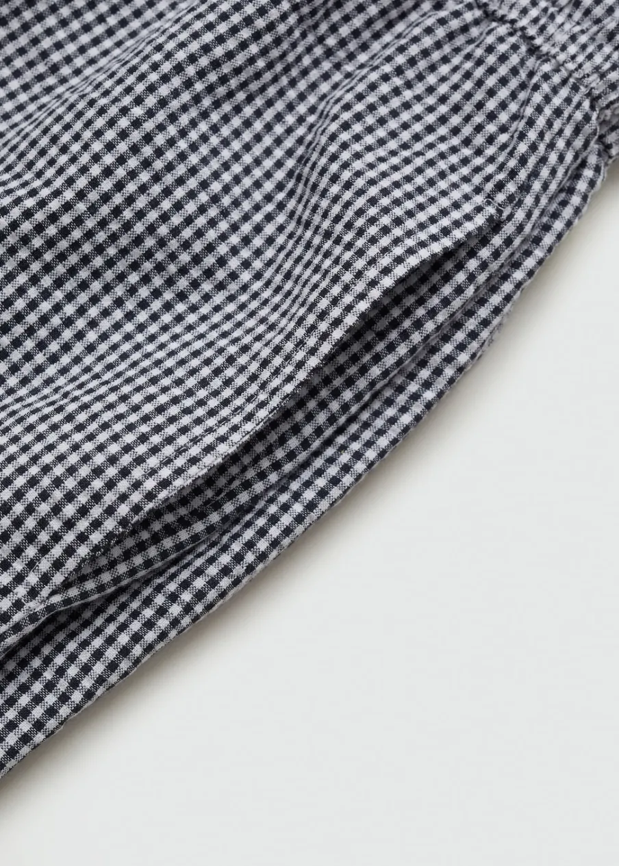 Model prosty. Krótki krój. Wzór w kratkę vichy. Okrągły dekolt. Krótki rękaw. Dwie kieszenie z przodu. Elastyczny pas z wiązanym zapięciem. Tkanina z 100% bawełny.