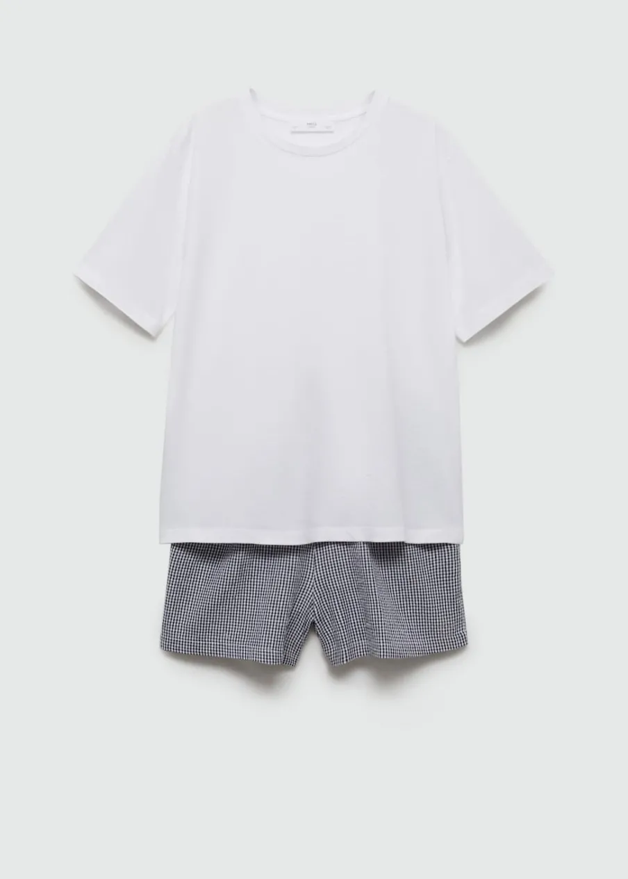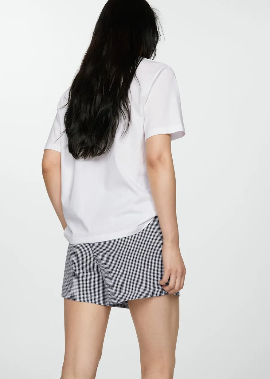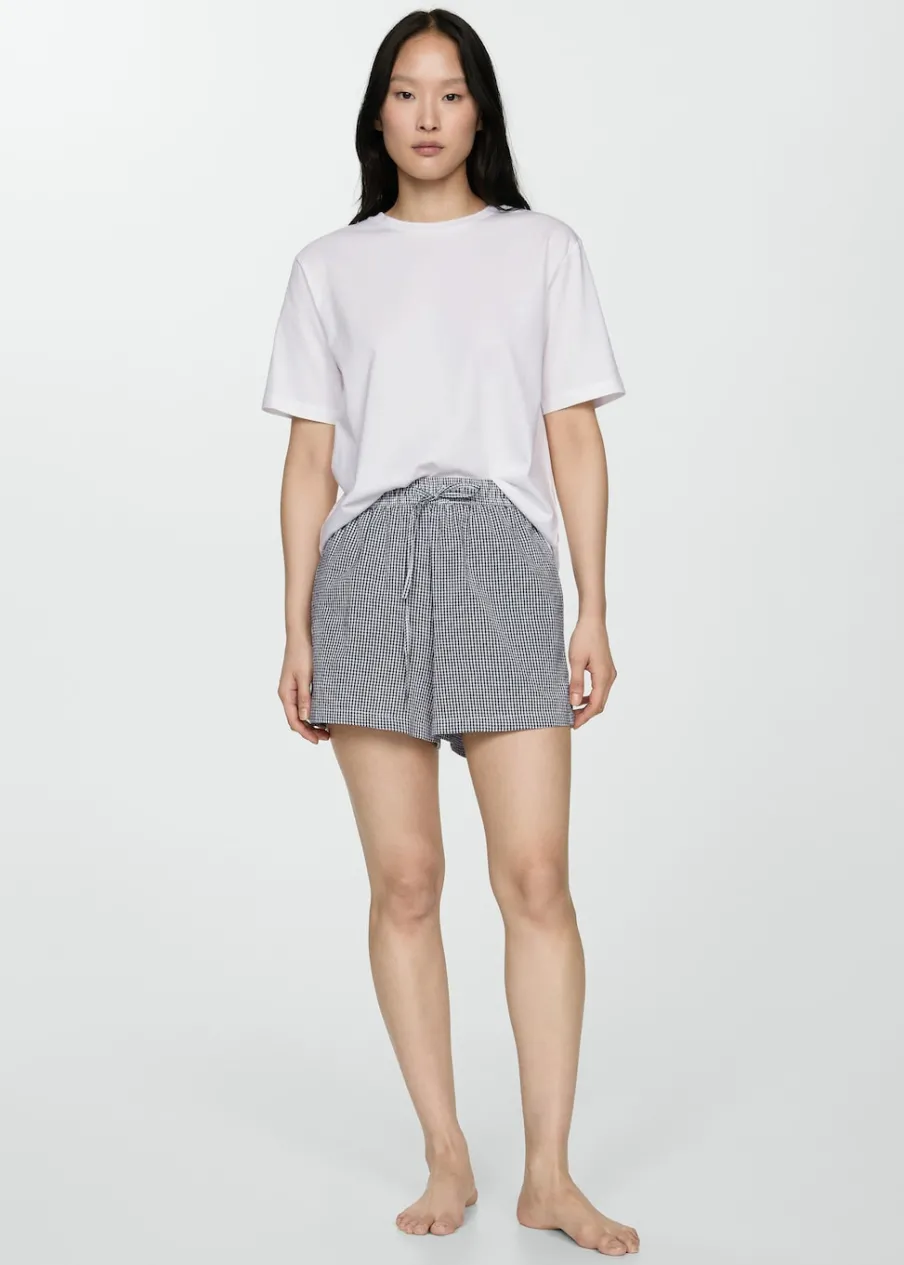 Model prosty. Krótki krój. Wzór w kratkę vichy. Okrągły dekolt. Krótki rękaw. Dwie kieszenie z przodu. Elastyczny pas z wiązanym zapięciem. Tkanina z 100% bawełny.
