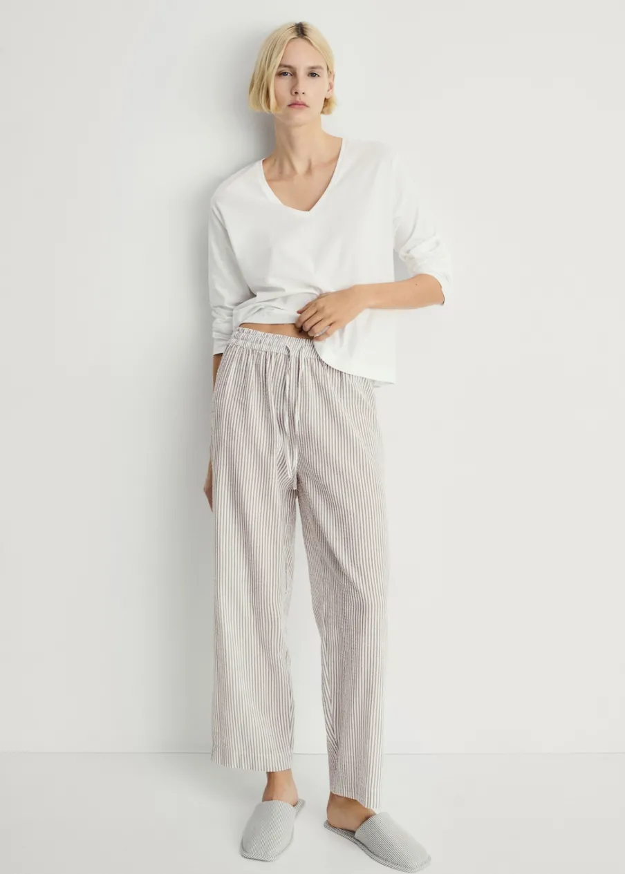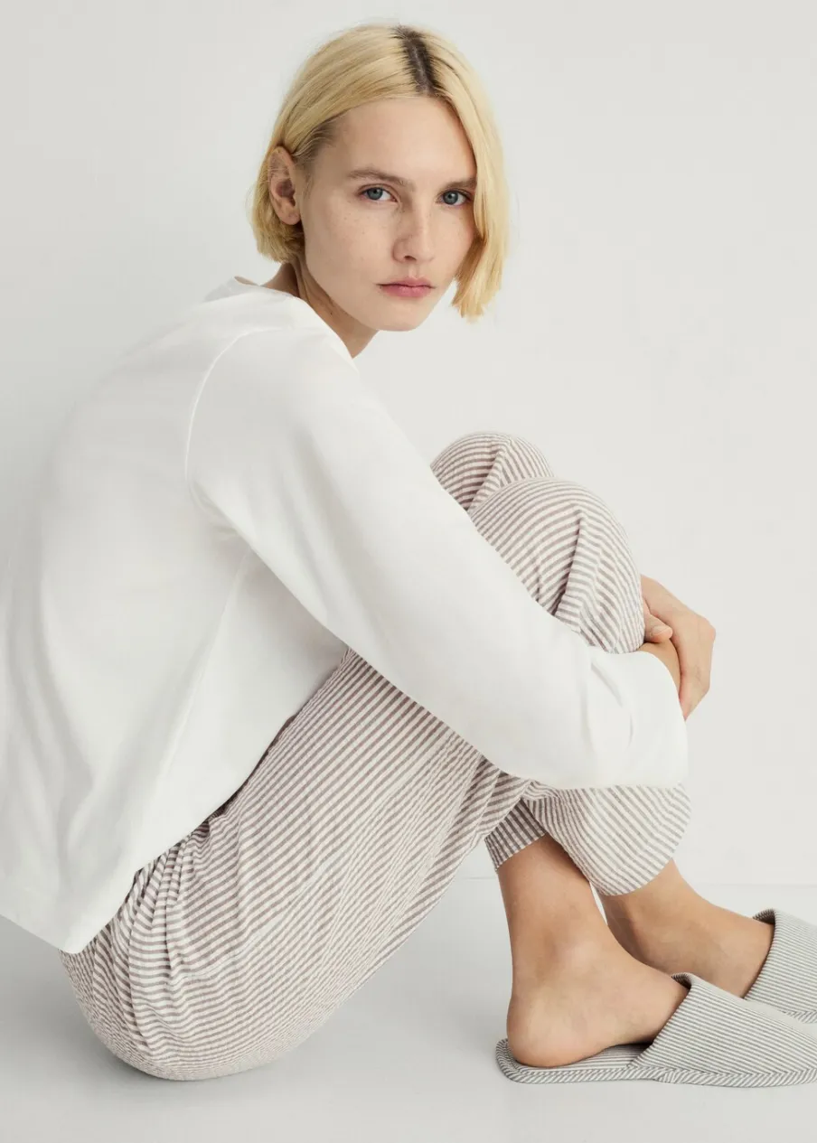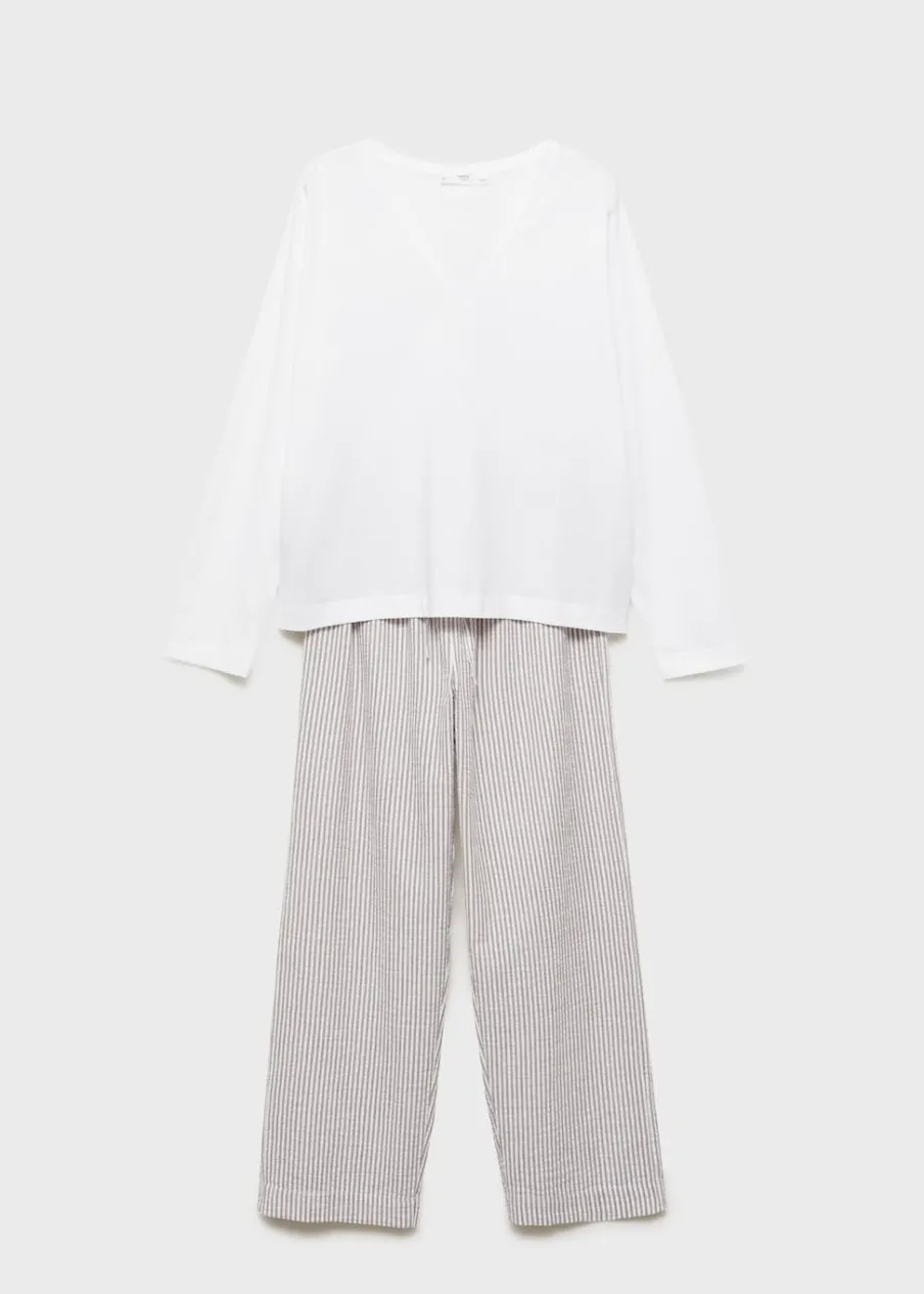Zestaw piżamowy: koszulka i spodnie. Tkanina z 100% bawełny. Model długi. Model prosty. Wzór w pasy. Okrągły dekolt. Długi rękaw. Elastyczny pas. Bez zapięcia.
