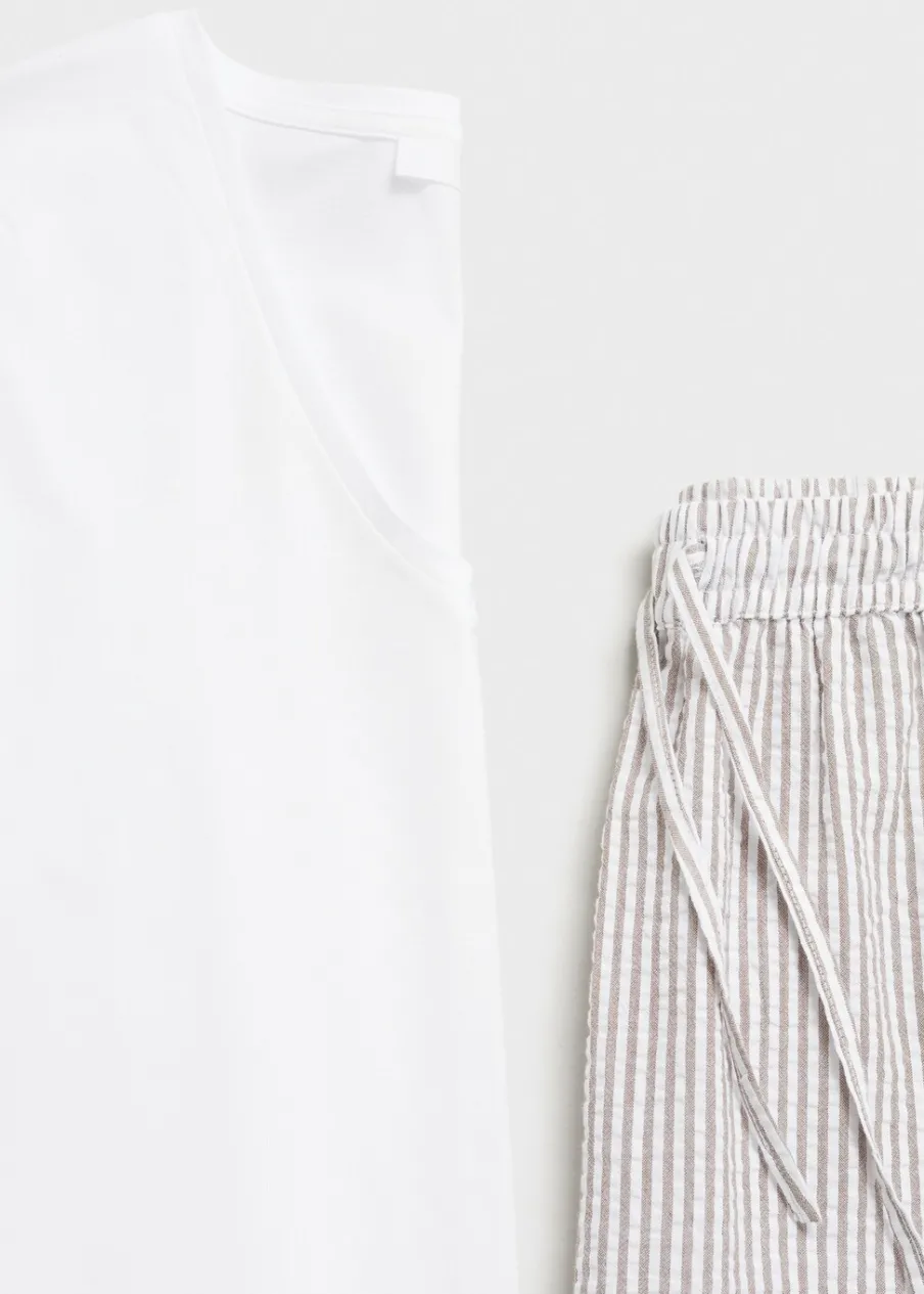 OpisZestaw piżamowy: koszulka i spodnie. Tkanina z 100% bawełny. Model długi. Model prosty. Wzór w pasy. Okrągły d…