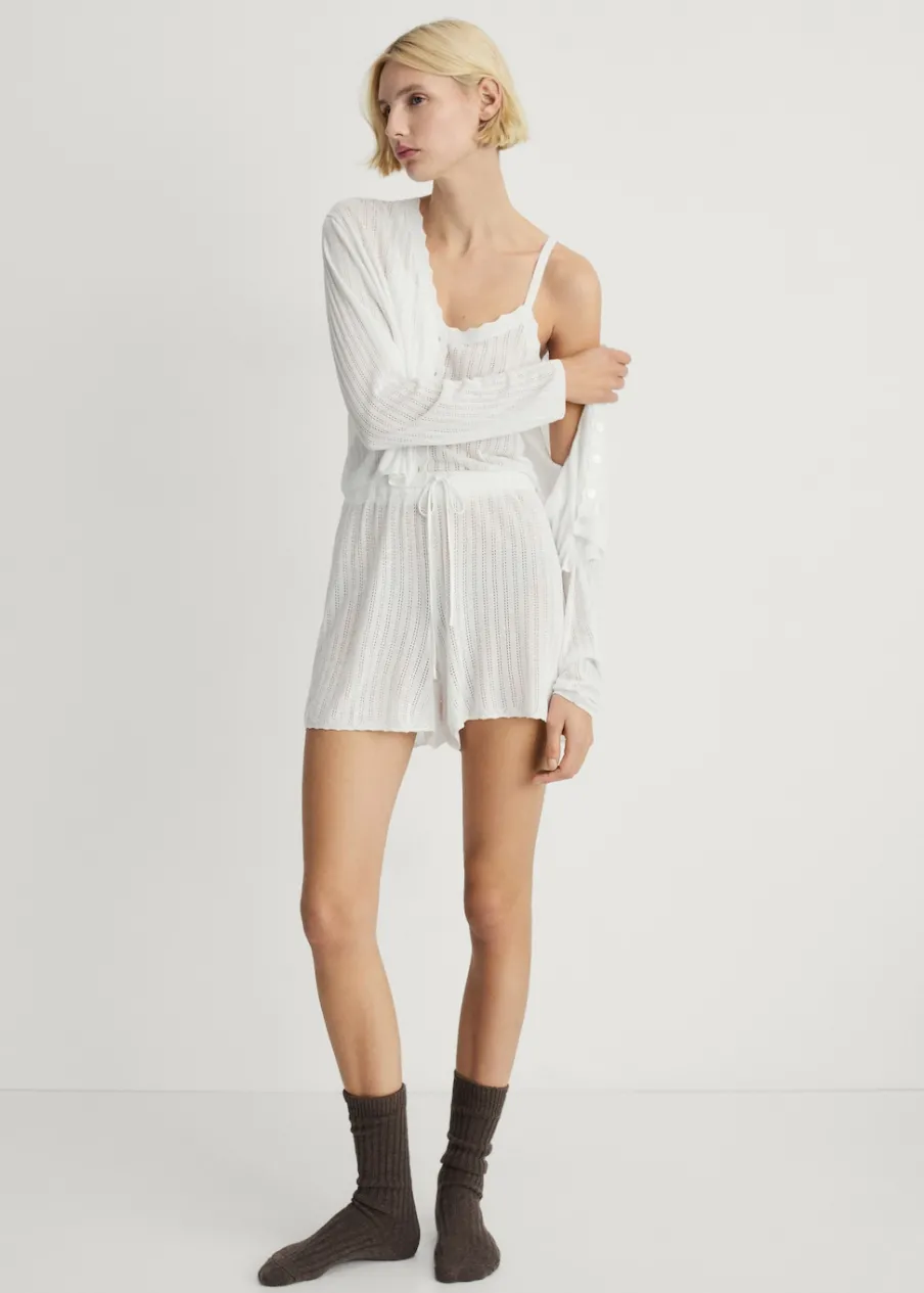 Ażurowa dzianina. Miękki i lekki materiał. Talia ściągana troczkami. Połącz z innymi produktami z kolekcji. Dostępne w różnych kolorach.