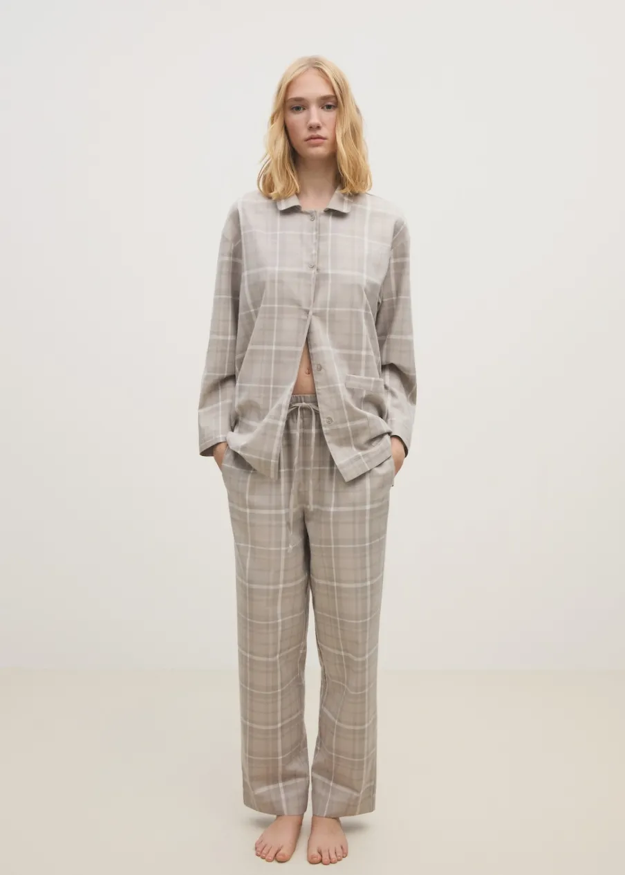Tkanina flanelowa. Wzór w kratę. Elastyczny pas. Zapięcie na regulowane wiązanie. Modelka ma 178 cm wzrostu i nosi rozmiar S/36. Miękka flanela bawełniana. Flanela jest idealnym materiałem na zimną pogodę, ponieważ zatrzymuje ciepło i pochłania wilgoć. Jest wygodna i wytrzymała. To doskonały wybór na jesienne i zimowe noce. Miękka tekstura. Miękki i ciepły materiał zapewniający komfort w domu. Idealny wybór dla osób pragnących połączyć styl i komfort w miejscu wypoczynku.
