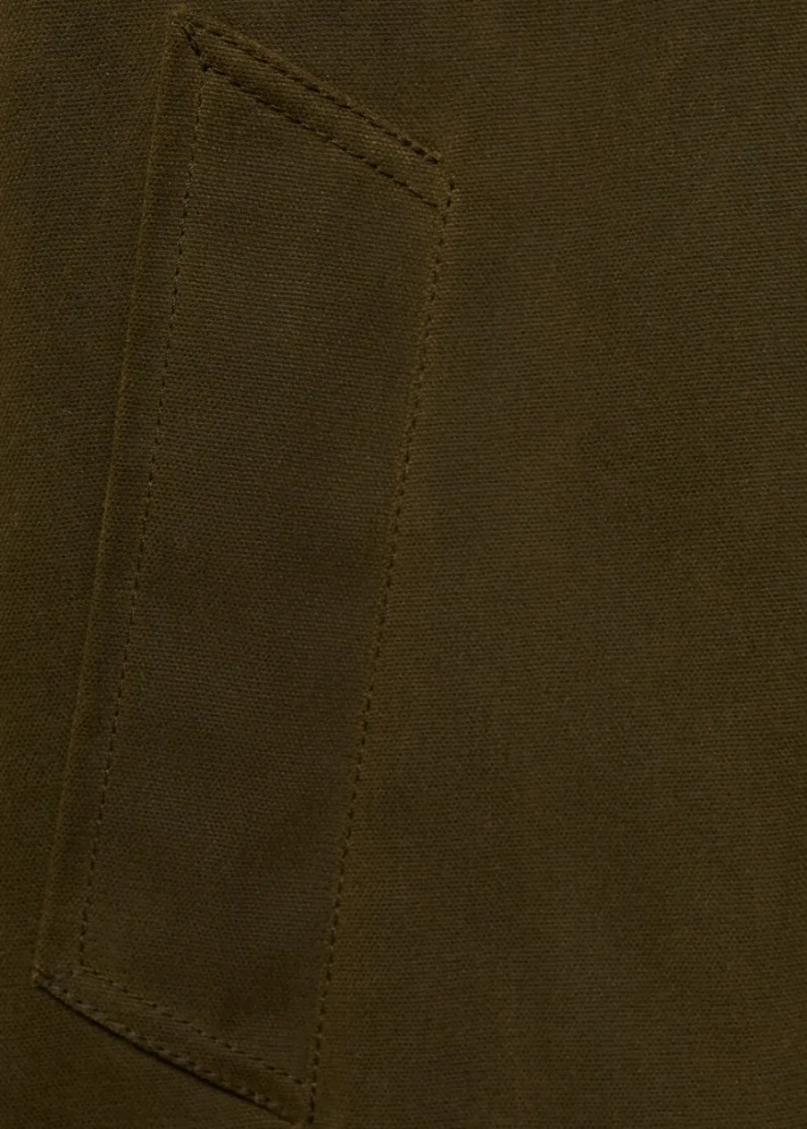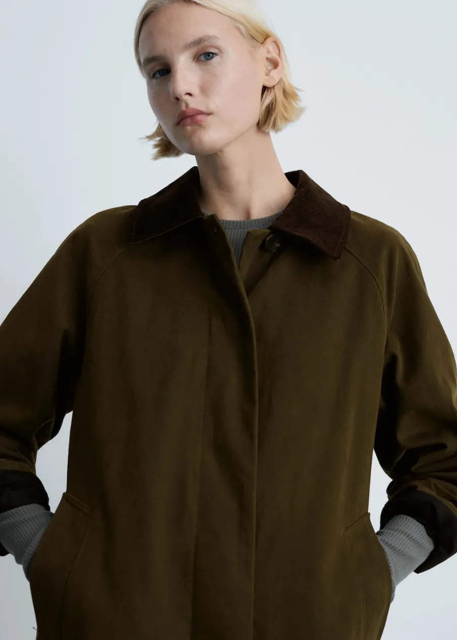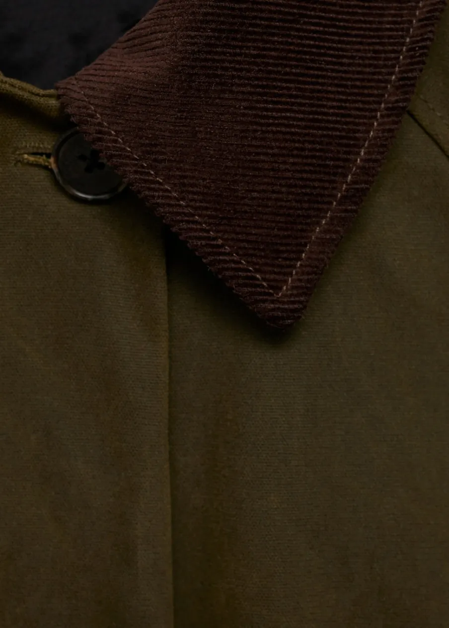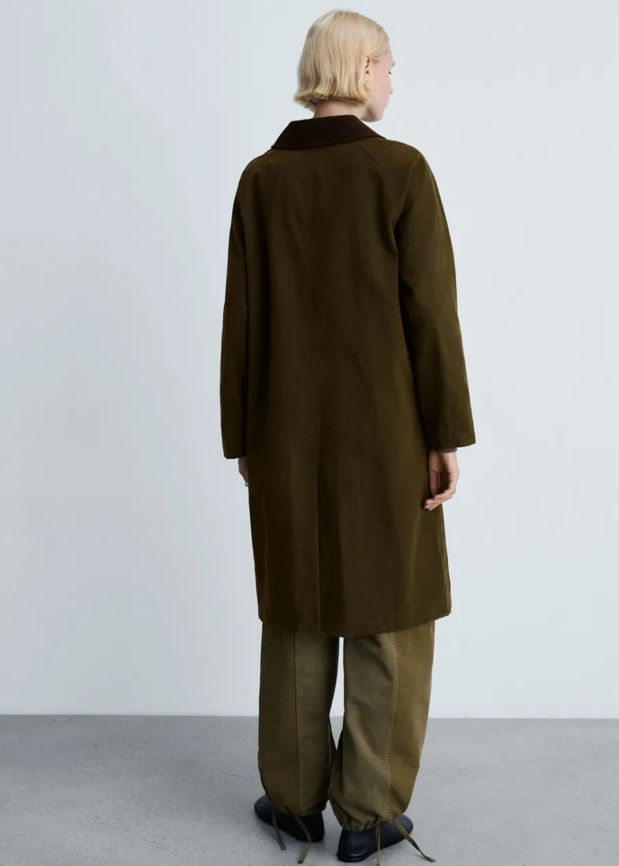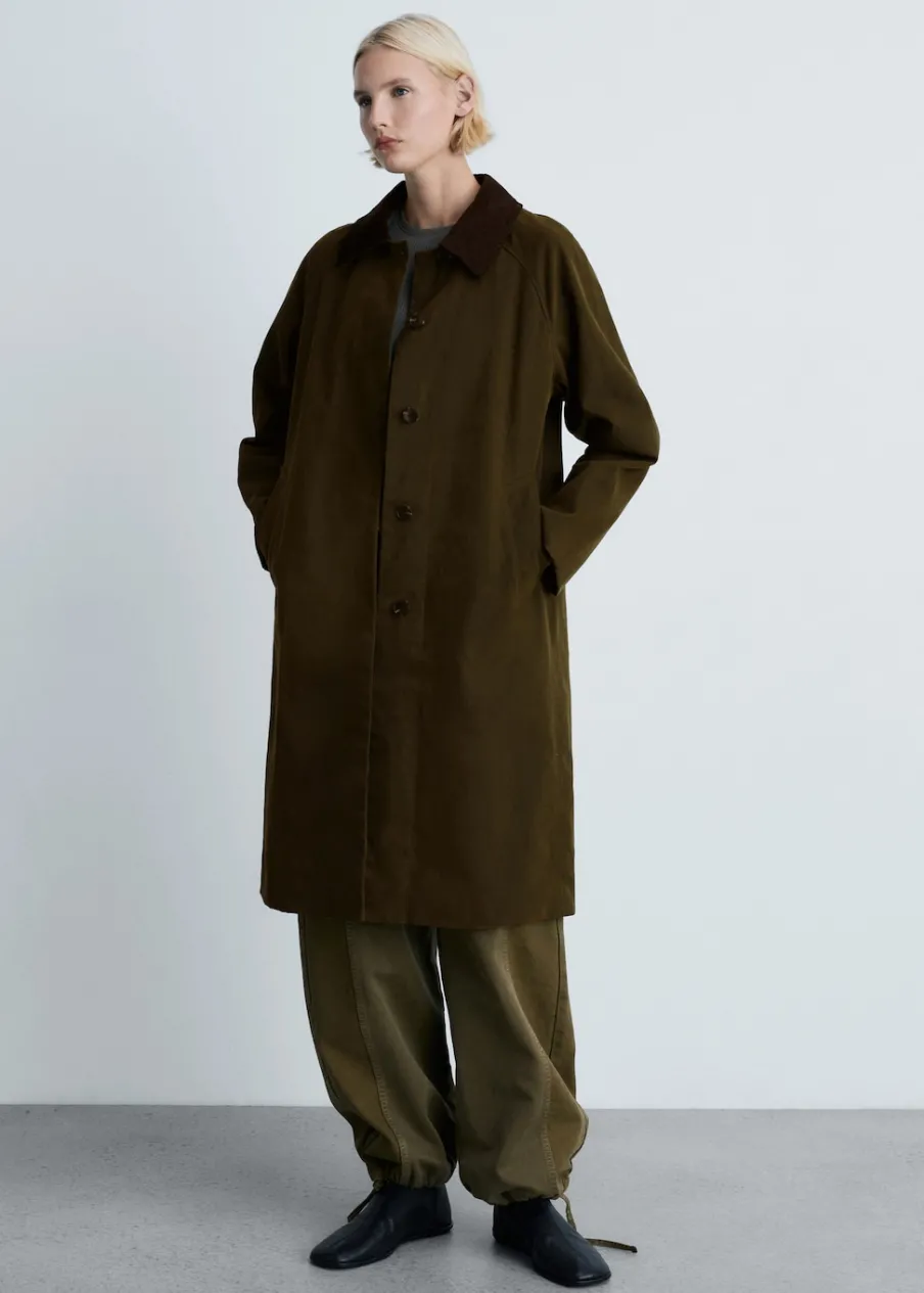 Tkanina z 100% bawełny. Ciężka struktura. Model oversize. Model długi. Kontrastowy, koszulowy kołnierz. Długi rękaw. Kieszenie boczne. Zapięcie z przodu na guziki. Wewnętrzna podszewka.