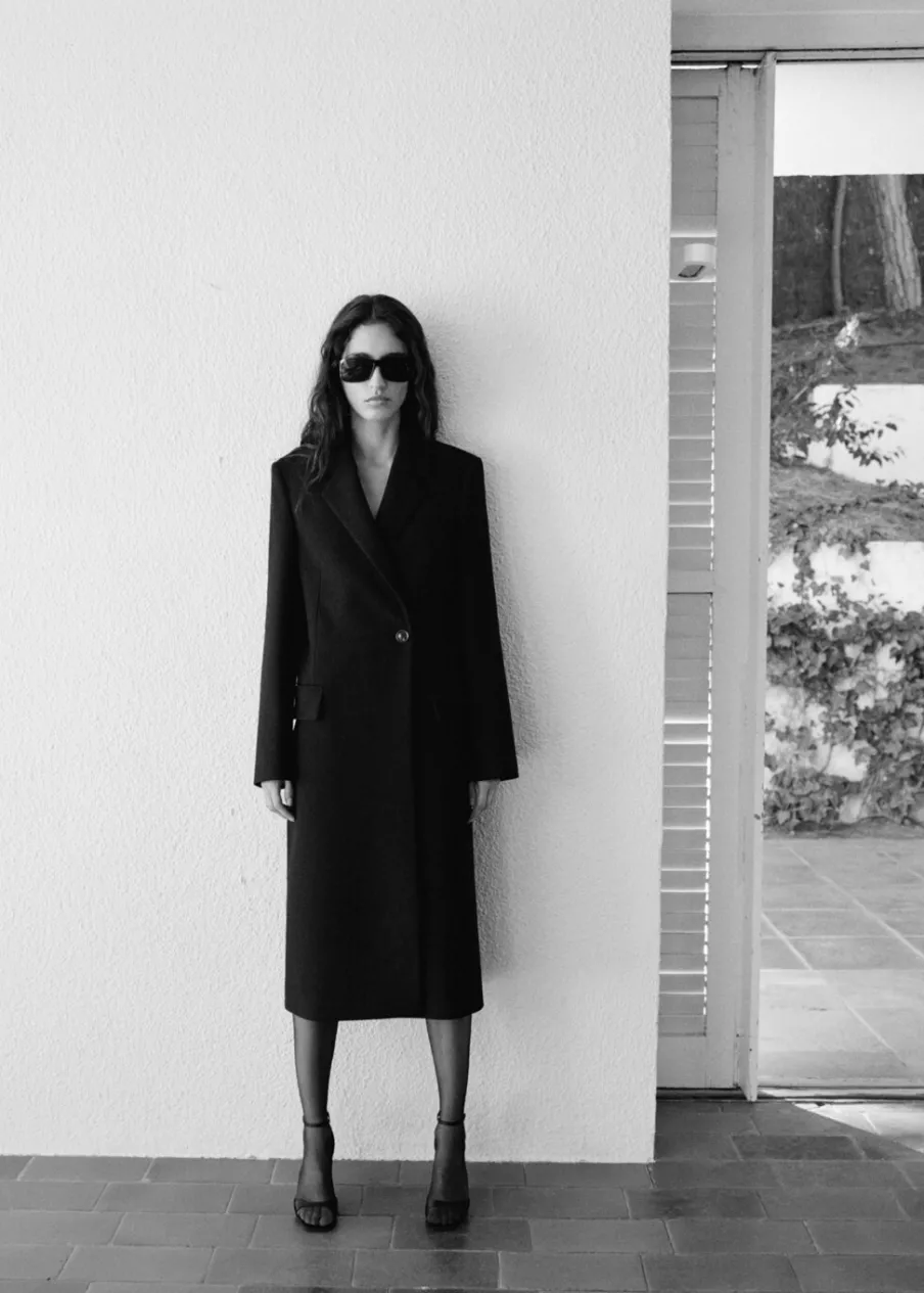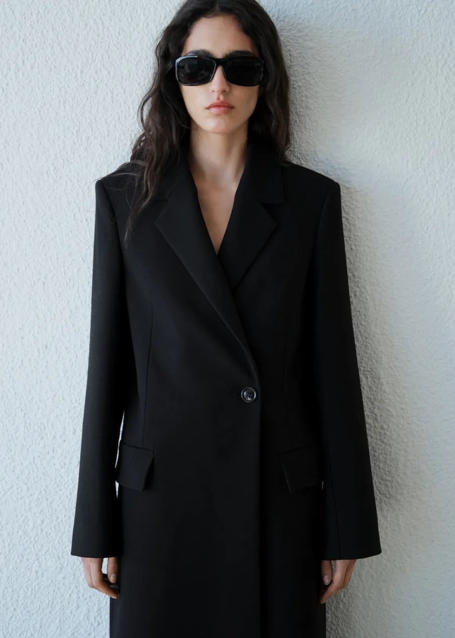 Tkanina mieszanka wełny. Model długi. Model strukturalny. Wyraźne ramiona. Dekolt w szpic z kołnierzykiem. Klapy z nacięciem. Długi rękaw. Dwie kieszenie boczne z patką. Zapięcie z przodu na guziki. Wewnętrzna podszewka.