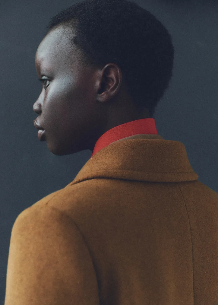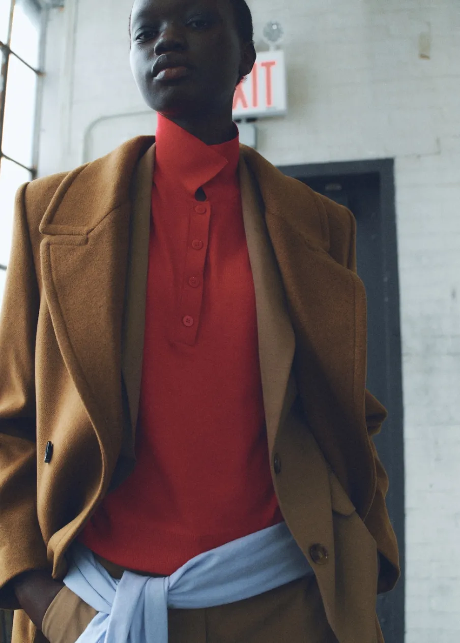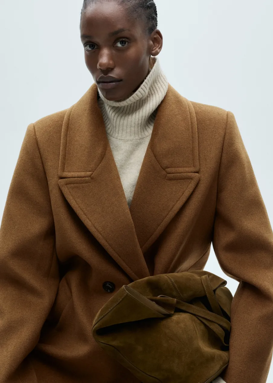 Tkanina mieszanka wełny. Ciężka struktura. Model prosty. Model długi. Nacięte klapy. Dekolt w szpic z kołnierzykiem. Klapy z nacięciem. Długi rękaw. Dwie wpuszczane kieszenie boczne. Dwurzędowe zapięcie. Tylko podszewka.