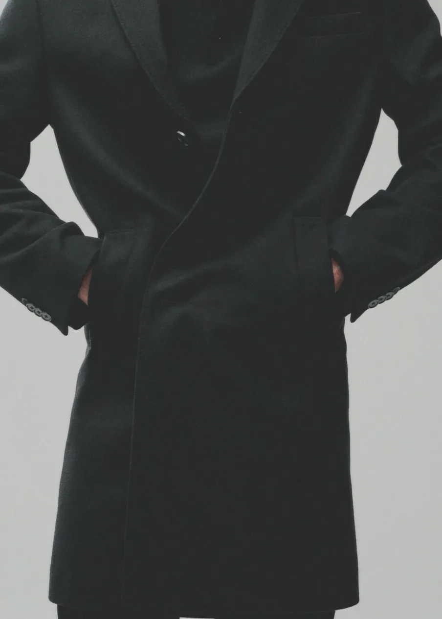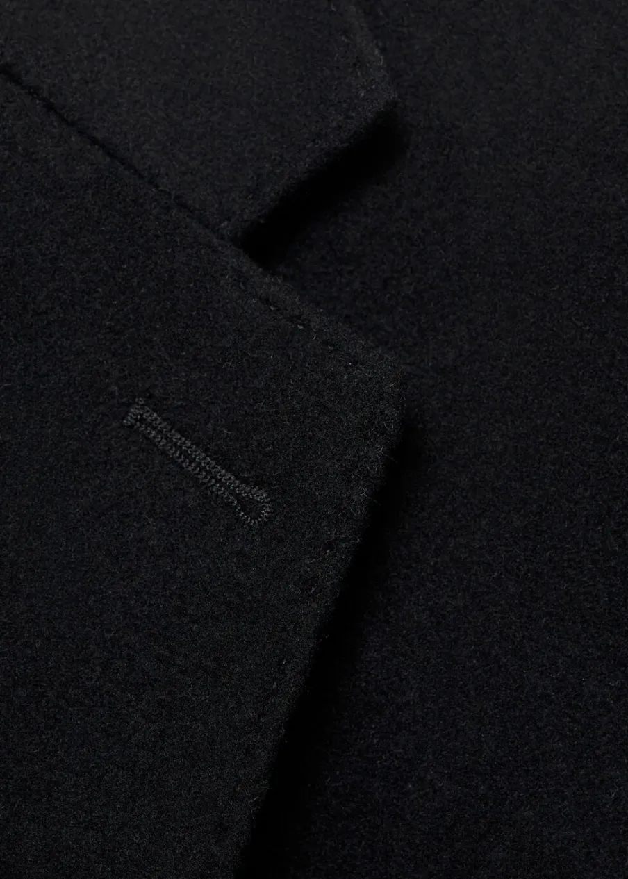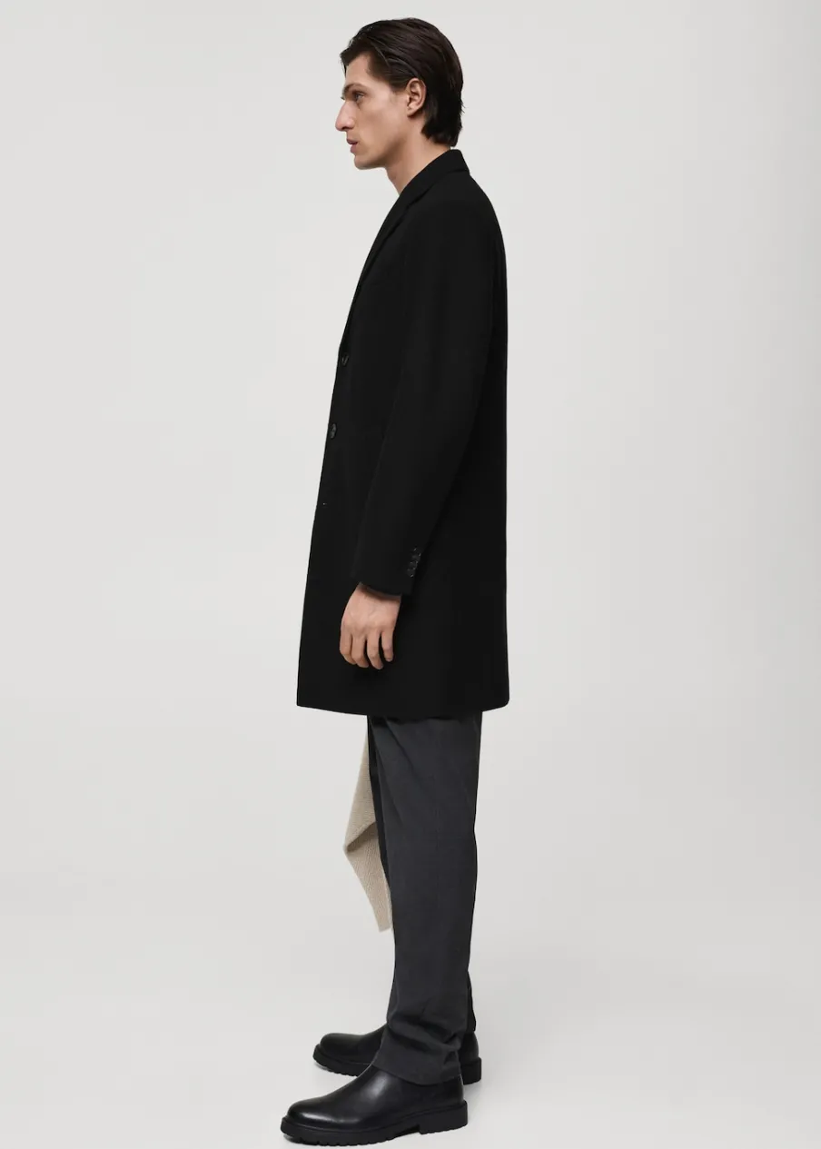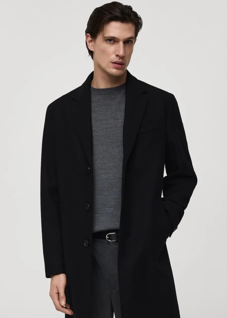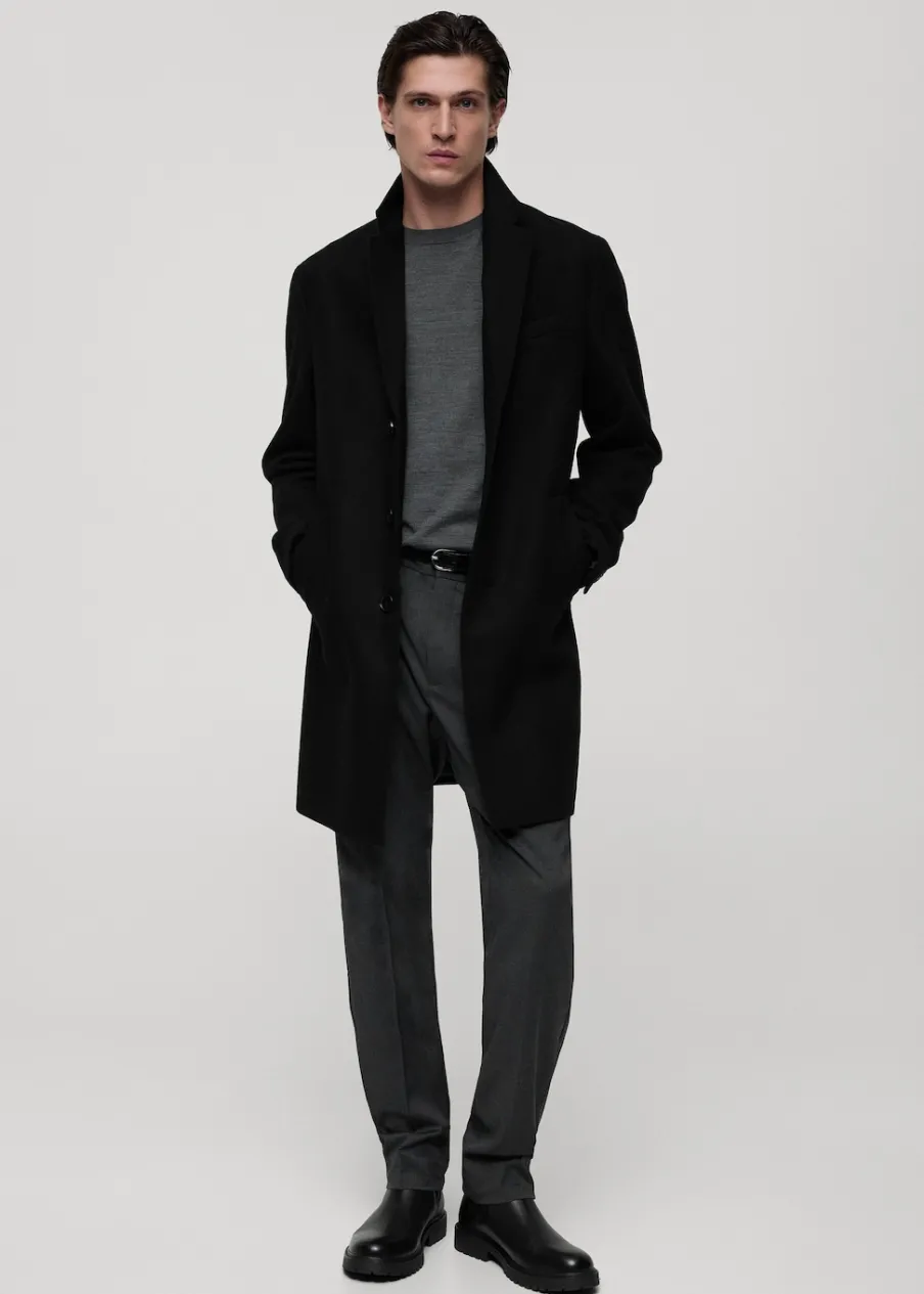 ESSENTIALS: Made to last. Tkanina mieszana z recyklowanej wełny. Slim-fit. Model długi. Klapy z nacięciem. Długi rękaw z guzikami na mankietach. Wewnętrzna podszewka. Dwie kieszenie wewnętrzne. Dwie wpuszczane kieszenie boczne. Kieszeń wpuszczana na piersi. Rozcięcie z tyłu u dołu. Model ma 187 cm wzrostu i nosi rozmiar M. Usztywniany kołnierz z klapami.