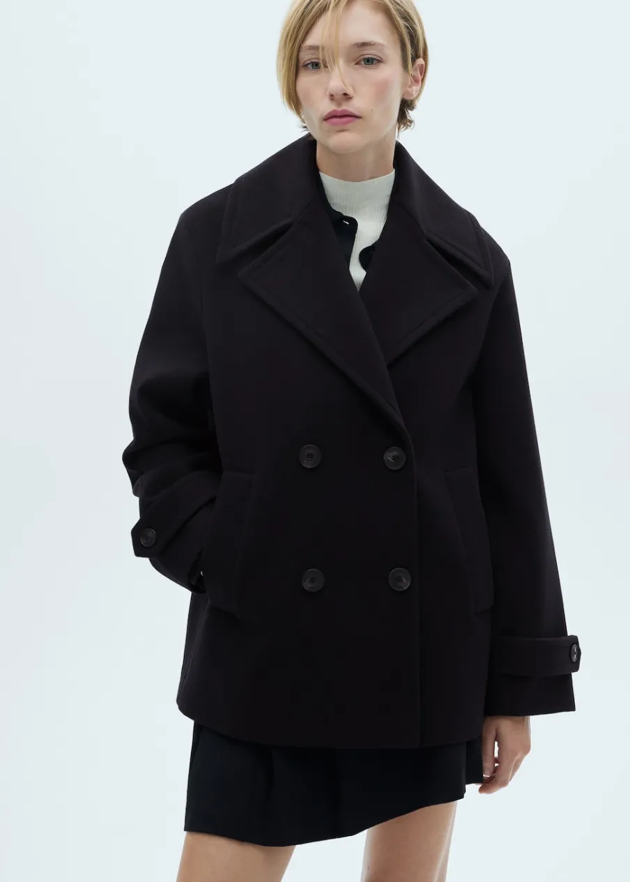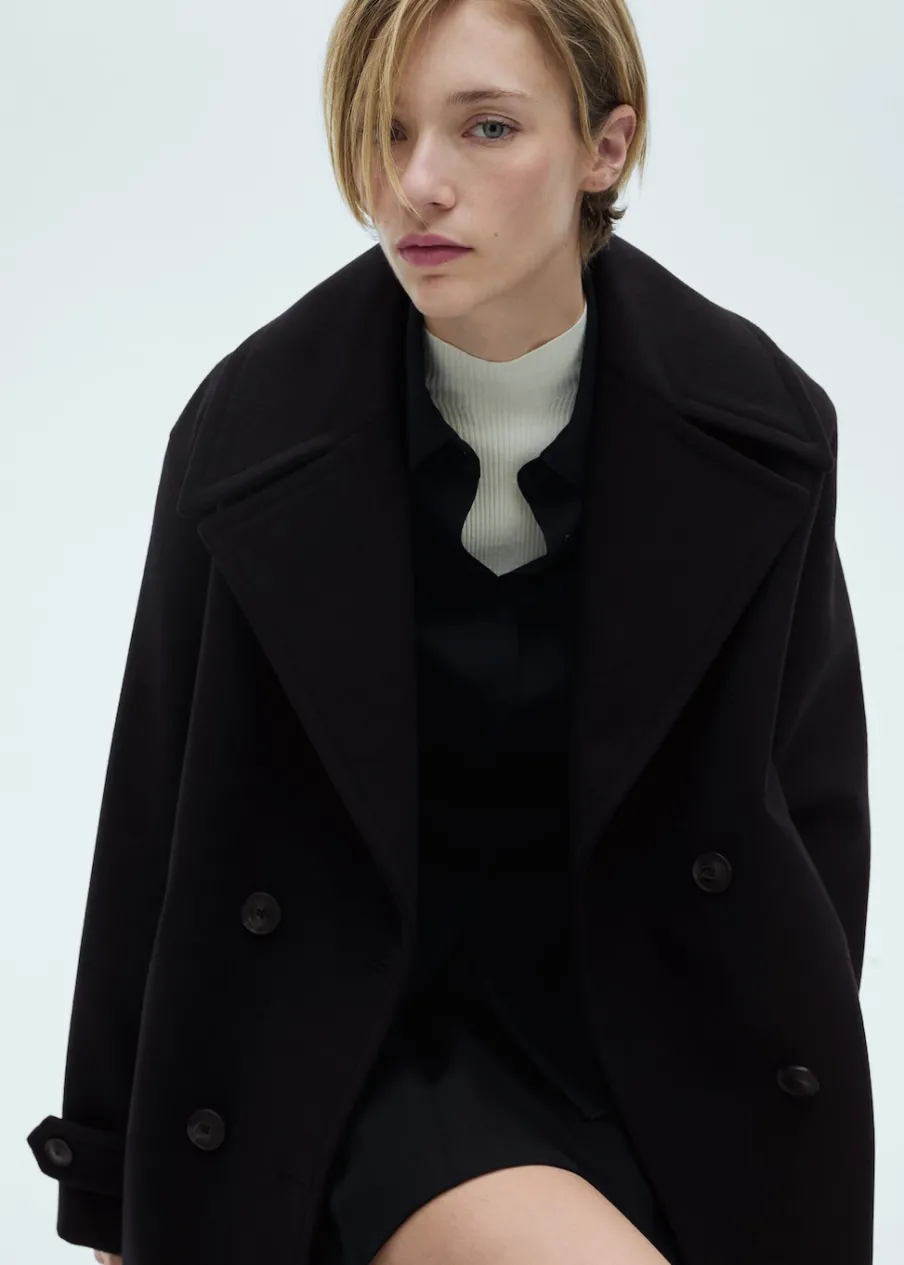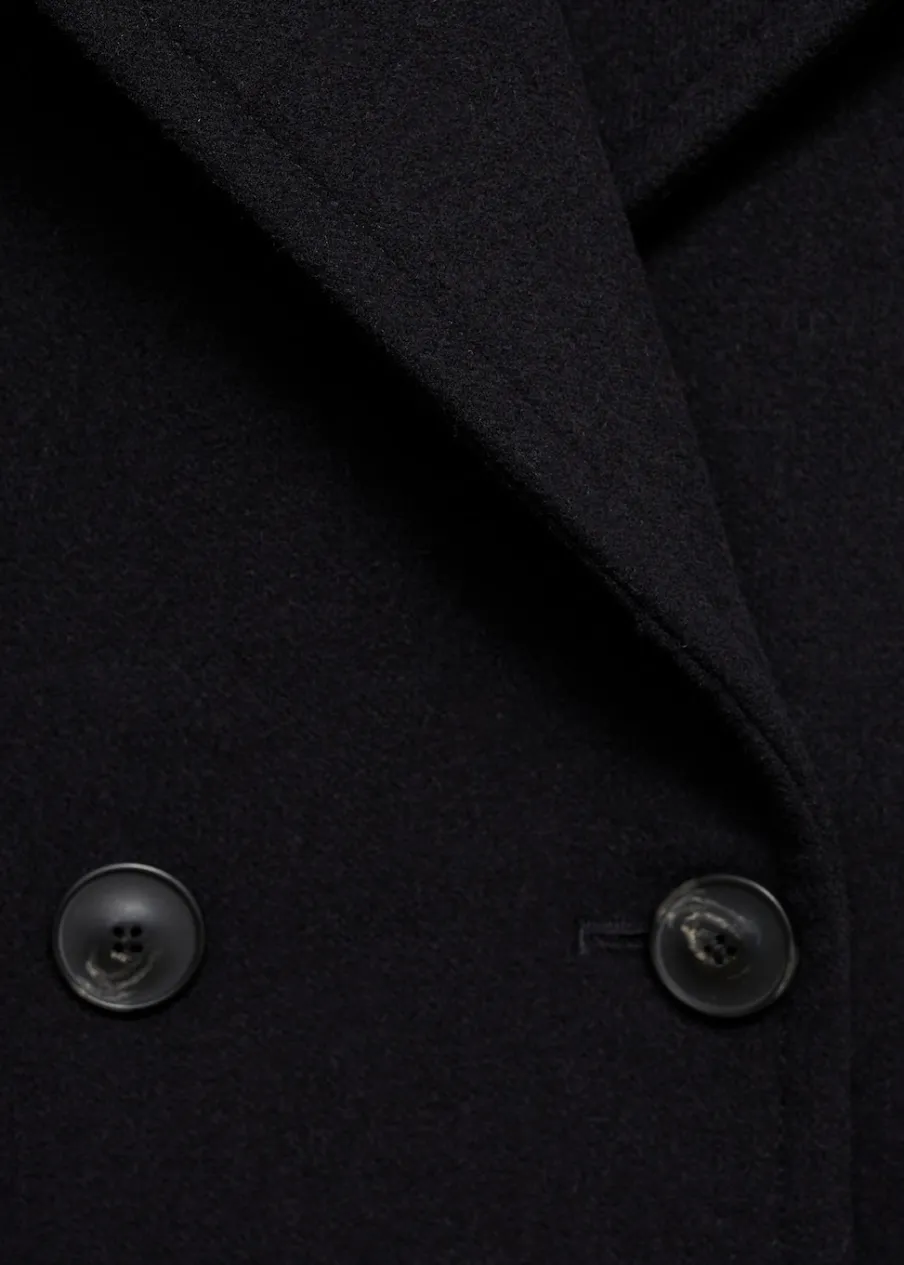 Tkanina mieszanka wełny. Fason o średniej długości. Model prosty. Kołnierz z klapami. Klapy z nacięciem. Długi rękaw z patkami na guziki na mankiecie. Dwie kieszenie boczne. Dwurzędowe zapięcie. Wewnętrzna podszewka. Modelka ma 181 cm wzrostu i nosi rozmiar S/36.