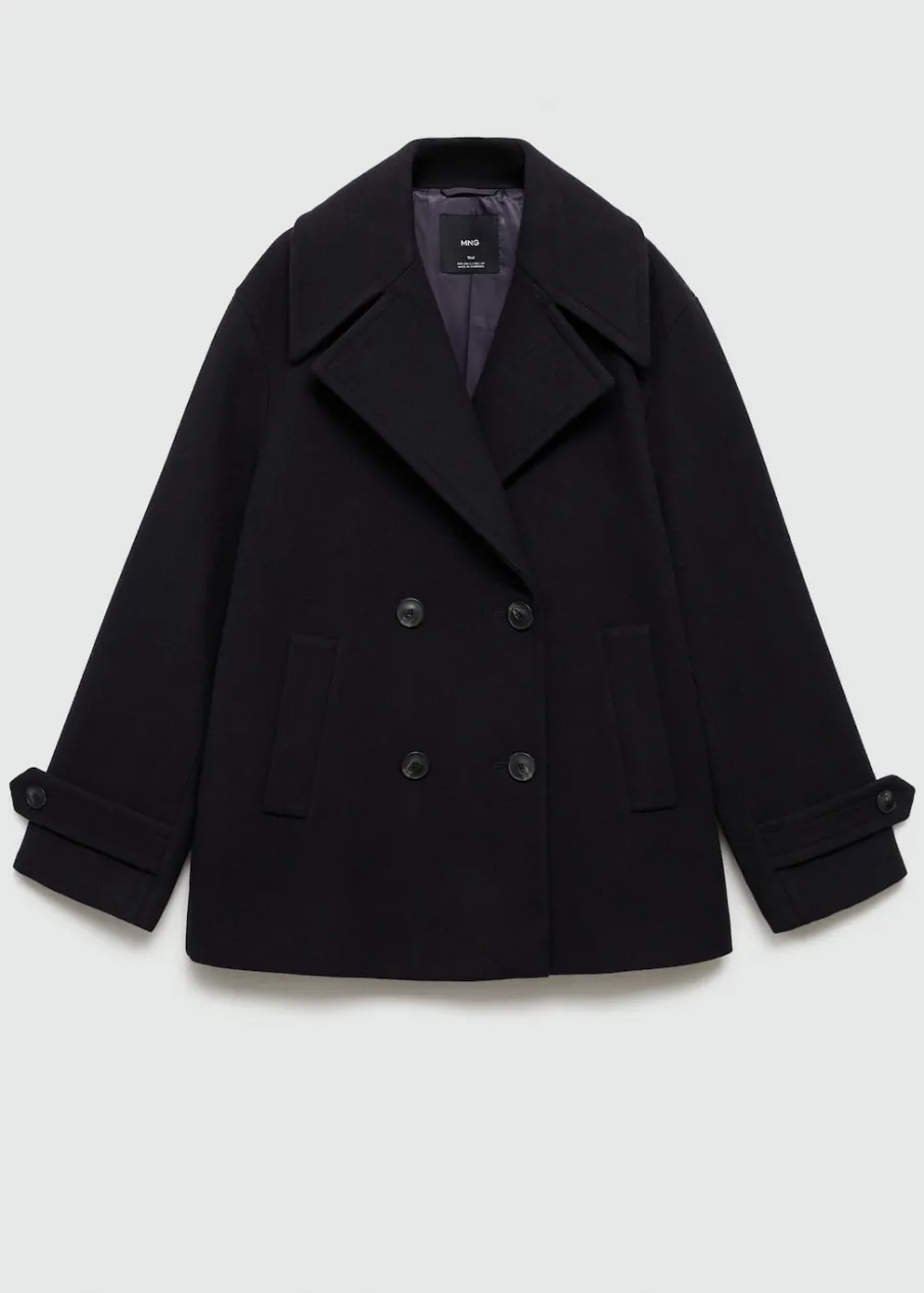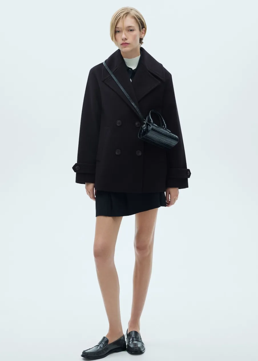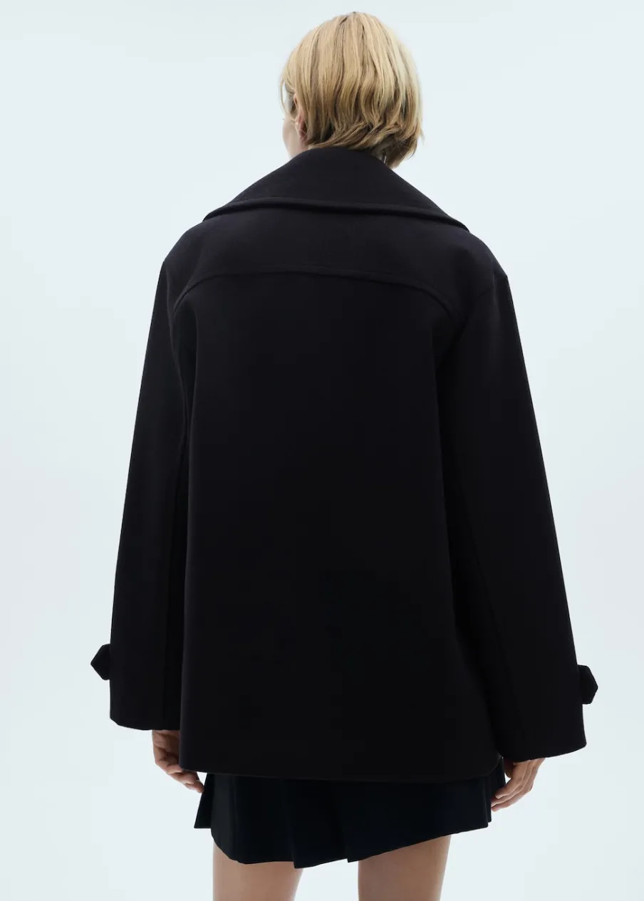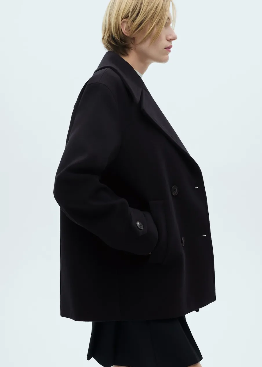 Tkanina mieszanka wełny. Fason o średniej długości. Model prosty. Kołnierz z klapami. Klapy z nacięciem. Długi rękaw z patkami na guziki na mankiecie. Dwie kieszenie boczne. Dwurzędowe zapięcie. Wewnętrzna podszewka. Modelka ma 181 cm wzrostu i nosi rozmiar S/36.