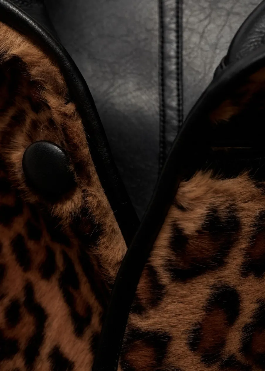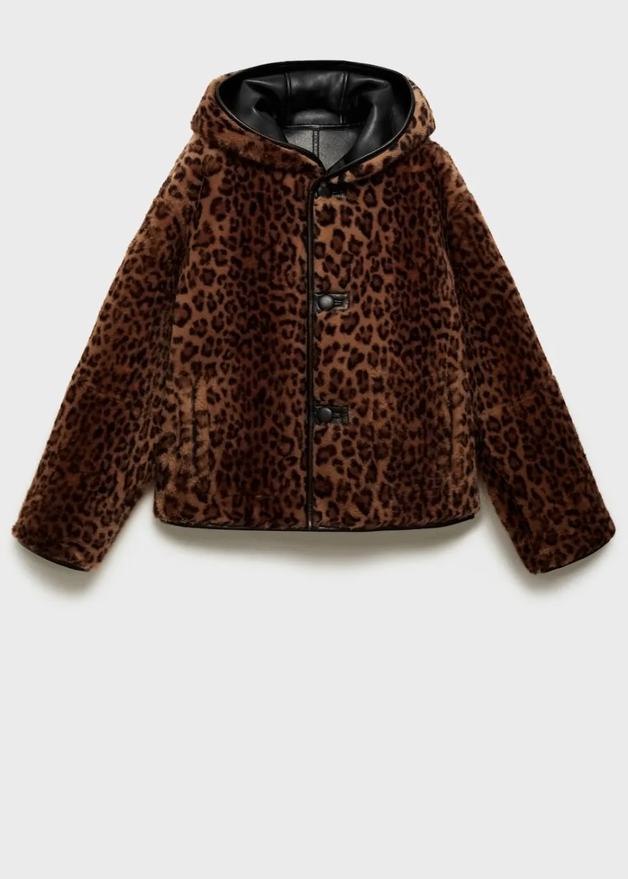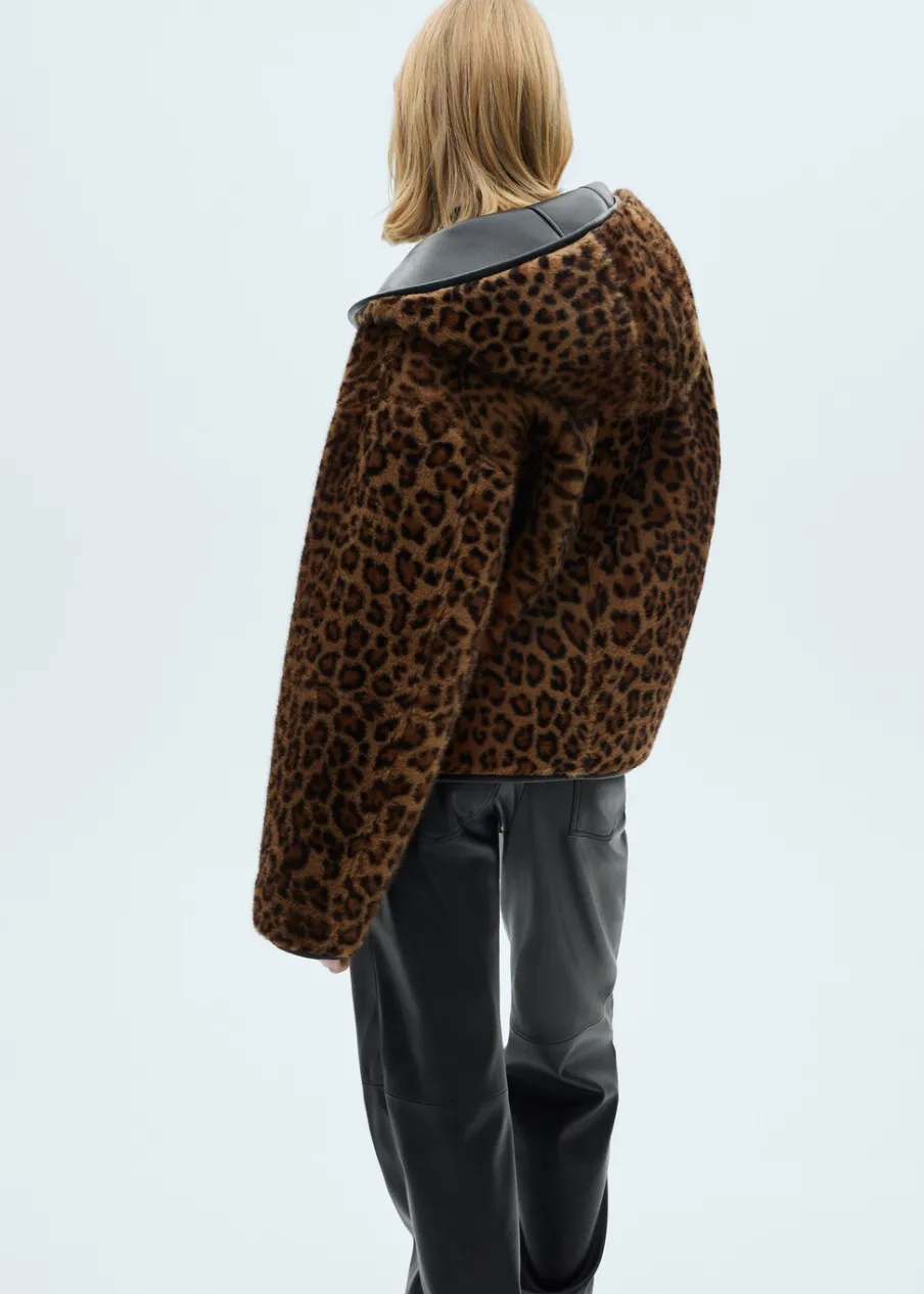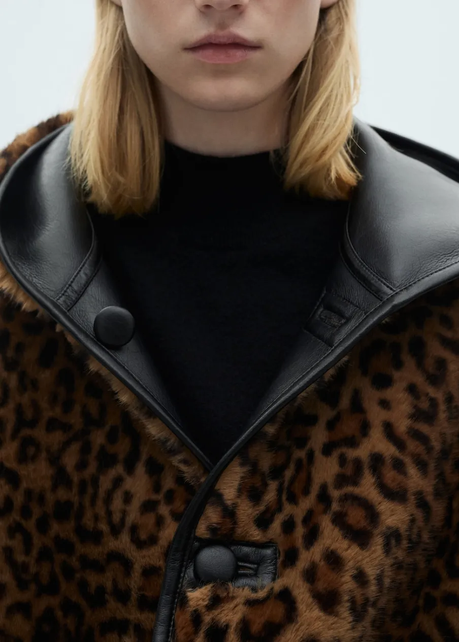 Włochata tekstura. Efekt skóry. Model dwustronny. Model dwustronny. Model oversize. Wzór w lamparcie cętki. Dwie kieszenie nakładane z przodu. Zapięcie z przodu na guziki. Modelka ma 178 cm wzrostu i nosi rozmiar S/36.