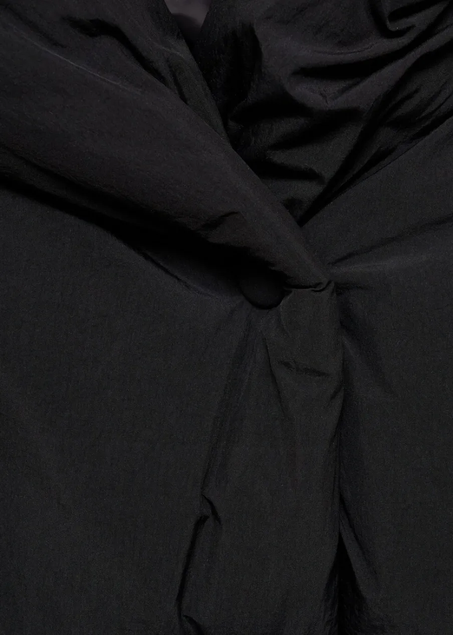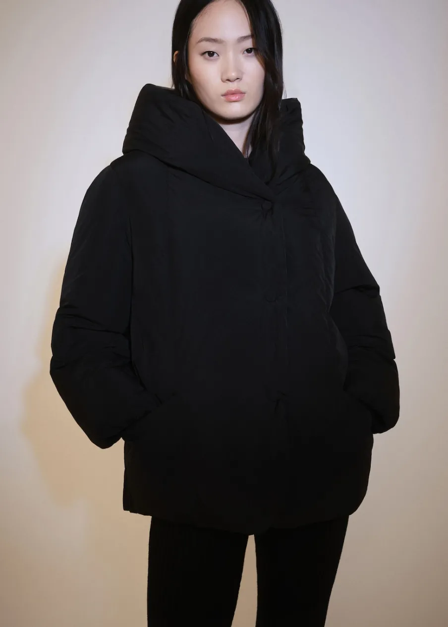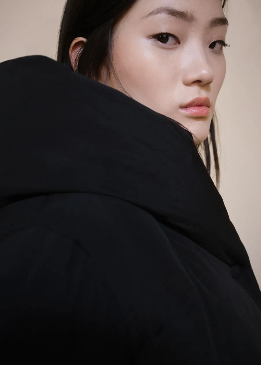 Tkanina nylonowa. Model oversize. Model prosty. Fason o średniej długości. Golf. Długi rękaw. Kaptur. Dwie kieszenie boczne. Modelka ma 175 cm wzrostu i nosi rozmiar S/36. Zapięcie na guziki z przodu.