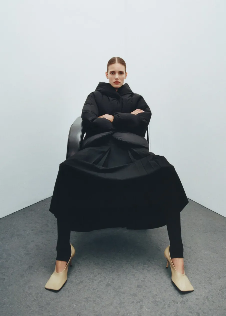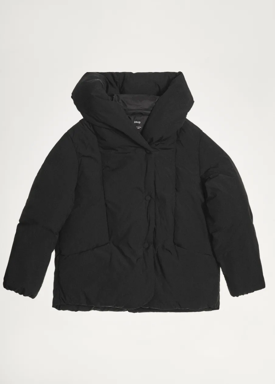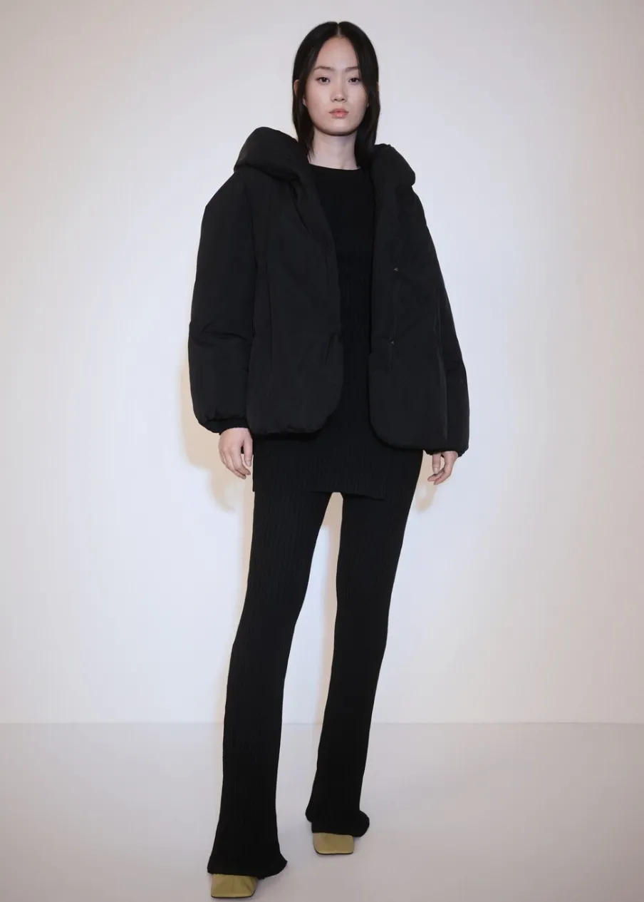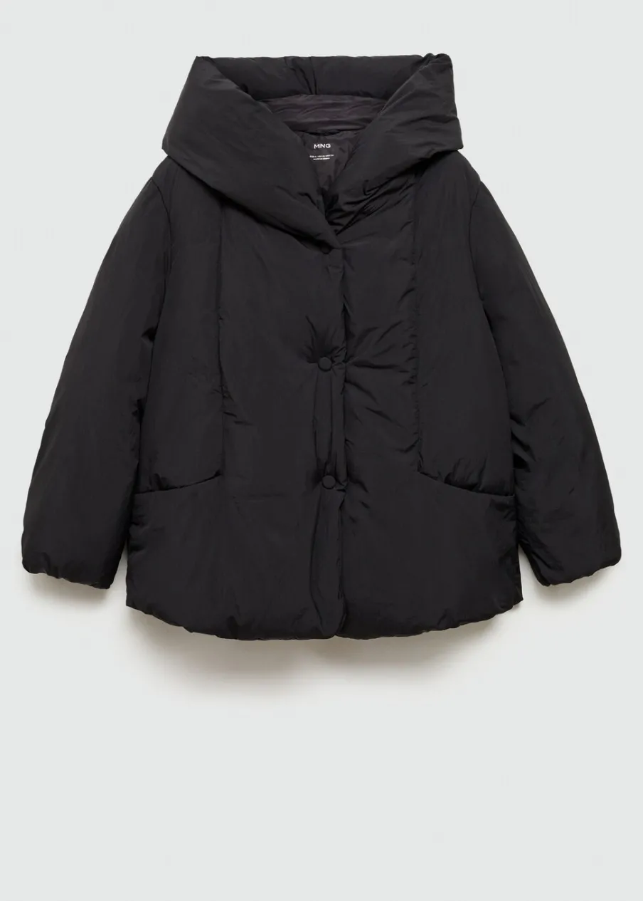 Tkanina nylonowa. Model oversize. Model prosty. Fason o średniej długości. Golf. Długi rękaw. Kaptur. Dwie kieszenie boczne. Modelka ma 175 cm wzrostu i nosi rozmiar S/36. Zapięcie na guziki z przodu.