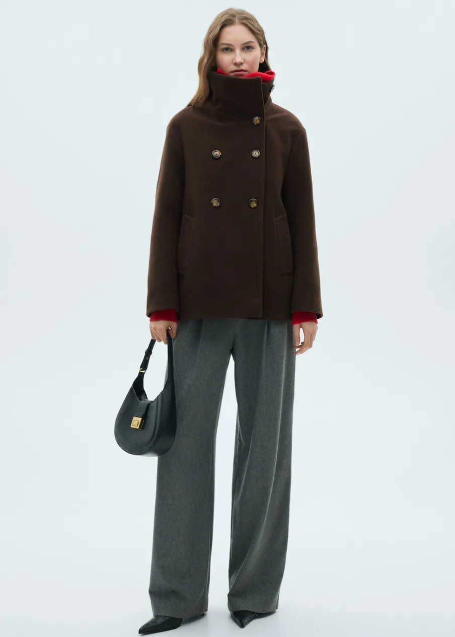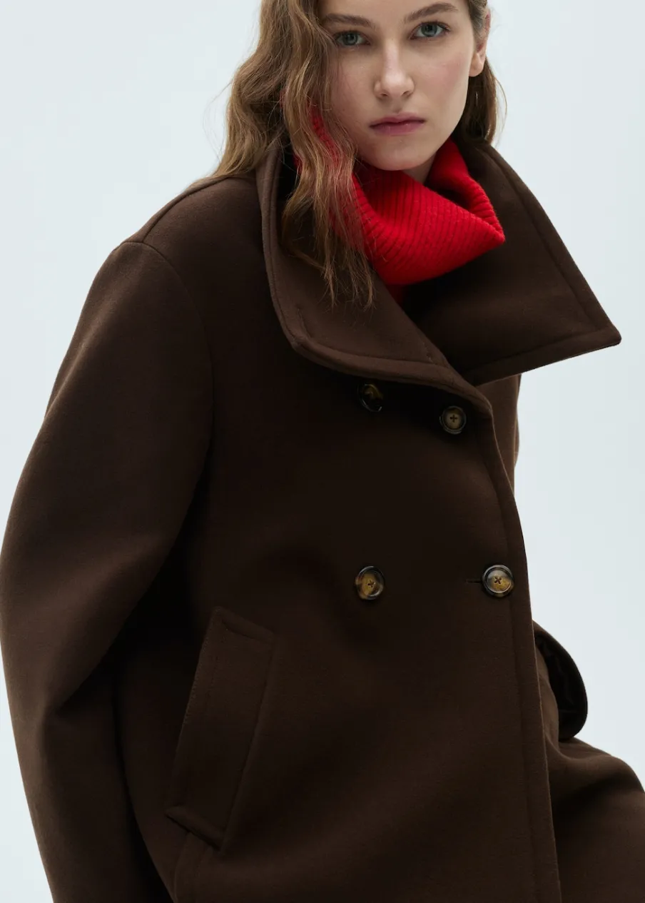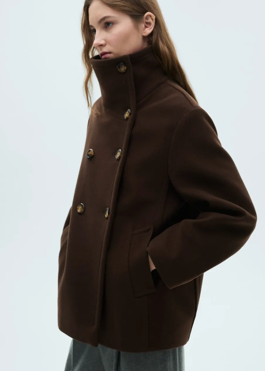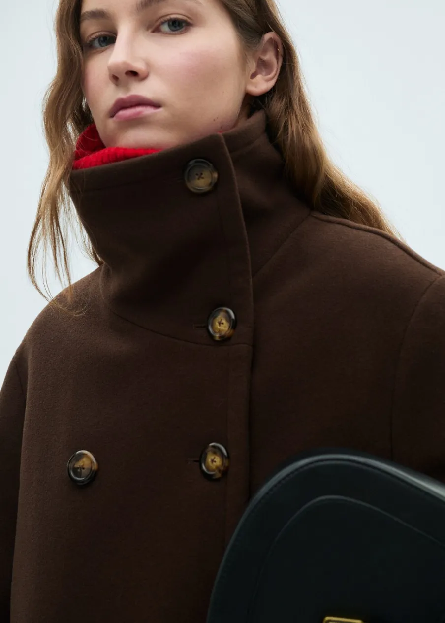 Zapięcie z przodu. Tkanina mieszanka wełny. Ciężka struktura. Model prosty. Fason o średniej długości. Kominowy kołnierz. Długi rękaw. Dwie wpuszczane kieszenie boczne. Dwurzędowe zapięcie. Tylko podszewka.
