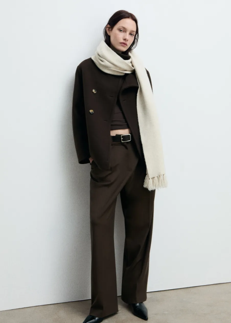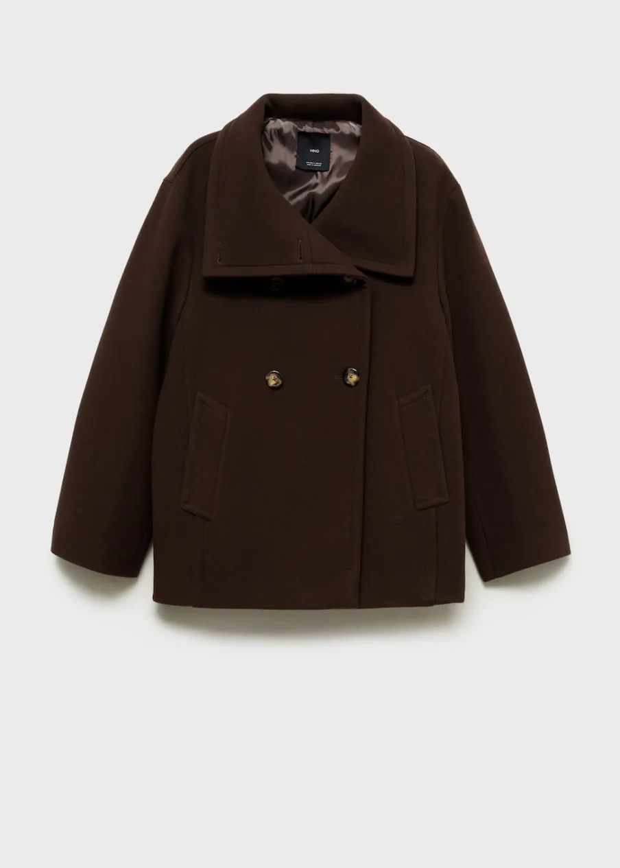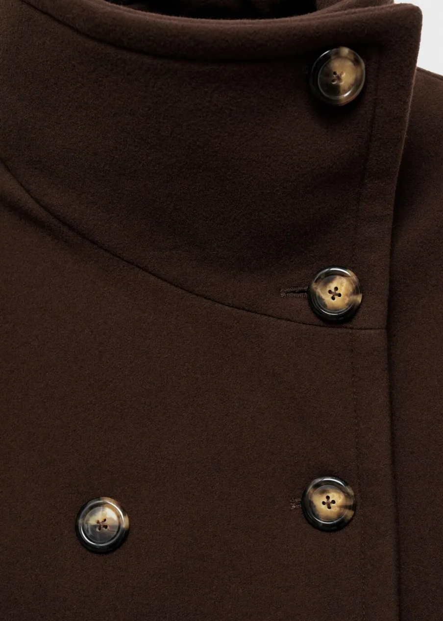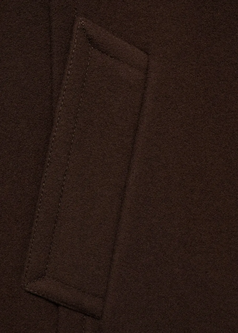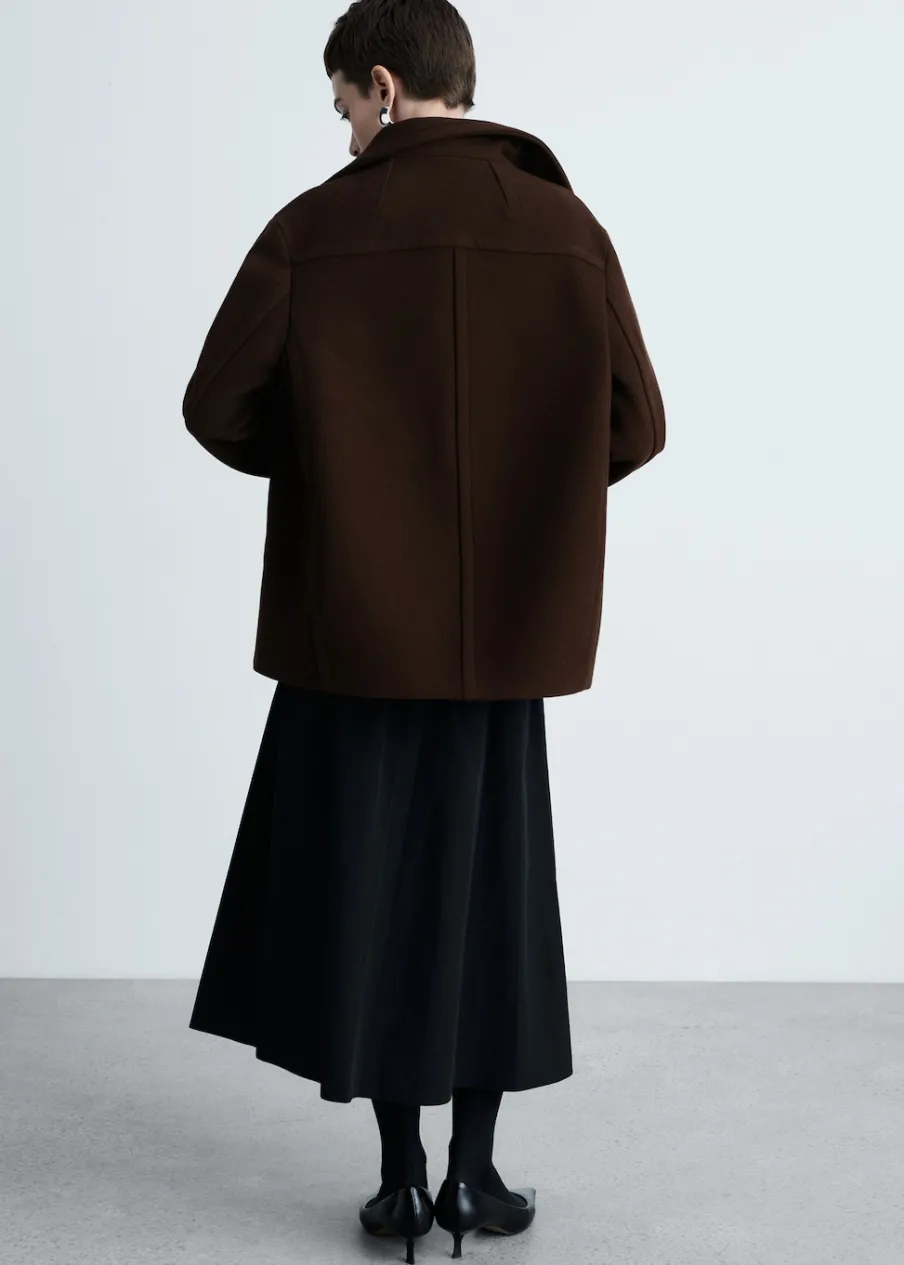 Zapięcie z przodu. Tkanina mieszanka wełny. Ciężka struktura. Model prosty. Fason o średniej długości. Kominowy kołnierz. Długi rękaw. Dwie wpuszczane kieszenie boczne. Dwurzędowe zapięcie. Tylko podszewka.
