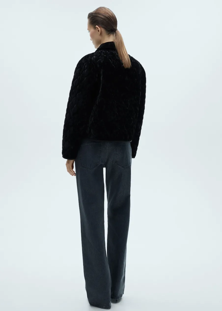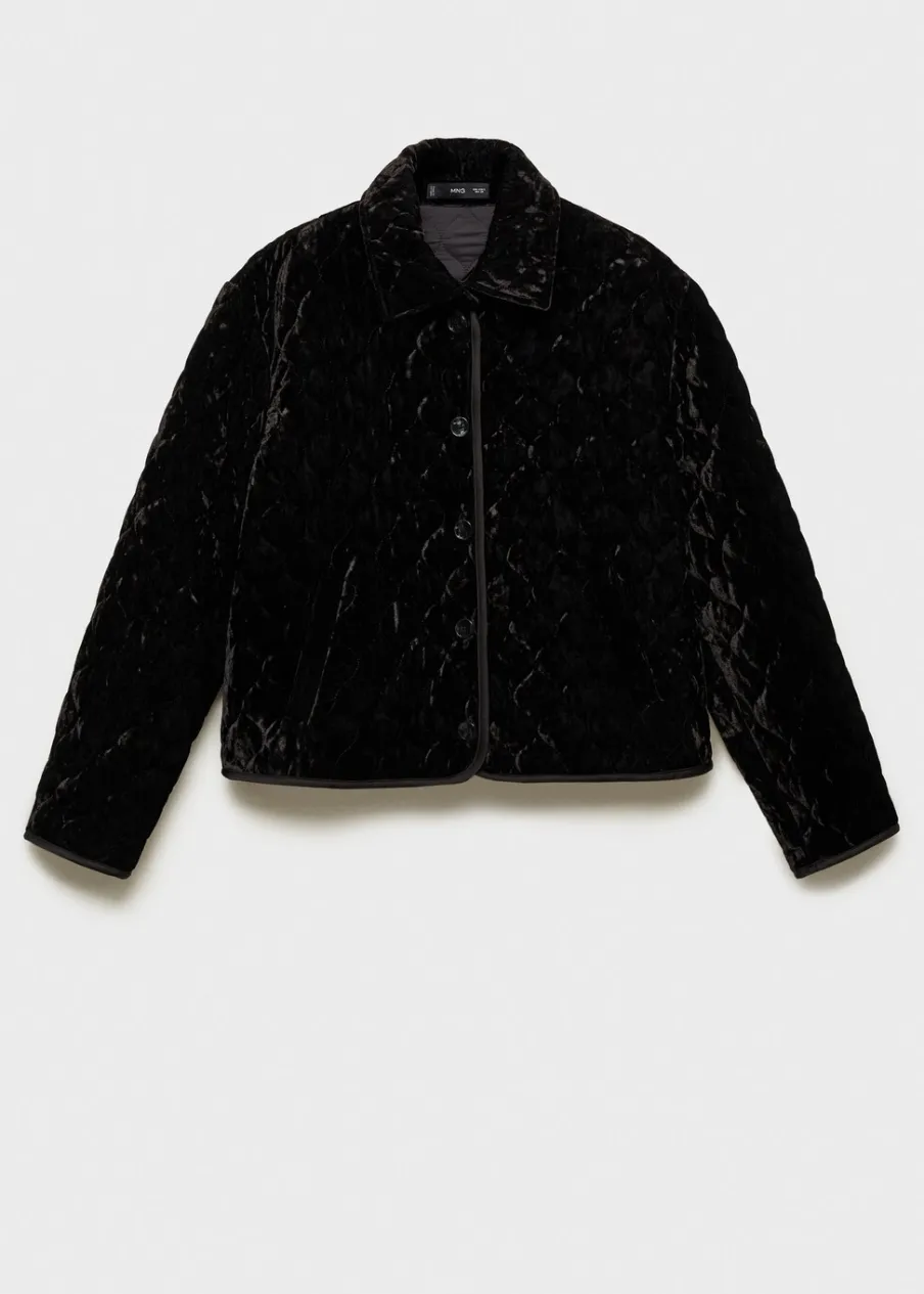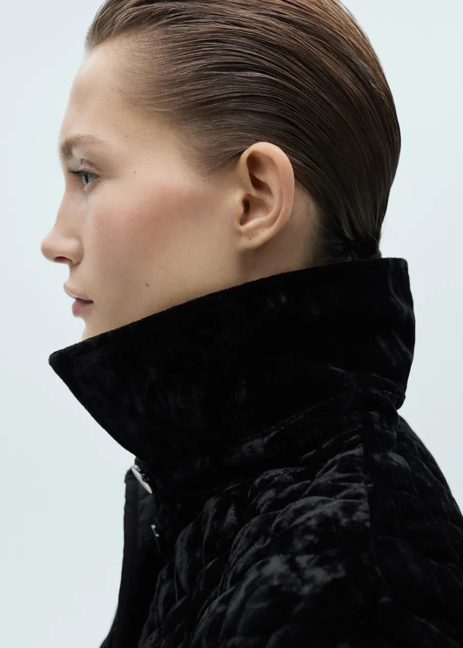 Model dwustronny. Aksamitna tkanina. Model prosty. Model pikowany. Kołnierz z klapami. Długi rękaw. Dwie kieszenie z wypustkami z przodu. Zapięcie z przodu na guziki. Wewnętrzna podszewka.