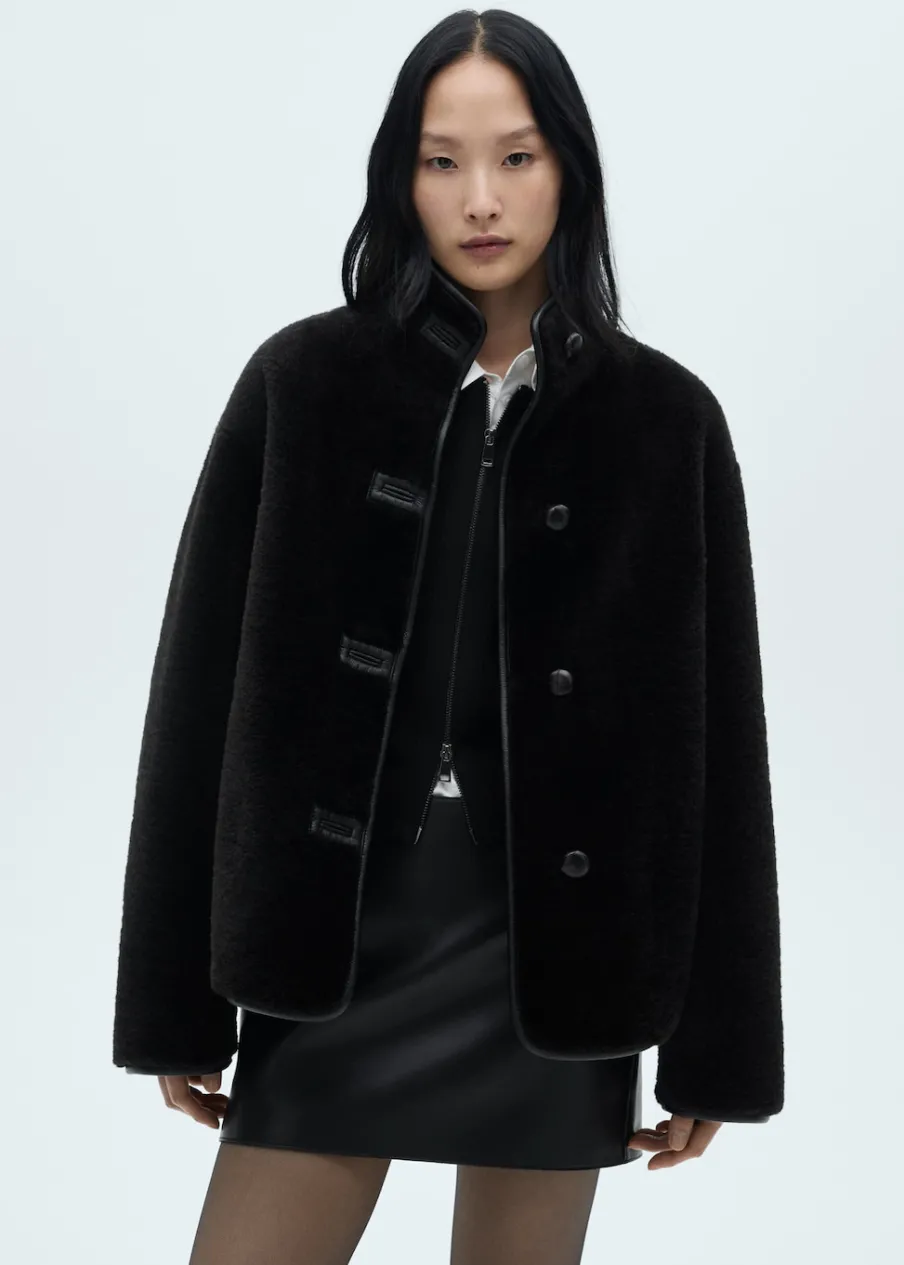 Szőrme, egyenes szabású modell, túlméretezett modell, magas gallér, hosszú ujj, két első zseb, gomb rögzítés, belső bélés.