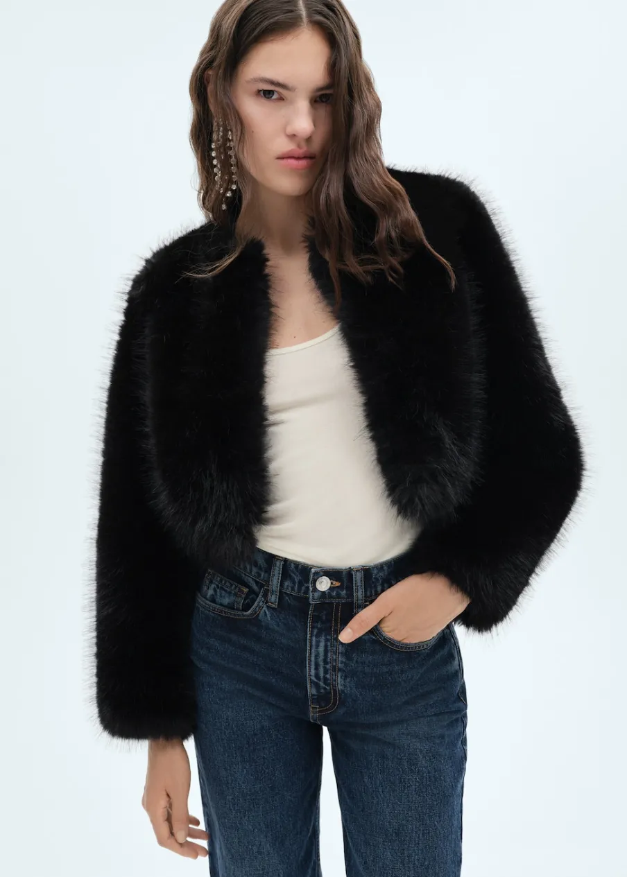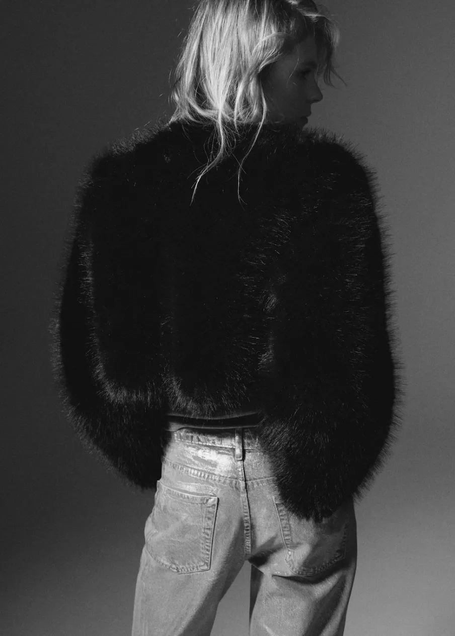 Model prosty. Krótki krój. Zapięcie z przodu na haftkę. Wewnętrzna podszewka. Kolekcja wizytowa. Modelka ma 178 cm wzrostu i nosi rozmiar S/36. Włochata tekstura. Długi rękaw.