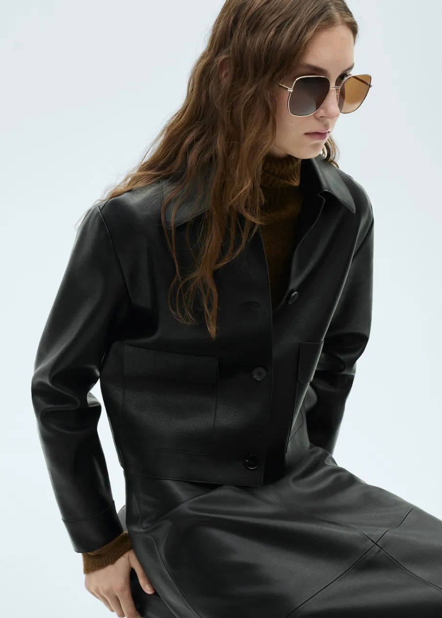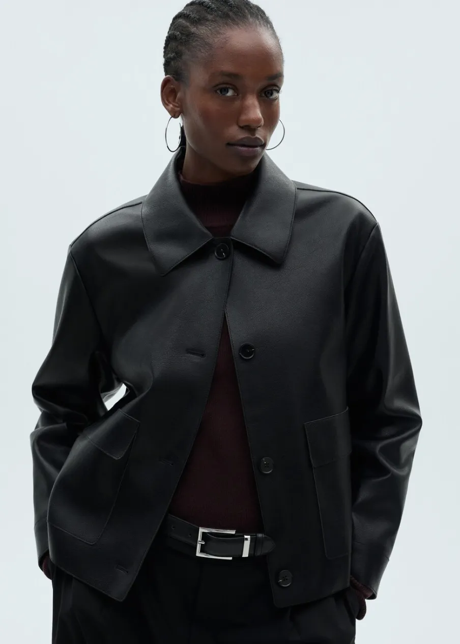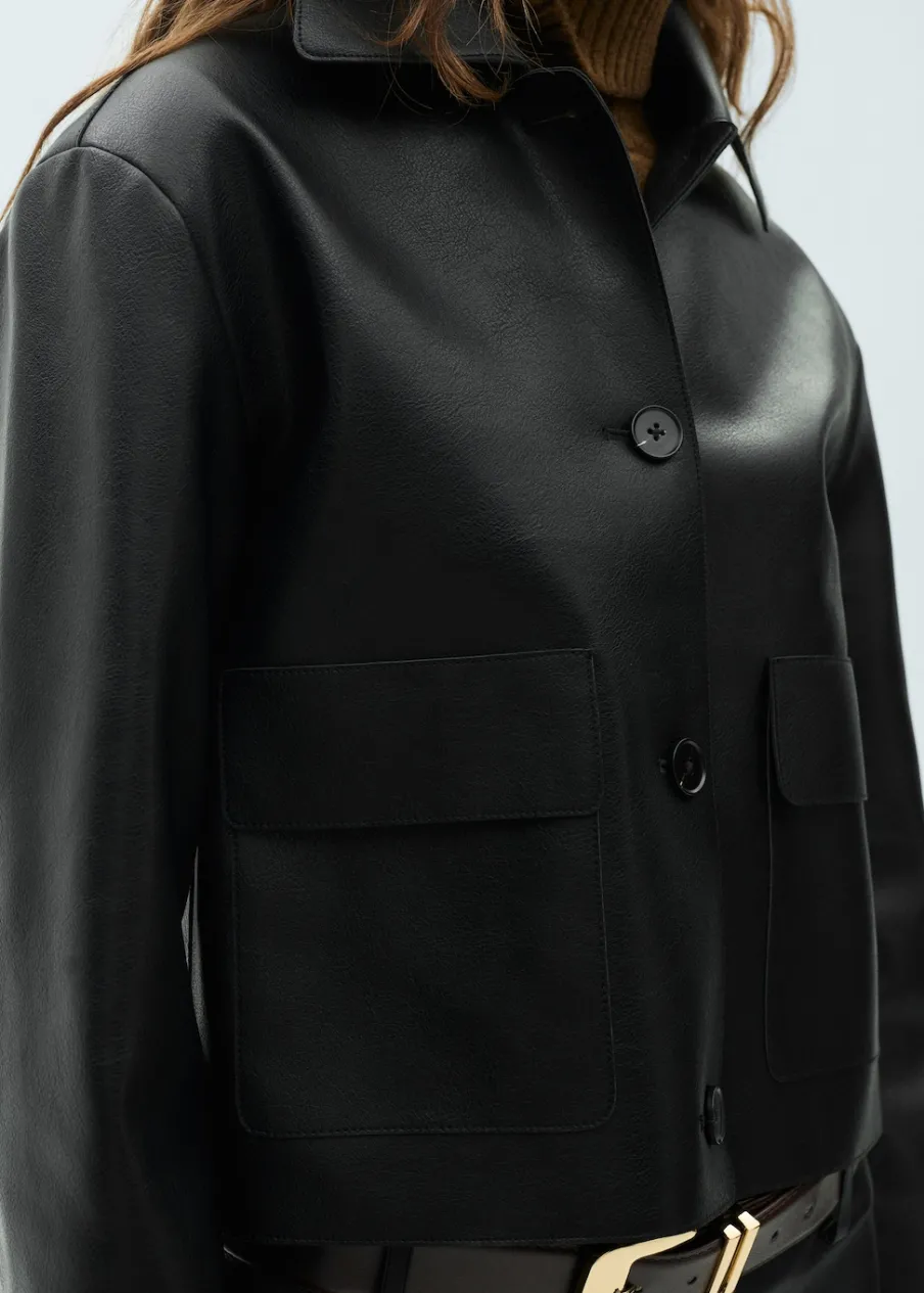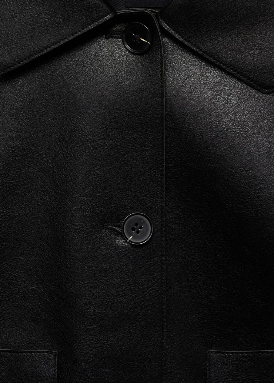 Efekt skóry. Krótki krój. Model prosty. Kołnierz z klapami. Długi rękaw. Dwie kieszenie nakładane z przodu. Zapięcie z przodu na guziki.