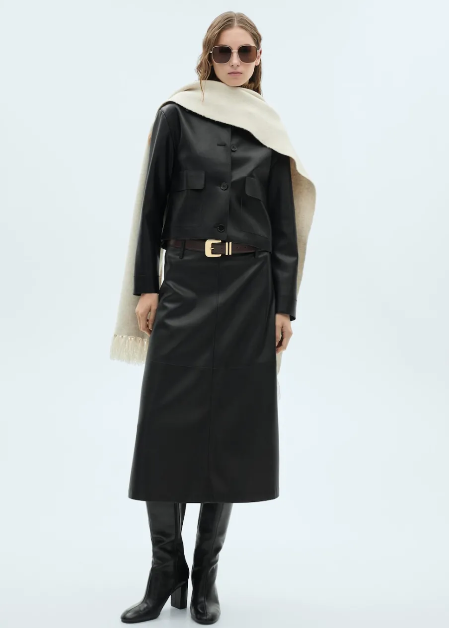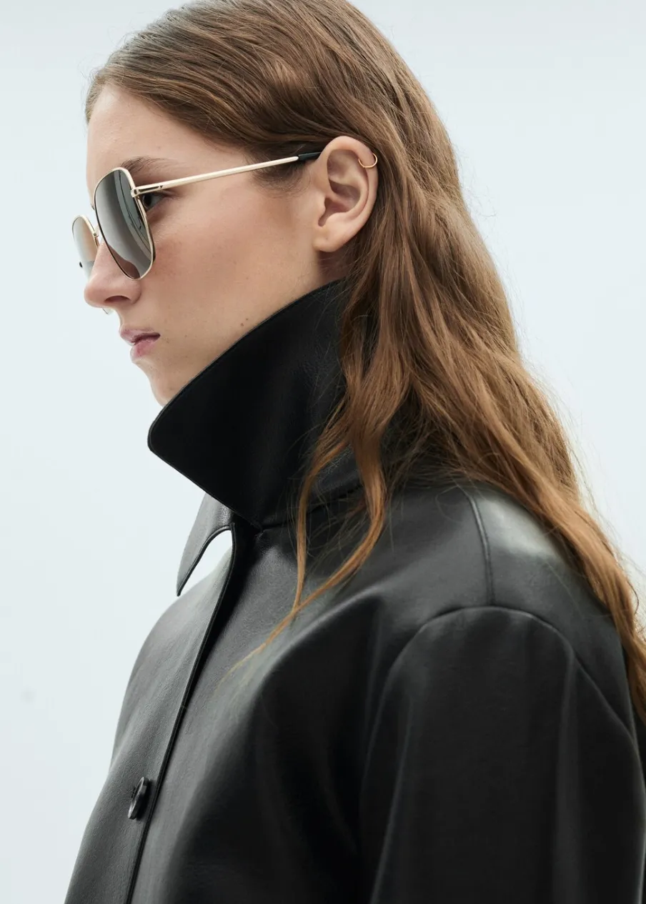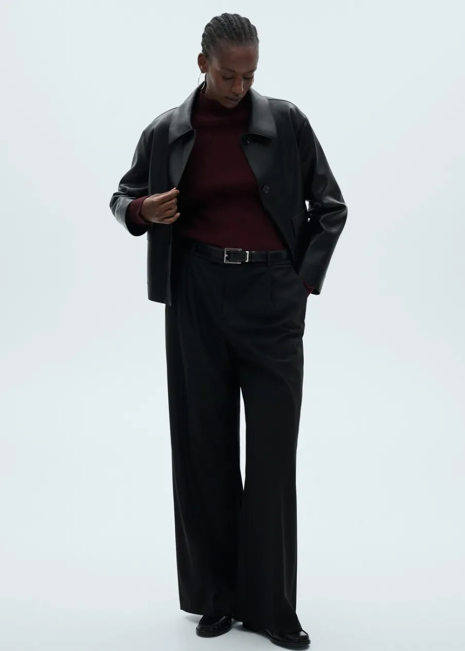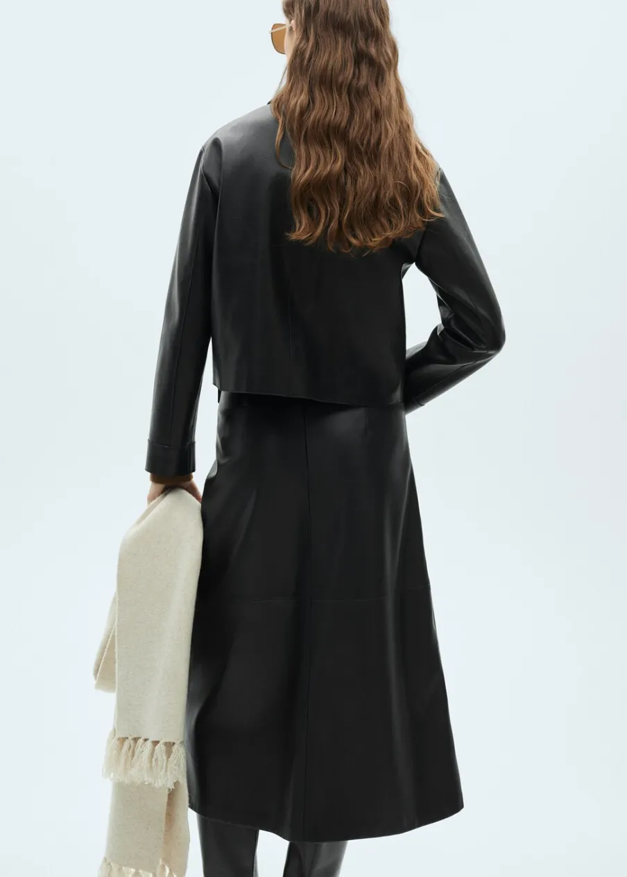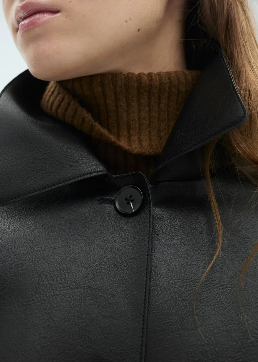Efekt skóry. Krótki krój. Model prosty. Kołnierz z klapami. Długi rękaw. Dwie kieszenie nakładane z przodu. Zapięcie z przodu na guziki.