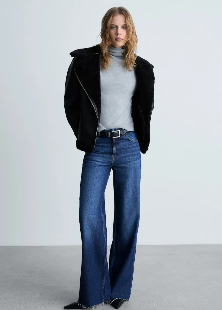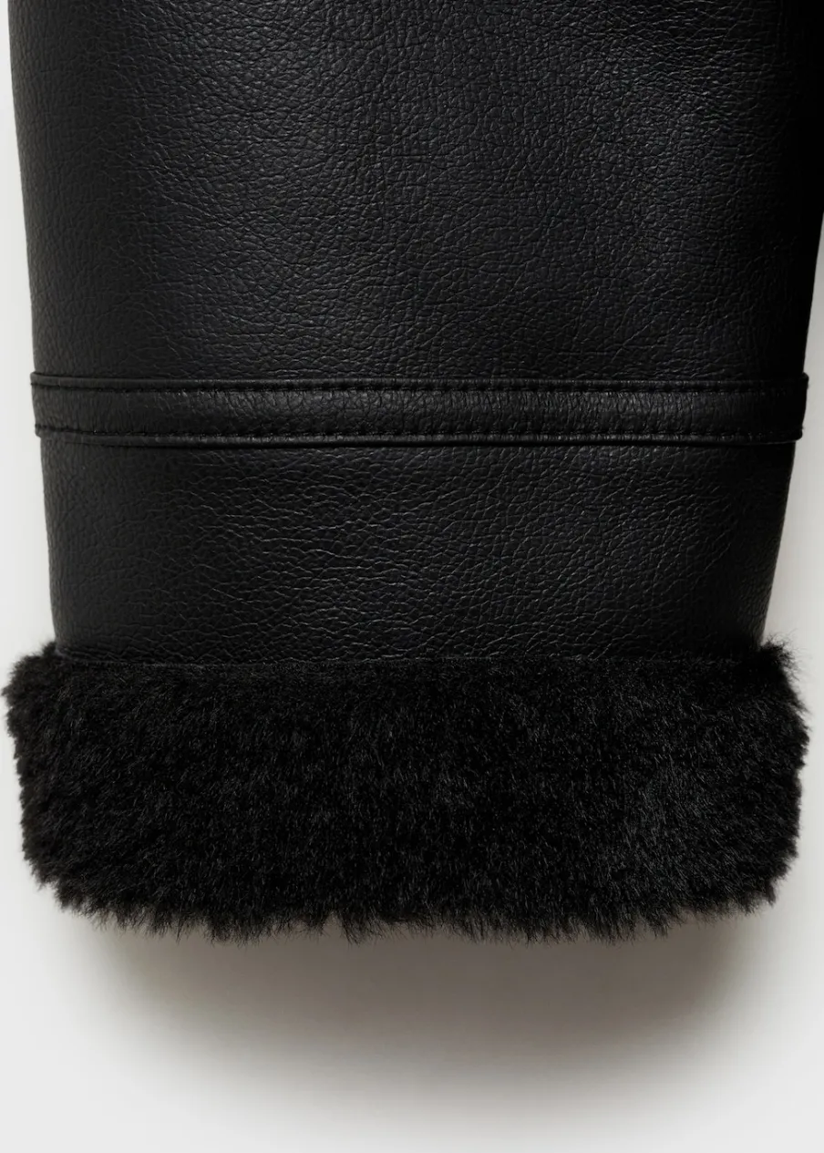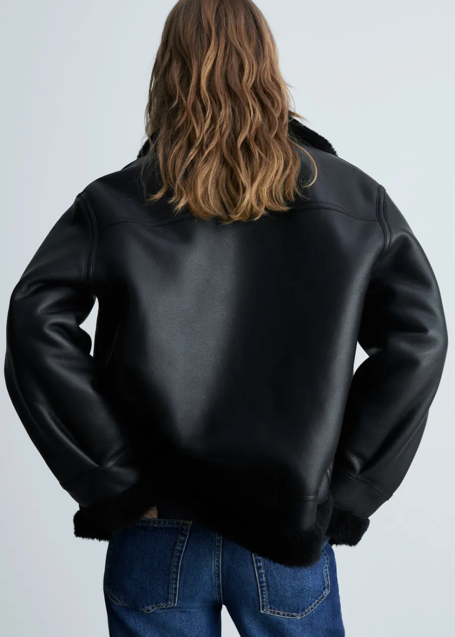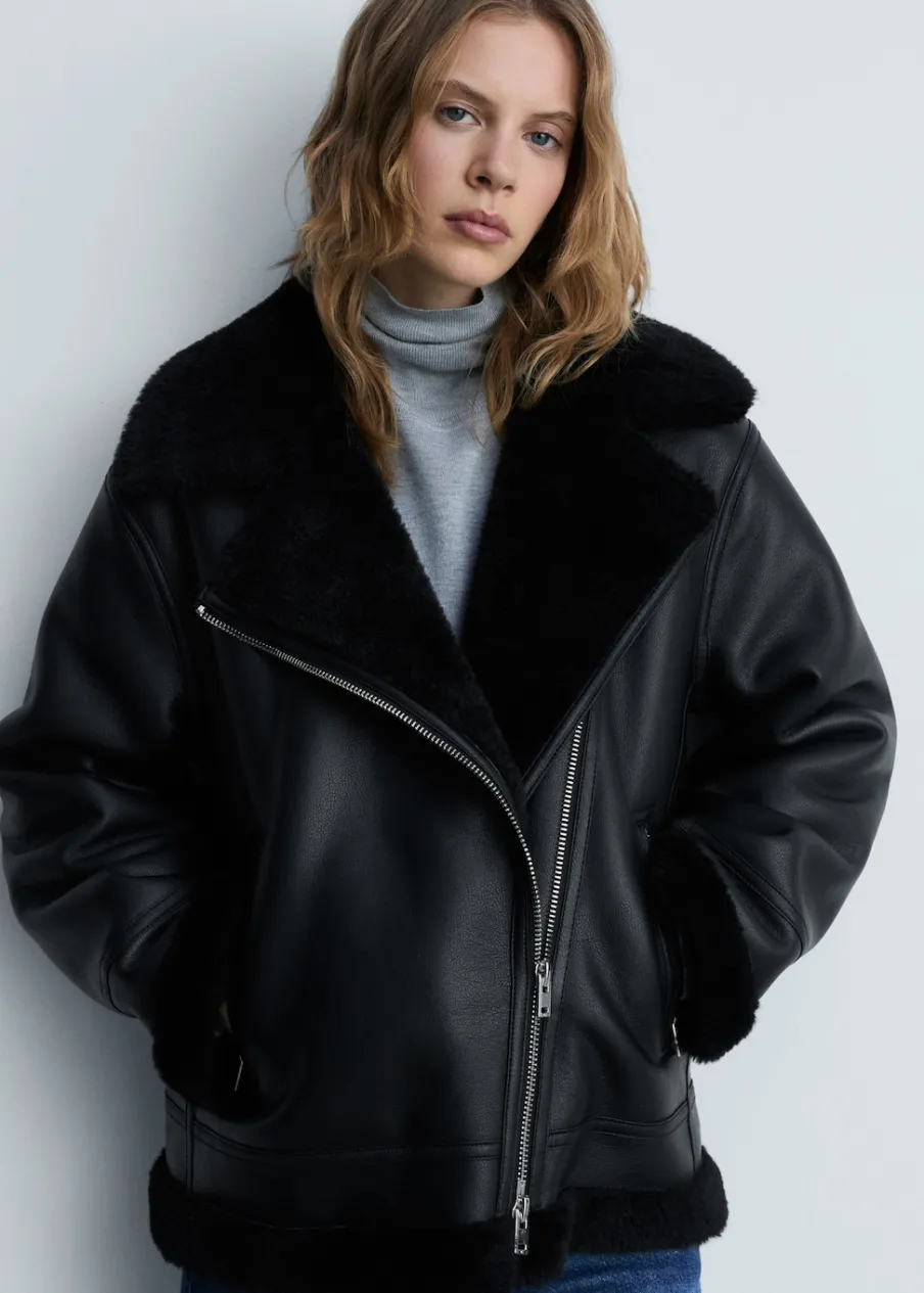 Efekt skóry. Ciężka struktura. Model dwustronny. Model biker. Model prosty. Kołnierz z klapami. Futrzany kołnierz. Długi rękaw. Zapięcie z przodu na suwak. Dwie kieszenie na zamek z boku. Futrzana podszewka z baranka. Wykończenia z baranka.