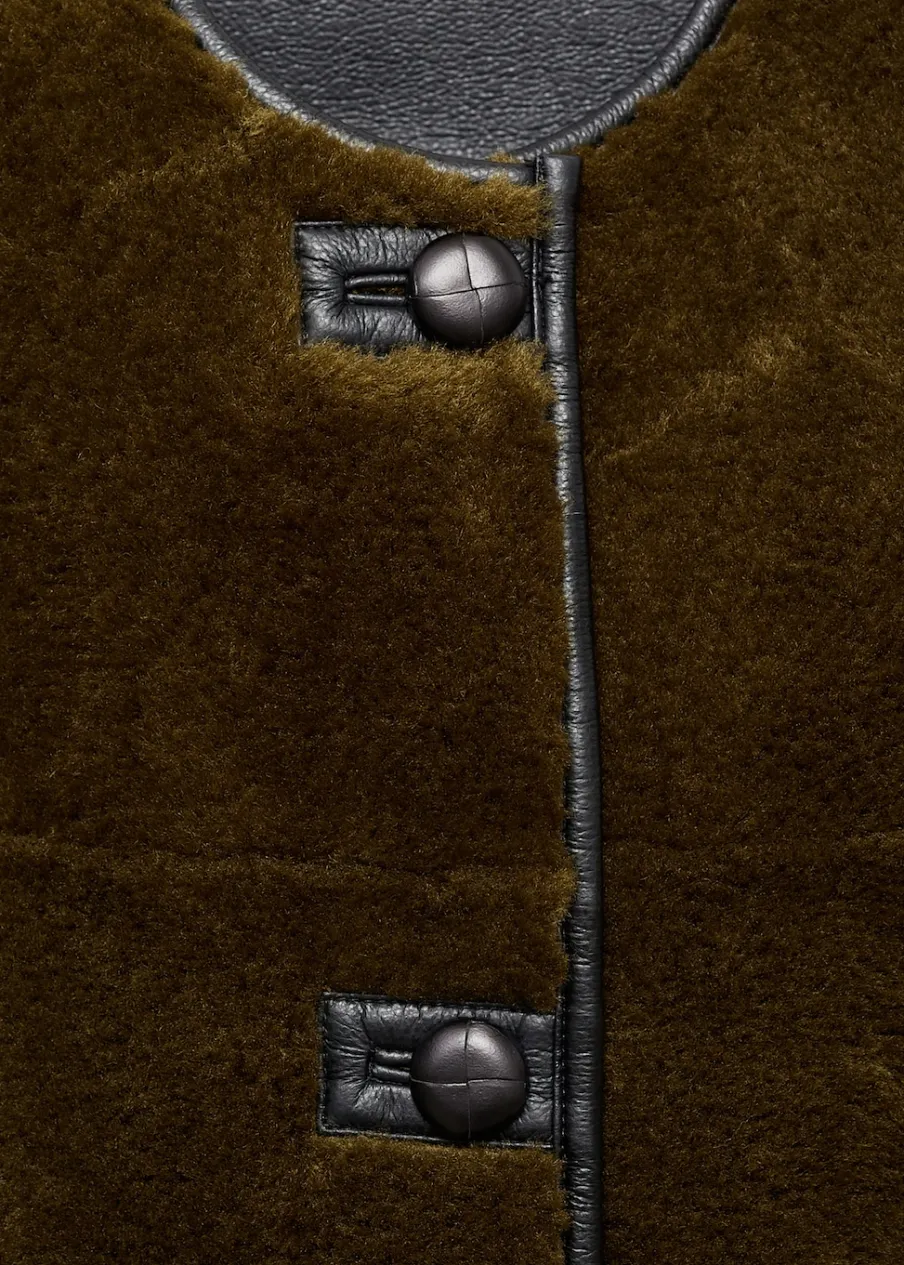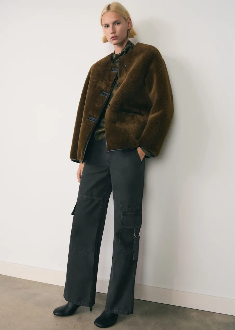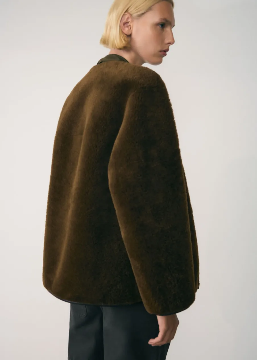 Tkanina efekt owczej skóry. Model prosty. Model oversize. Okrągły dekolt. Długi rękaw. Dwie kieszenie z przodu. Zapięcie na guziki kołki. Kontrastowe lamówki. Wewnętrzna podszewka. Modelka ma 179 cm wzrostu i nosi rozmiar S/36.
