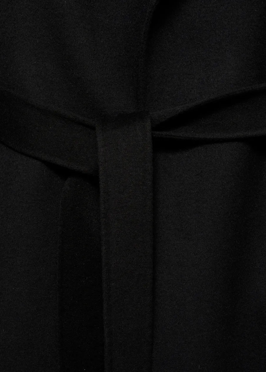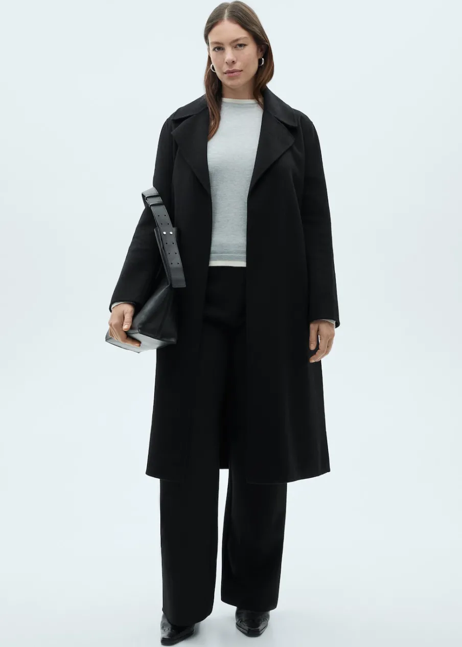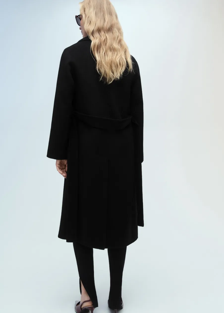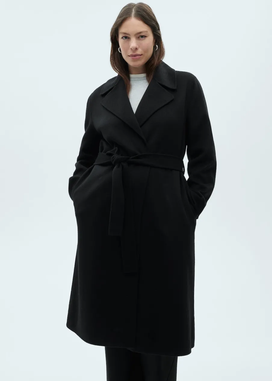 Újrahasznosított kevert gyapjú, túlméretezett modell, közepes dizájn, hajtókás V-nyak, hosszú ujj, két első zseb, levehető öv, hátul sliccelt alj, irodai lookok, a modell 1,81 cm magas és S/36 méretet visel.