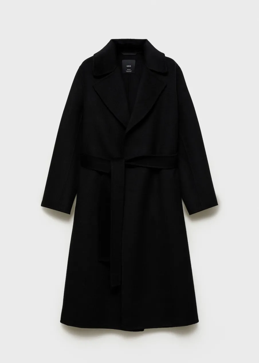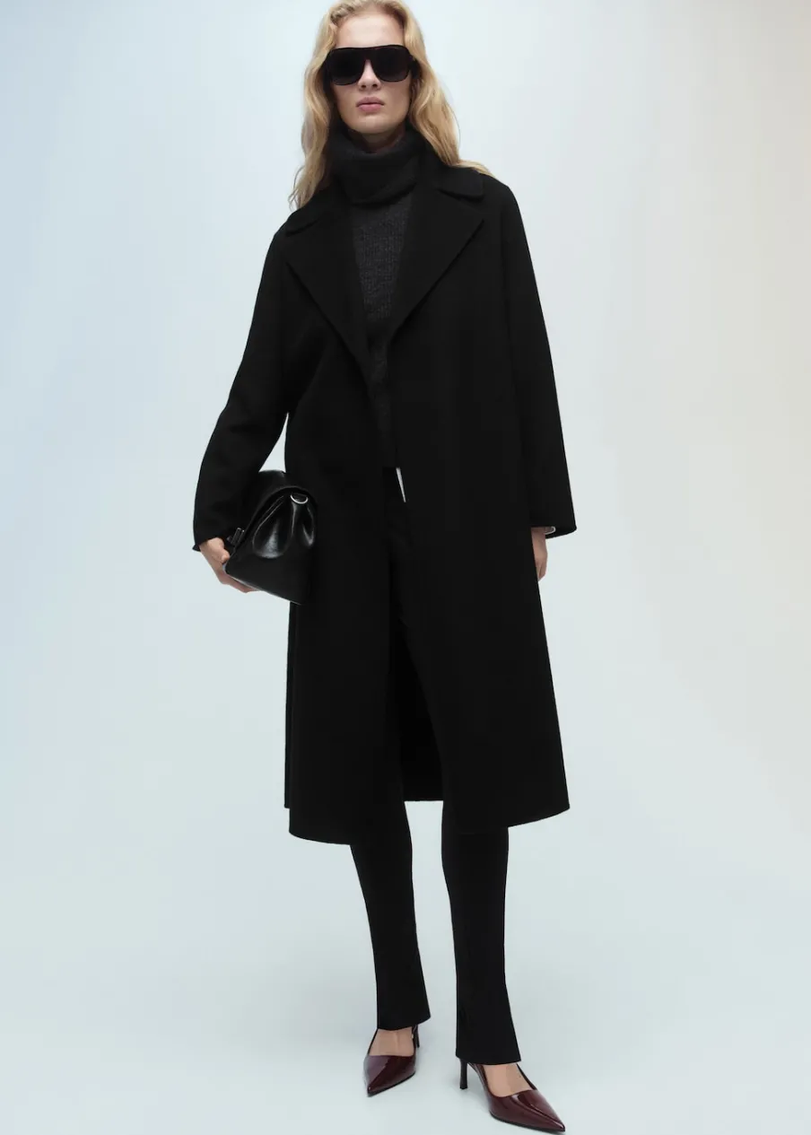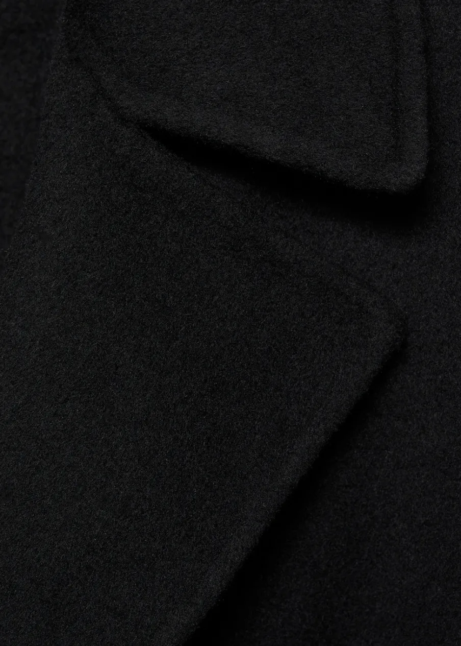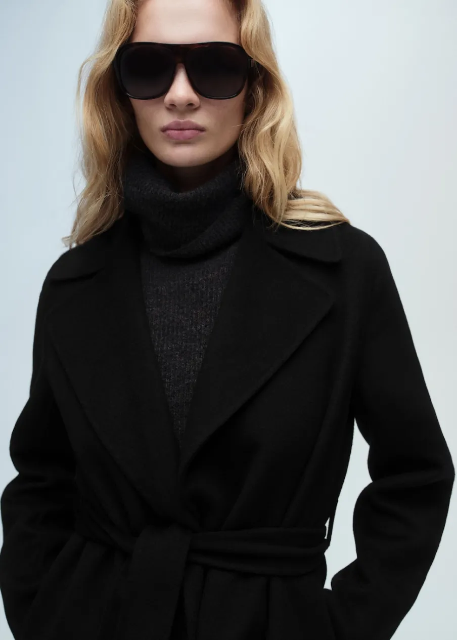 Újrahasznosított kevert gyapjú, túlméretezett modell, közepes dizájn, hajtókás V-nyak, hosszú ujj, két első zseb, levehető öv, hátul sliccelt alj, irodai lookok, a modell 1,81 cm magas és S/36 méretet visel.