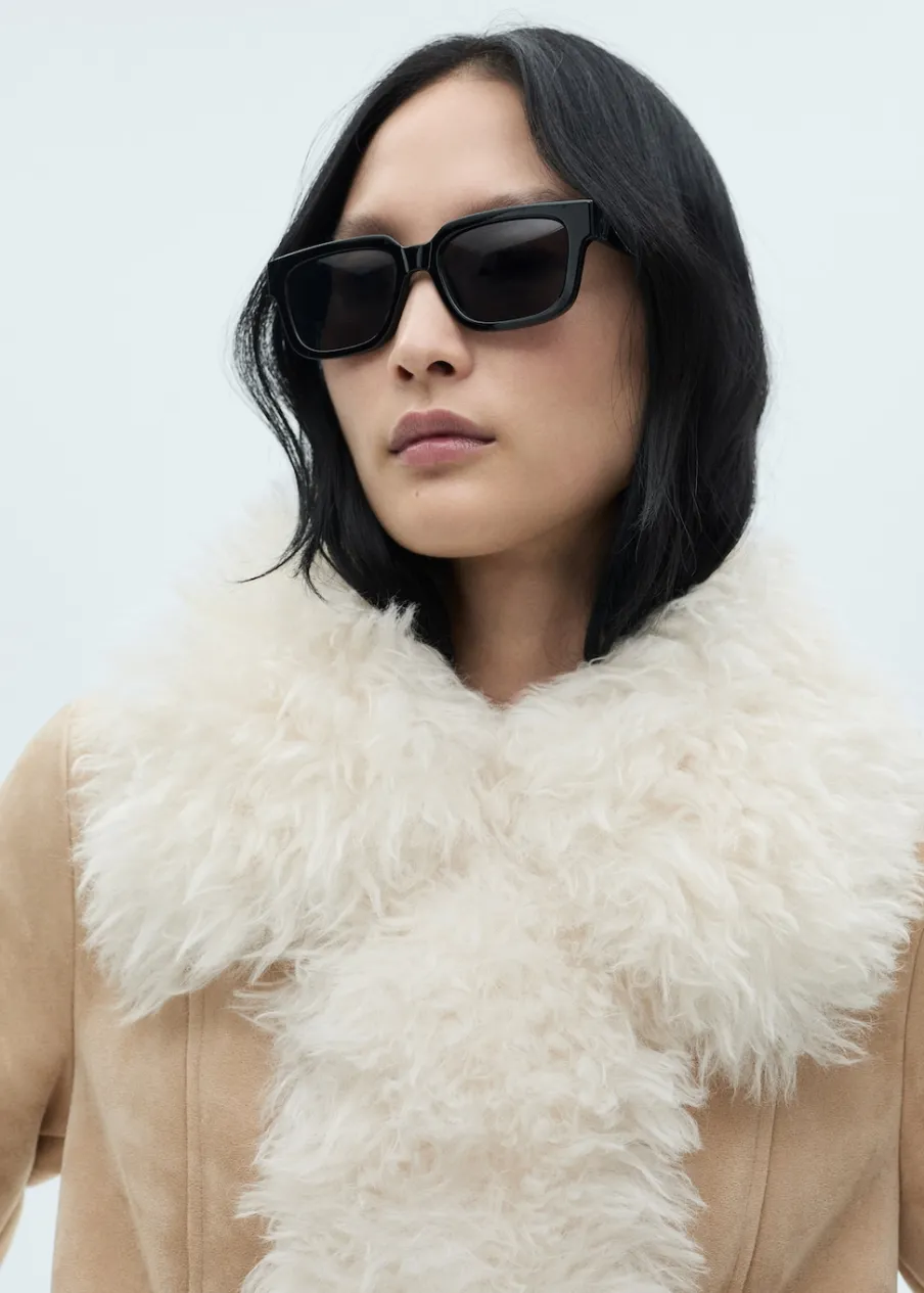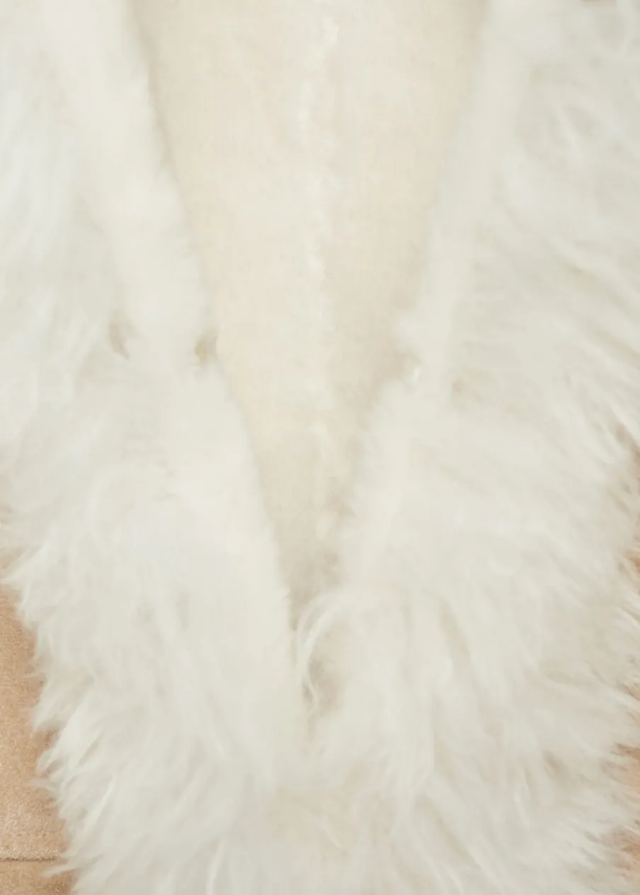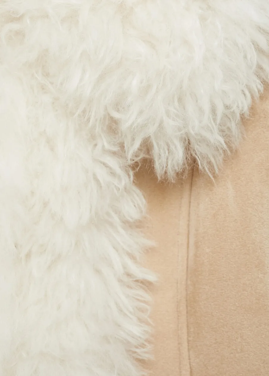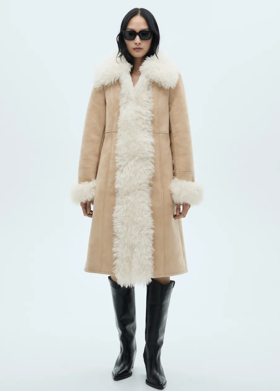 Ciężka struktura. Model dwustronny. Model długi. Model wcięty. Koszulowy kołnierz. Długi rękaw. Mankiety ze sztucznego futra. Bez zapięcia. Modelka ma 175 cm wzrostu i nosi rozmiar S/36.