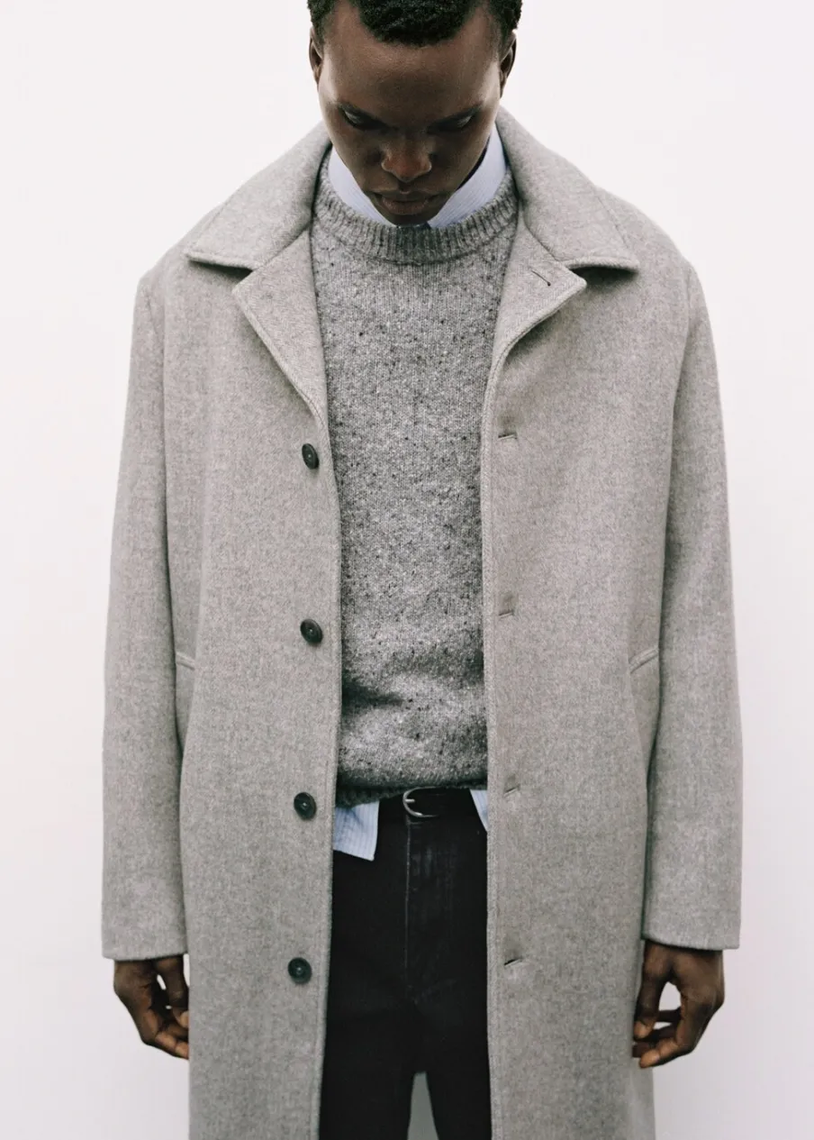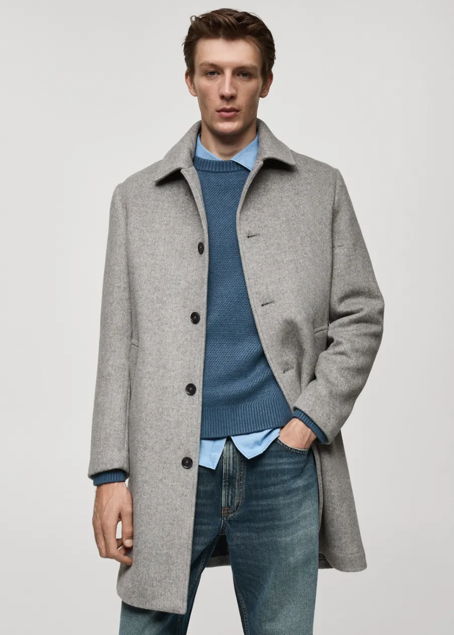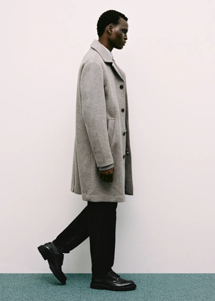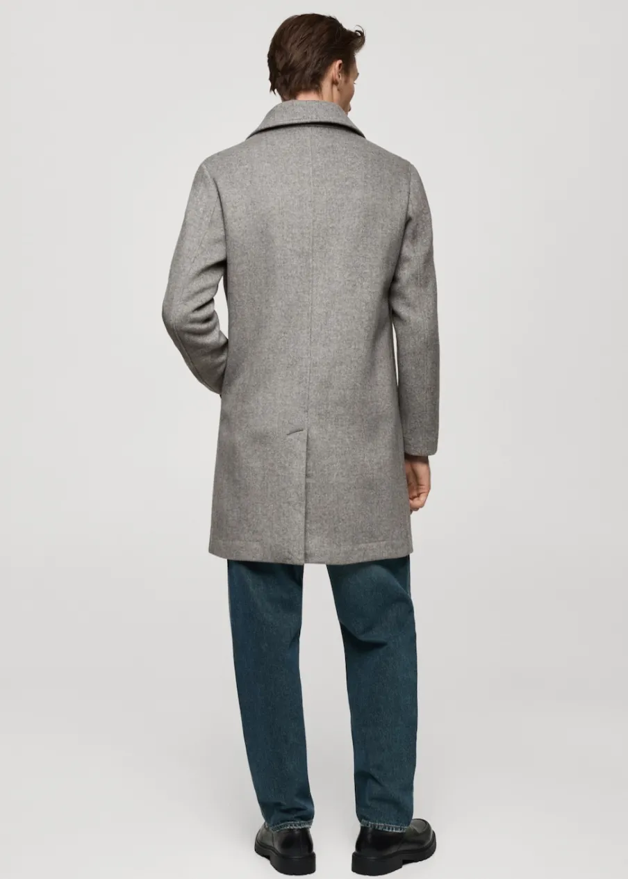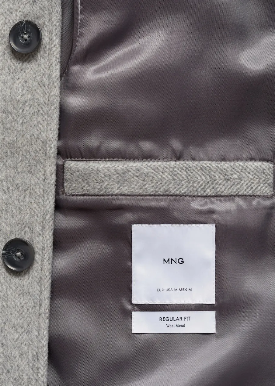 Tkanina mieszanka wełny. Krój regular. Jodełkowy deseń. Dwie kieszenie z wypustkami z przodu. Długi rękaw. Prosty dół. Wewnętrzna kieszeń. Wewnętrzna podszewka. Model ma 190 cm wzrostu i nosi rozmiar M. Z tyłu szlica z guzikiem. Klasyczny kołnierzyk. Zapięcie na guziki z przodu.