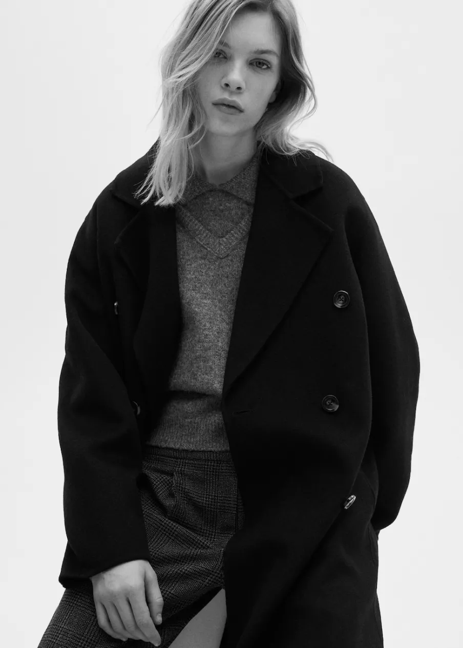 Długi rękaw. Ramiona z obniżonym szwem. Dwie kieszenie boczne. Dwurzędowe zapięcie. Rozcięcie z tyłu u dołu. Stylizacje biurowe. Tkanina z wełną. Wyrób ręczny. Model dwurzędowy. Model oversize. Model długi. Dekolt w szpic z kołnierzykiem. Klapy z nacięciem. Ciężka struktura. Zapięcie z przodu. Klapy. Bez podszewki.