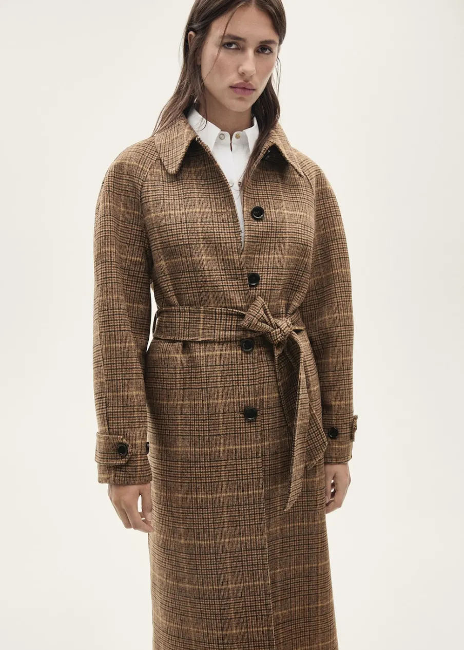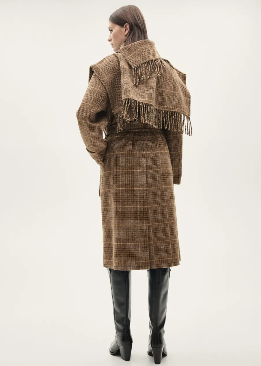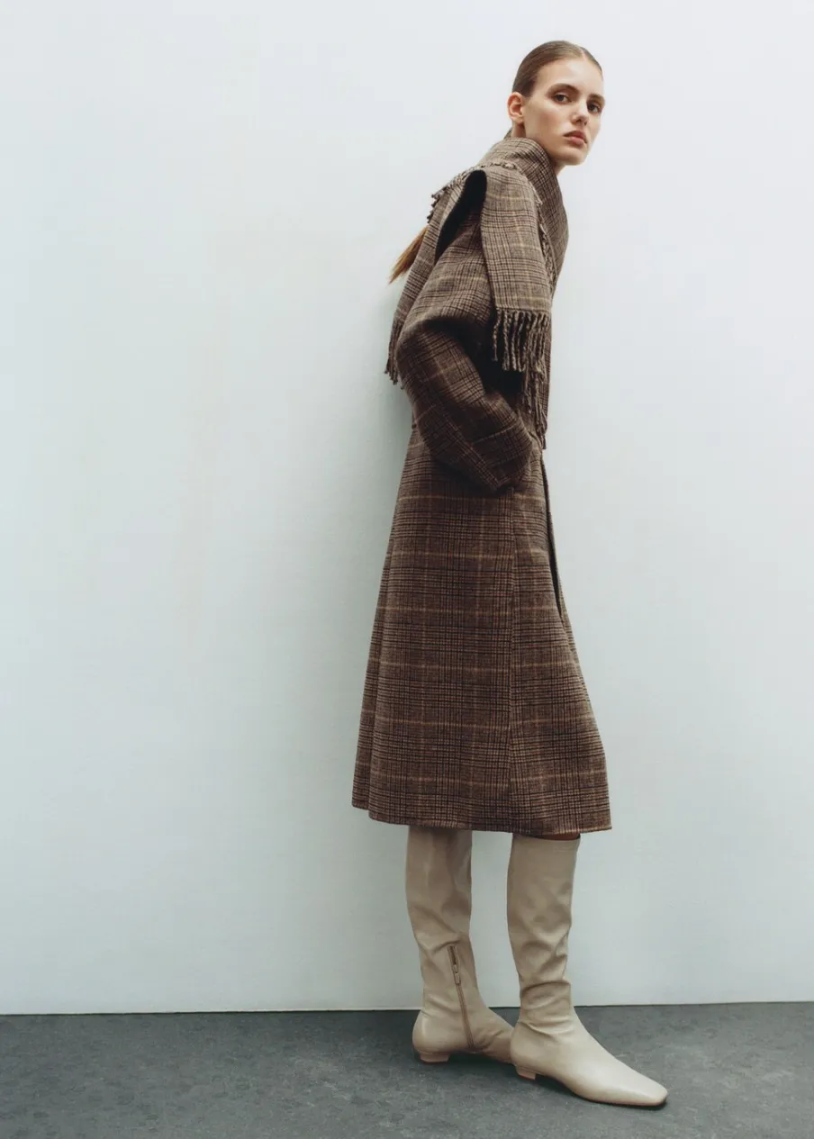 Koszulowy kołnierz. Ciężka struktura. Krój do kolan. Długi rękaw z zapięciem na guziki. Wiązanie w pasie. Odpinany szalik. Wewnętrzna podszewka. Tkanina mieszanka wełny. Model prosty. Zapięcie z przodu na guziki. Modelka ma 178 cm wzrostu i nosi rozmiar S/36.
