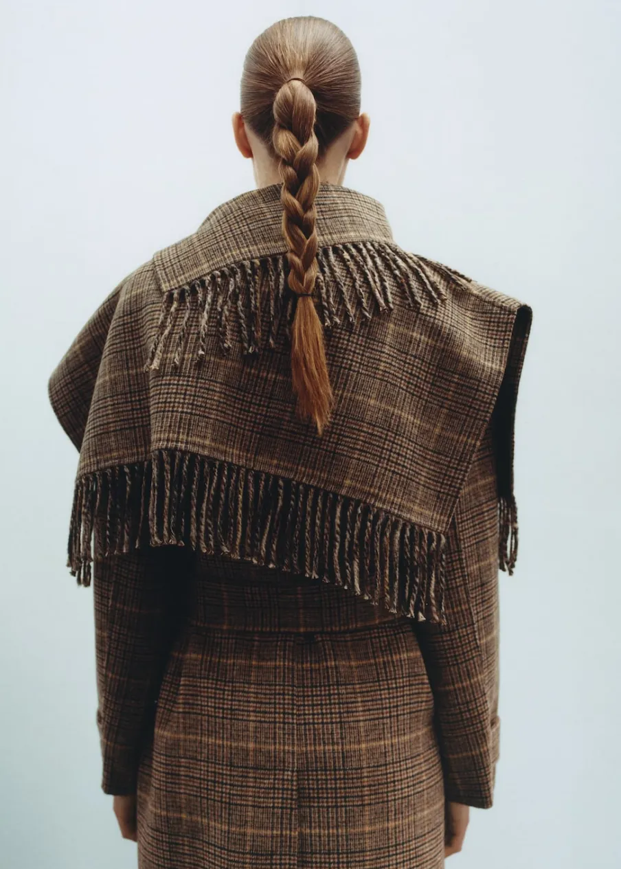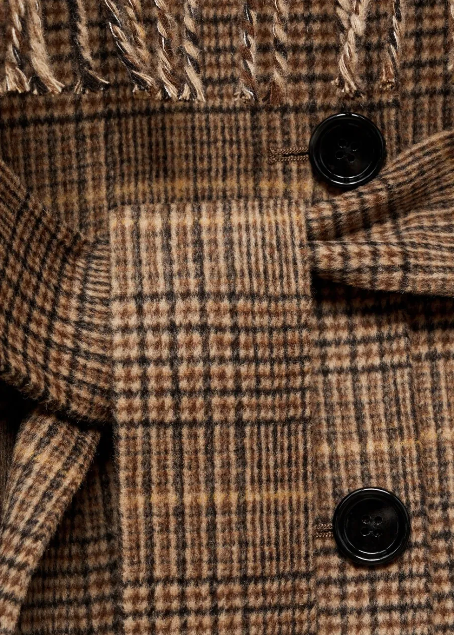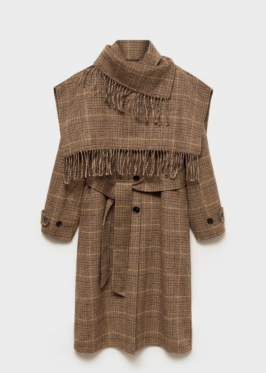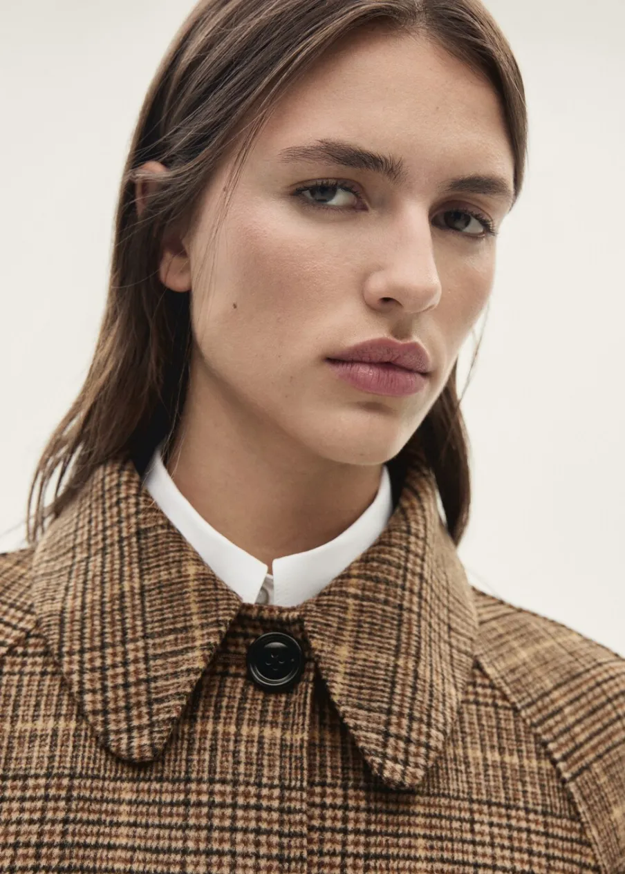 Koszulowy kołnierz. Ciężka struktura. Krój do kolan. Długi rękaw z zapięciem na guziki. Wiązanie w pasie. Odpinany szalik. Wewnętrzna podszewka. Tkanina mieszanka wełny. Model prosty. Zapięcie z przodu na guziki. Modelka ma 178 cm wzrostu i nosi rozmiar S/36.