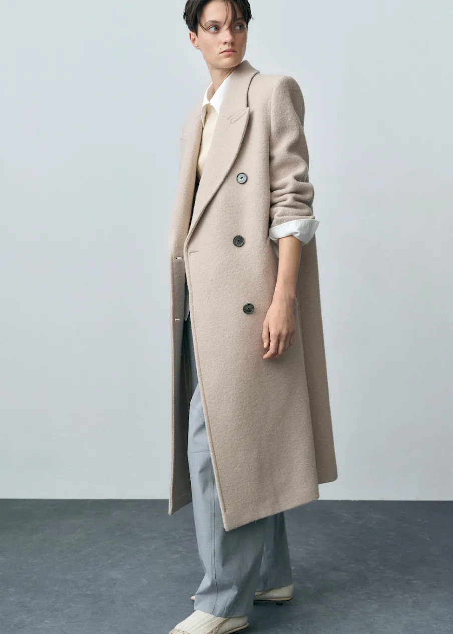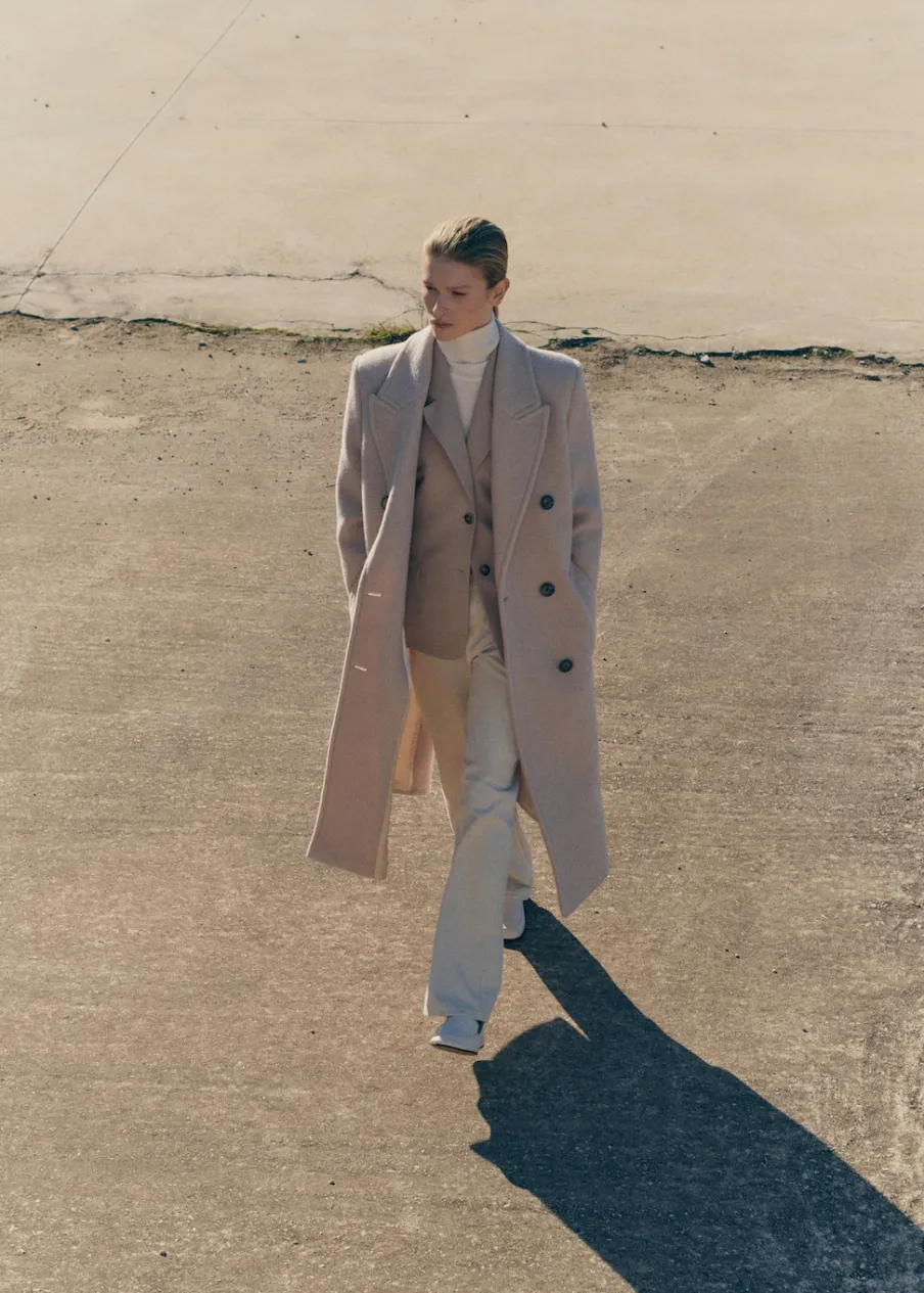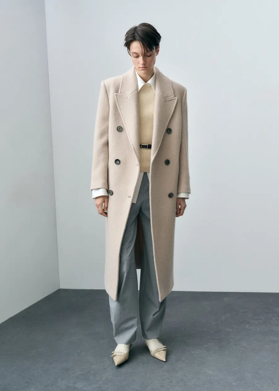 Tkanina z 100% wełny dziewiczej. Model strukturalny. Model długi. Wyraźne ramiona. Szeroki kołnierz z klapami. Klapy z nacięciem. Długi rękaw. Dwie wpuszczane kieszenie boczne. Dwurzędowe zapięcie. Rozcięcie z tyłu u dołu. Wewnętrzna podszewka.