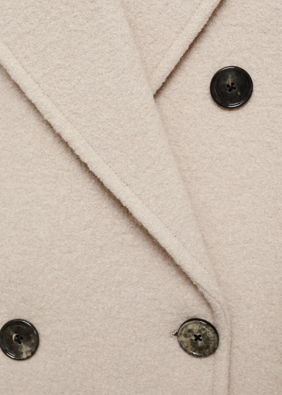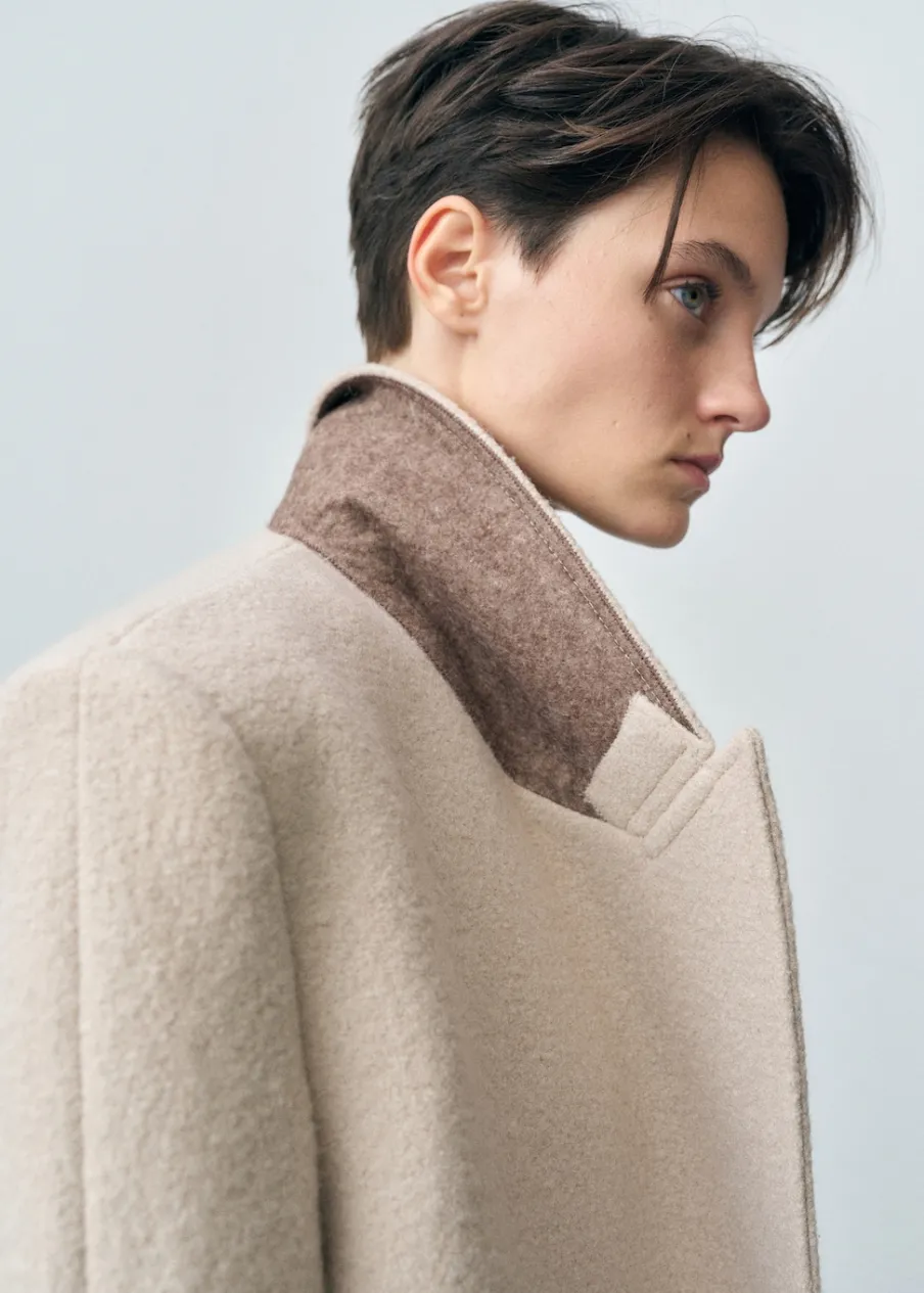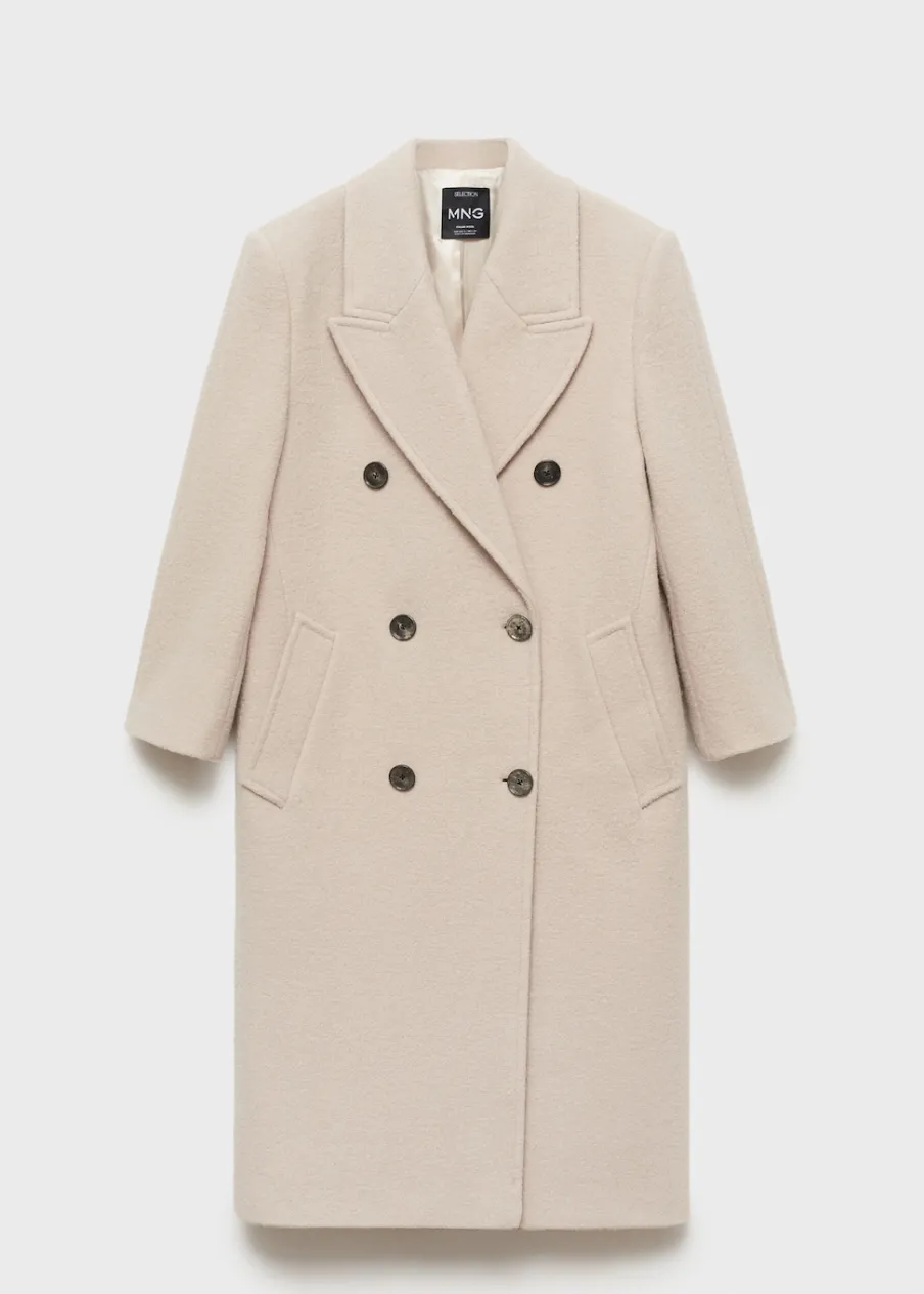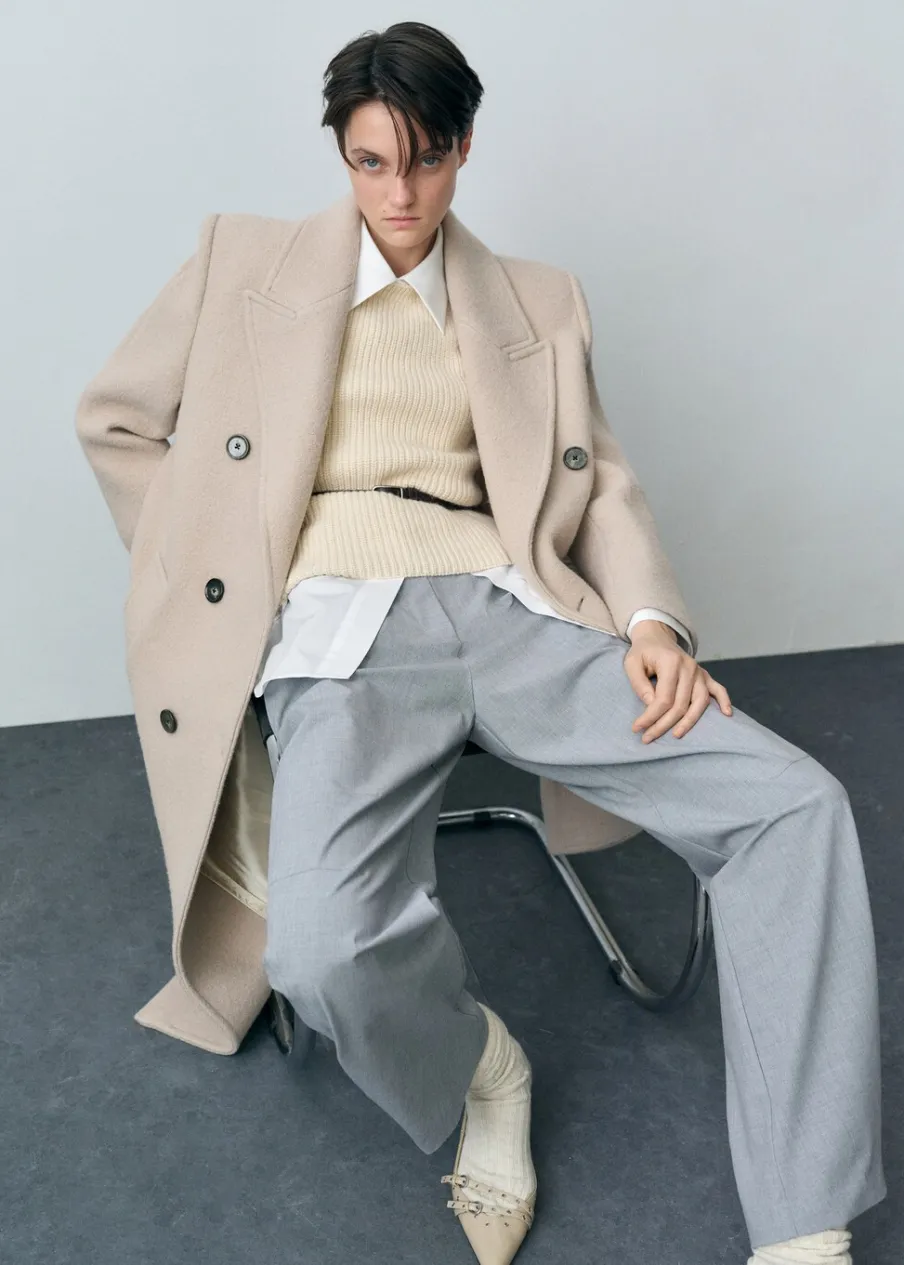 Tkanina z 100% wełny dziewiczej. Model strukturalny. Model długi. Wyraźne ramiona. Szeroki kołnierz z klapami. Klapy z nacięciem. Długi rękaw. Dwie wpuszczane kieszenie boczne. Dwurzędowe zapięcie. Rozcięcie z tyłu u dołu. Wewnętrzna podszewka.