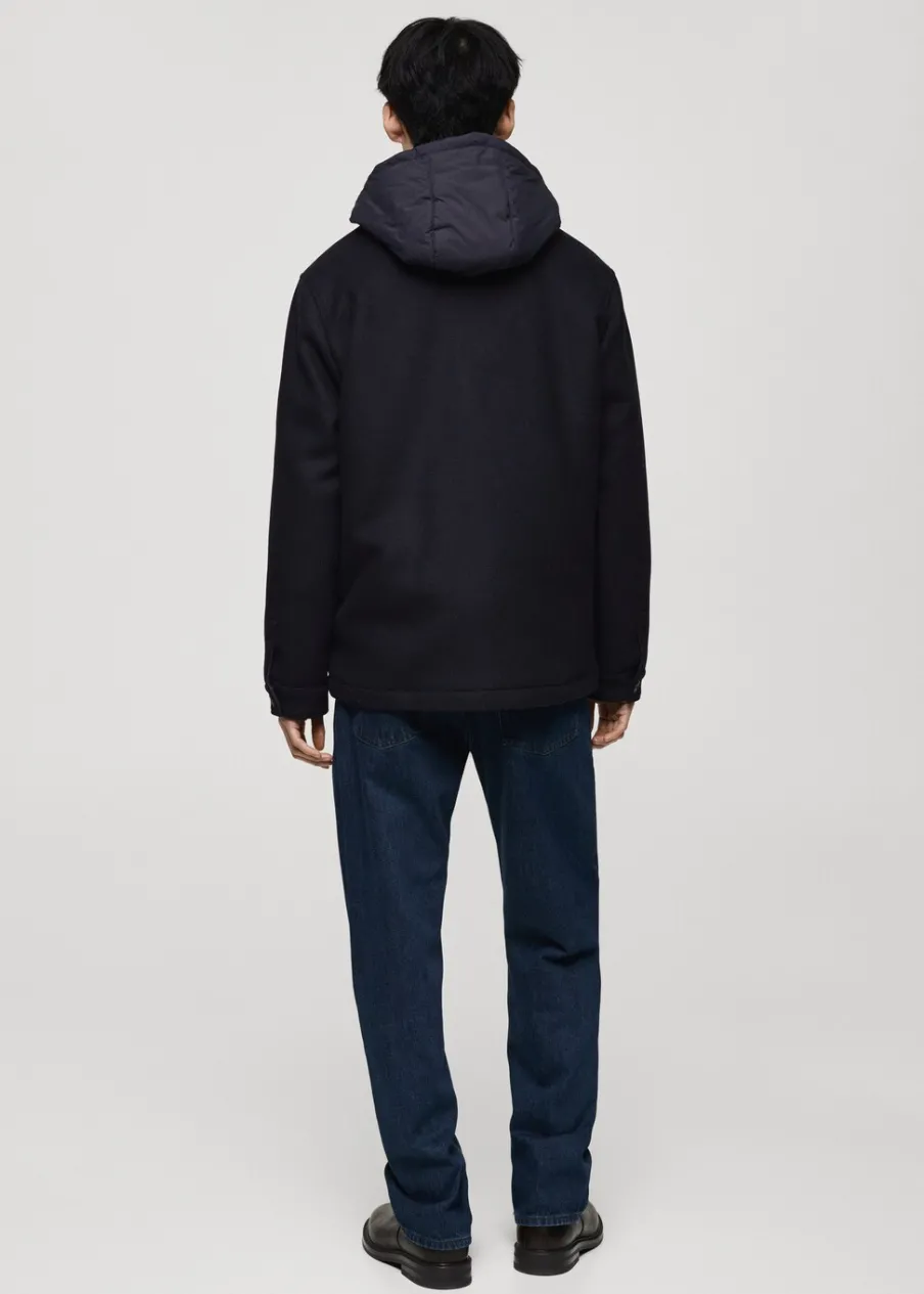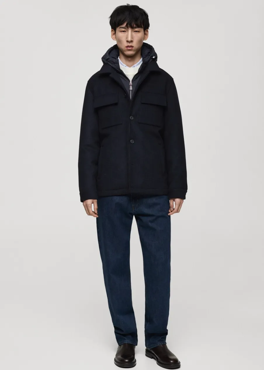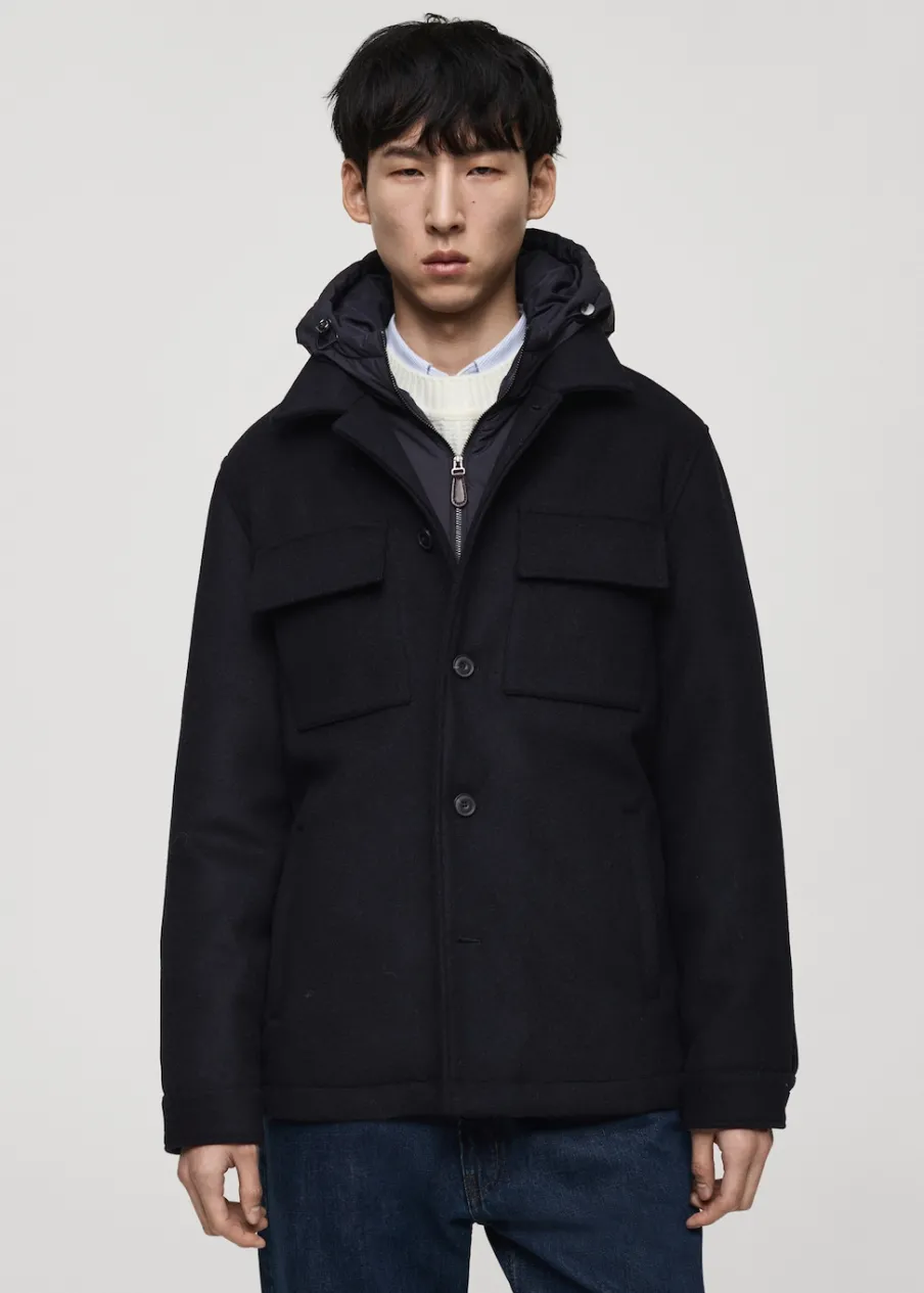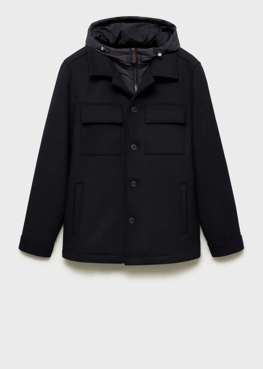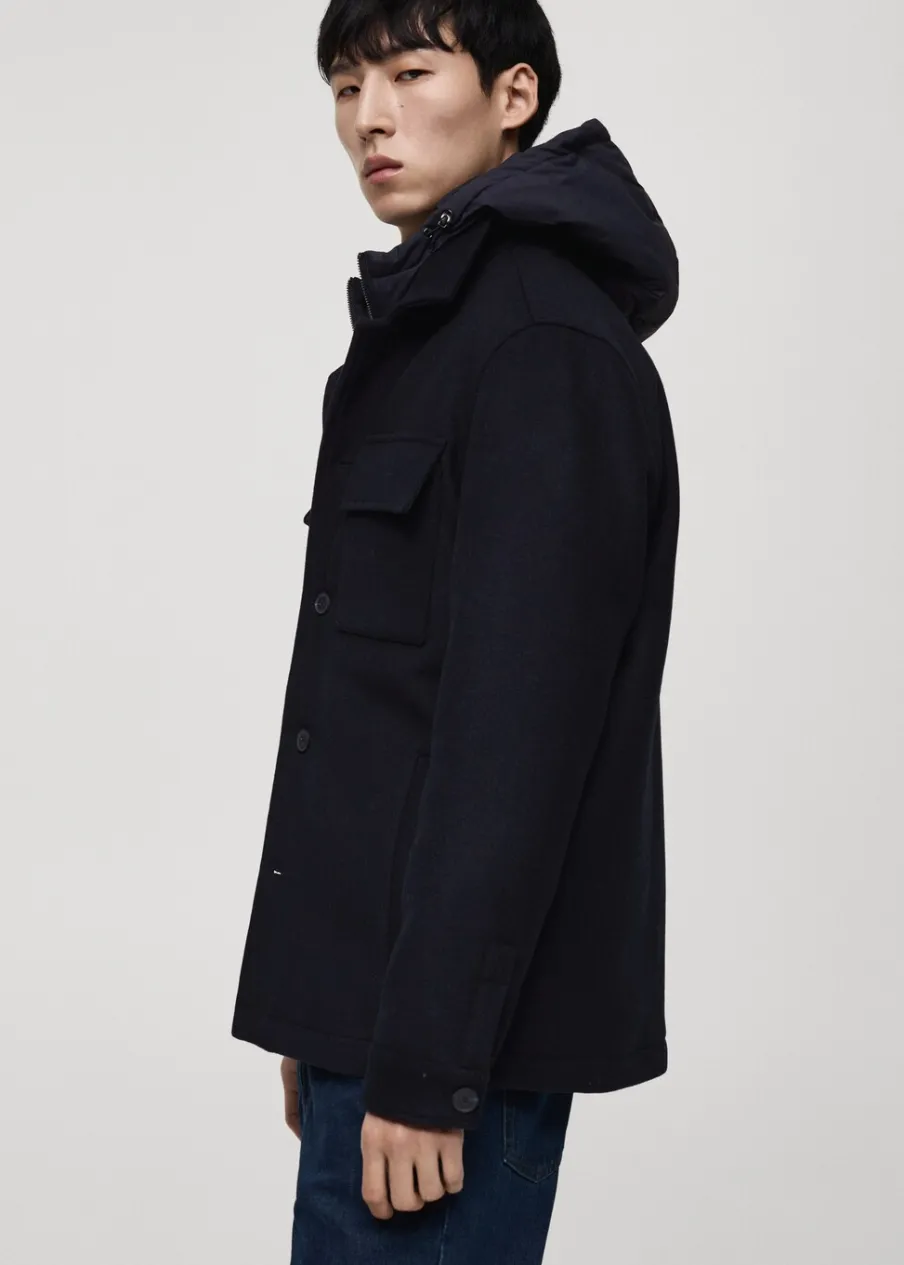 Koszulowy kołnierz. Odpinany kaptur. Dwie naszywane kieszenie z patkami na guzik z przodu. Dwie kieszenie boczne. Zapinane mankiety. Model ma 185 cm wzrostu i nosi rozmiar M. Wyłącznie online. Tkanina mieszanka wełny. Zapięcie na guziki. Wewnętrzna kieszeń.