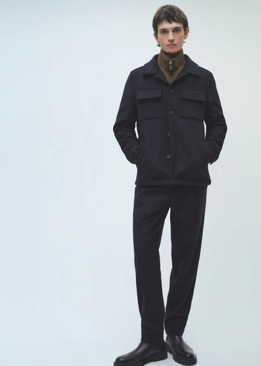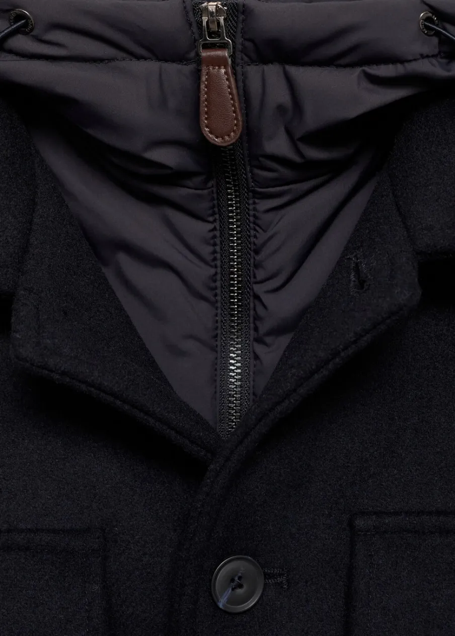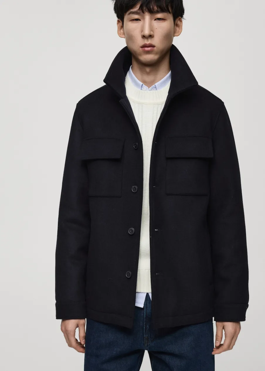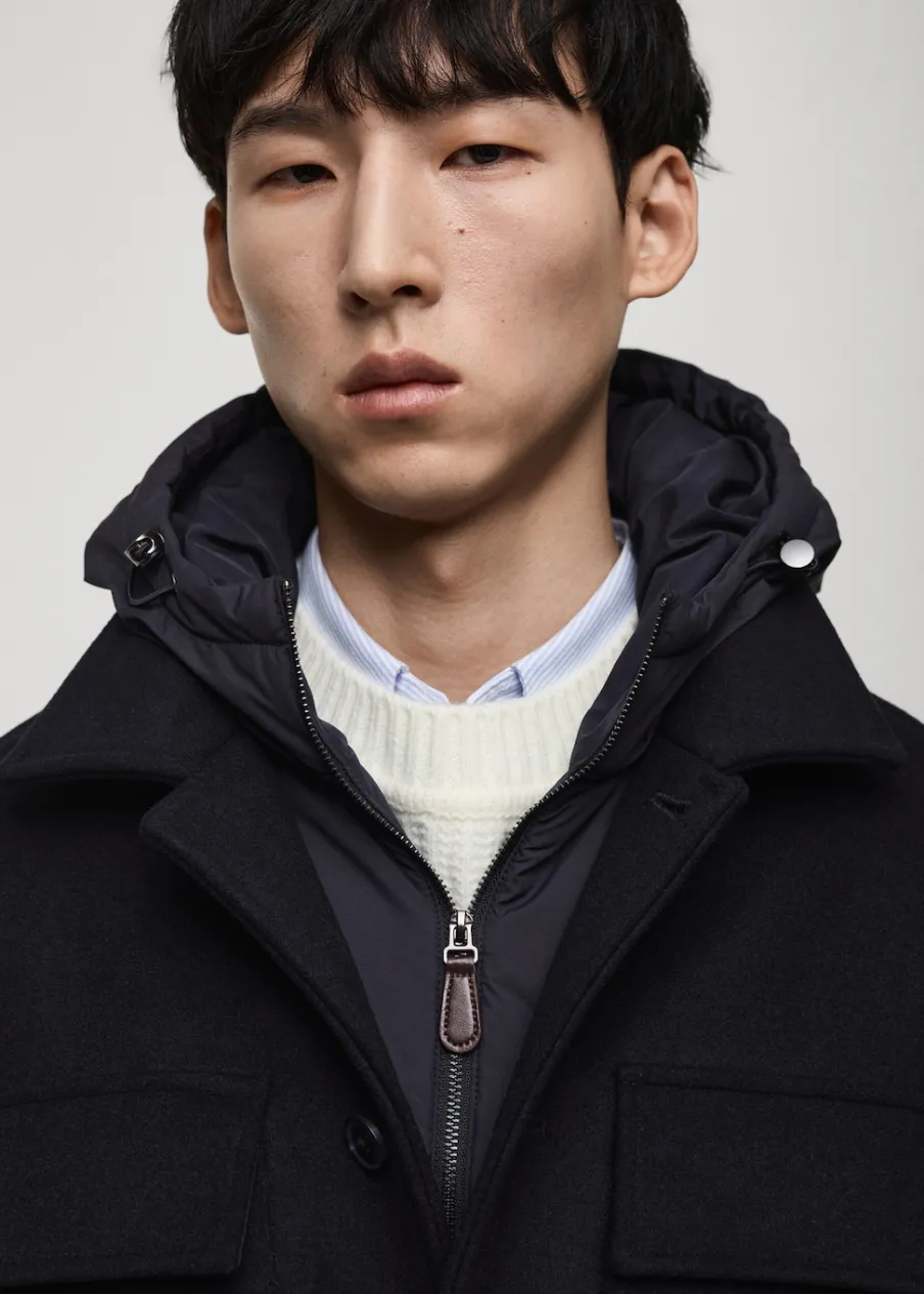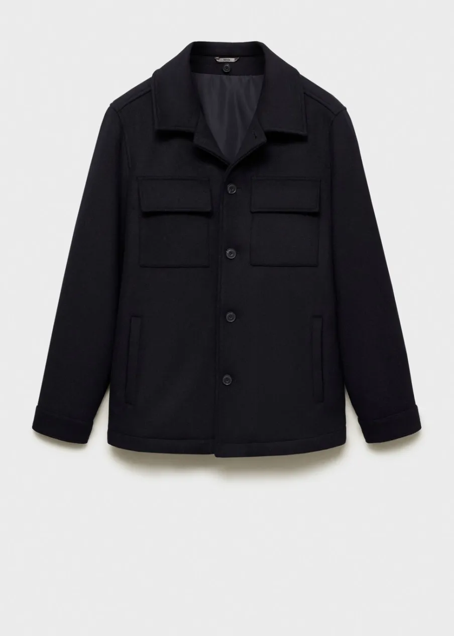Koszulowy kołnierz. Odpinany kaptur. Dwie naszywane kieszenie z patkami na guzik z przodu. Dwie kieszenie boczne. Zapinane mankiety. Model ma 185 cm wzrostu i nosi rozmiar M. Wyłącznie online. Tkanina mieszanka wełny. Zapięcie na guziki. Wewnętrzna kieszeń.