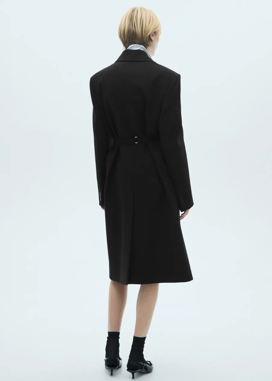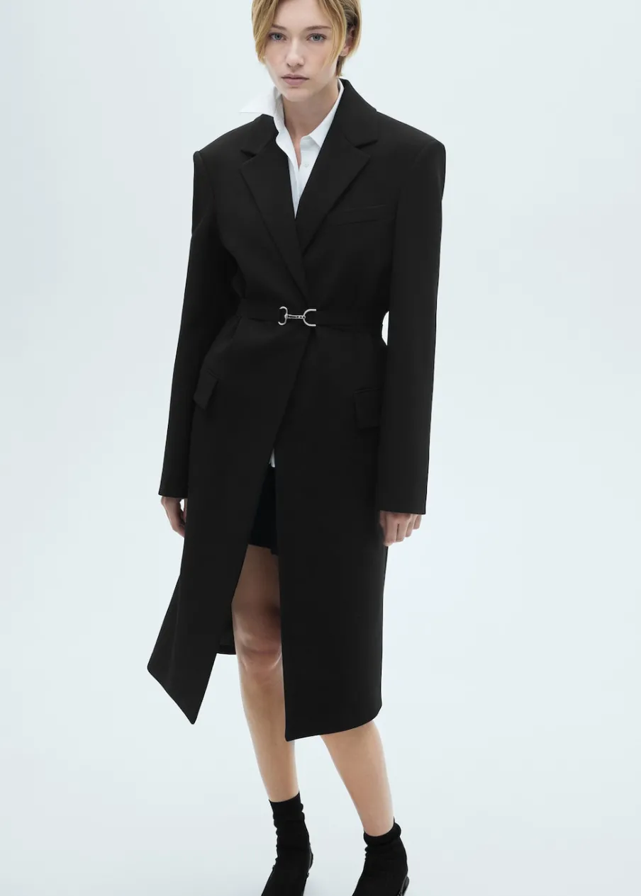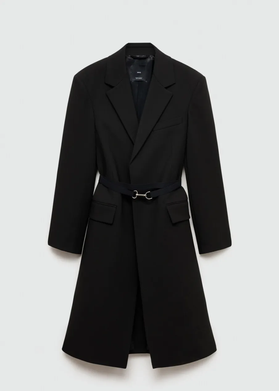 Tkanina mieszanka wełny. Model długi. Model prosty. Model strukturalny. Dekolt w szpic z kołnierzykiem. Klapy z nacięciem. Długi rękaw z guzikami na mankietach. Kieszeń wpuszczana na piersi. Dwie kieszenie z patkami z przodu. Bez zapięcia. Odpinany pasek. Rozcięcie z tyłu u dołu. Wewnętrzna podszewka. Kolekcja Selection.