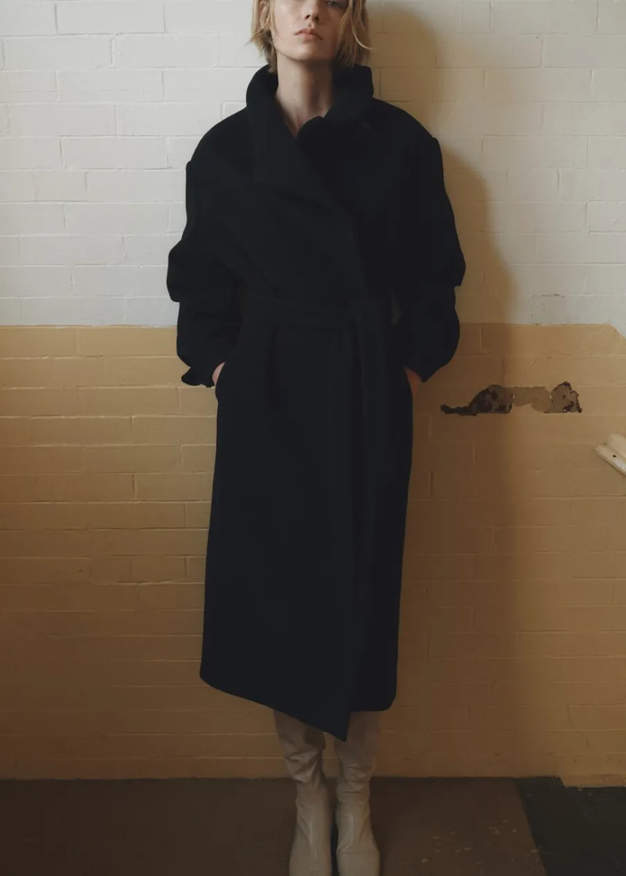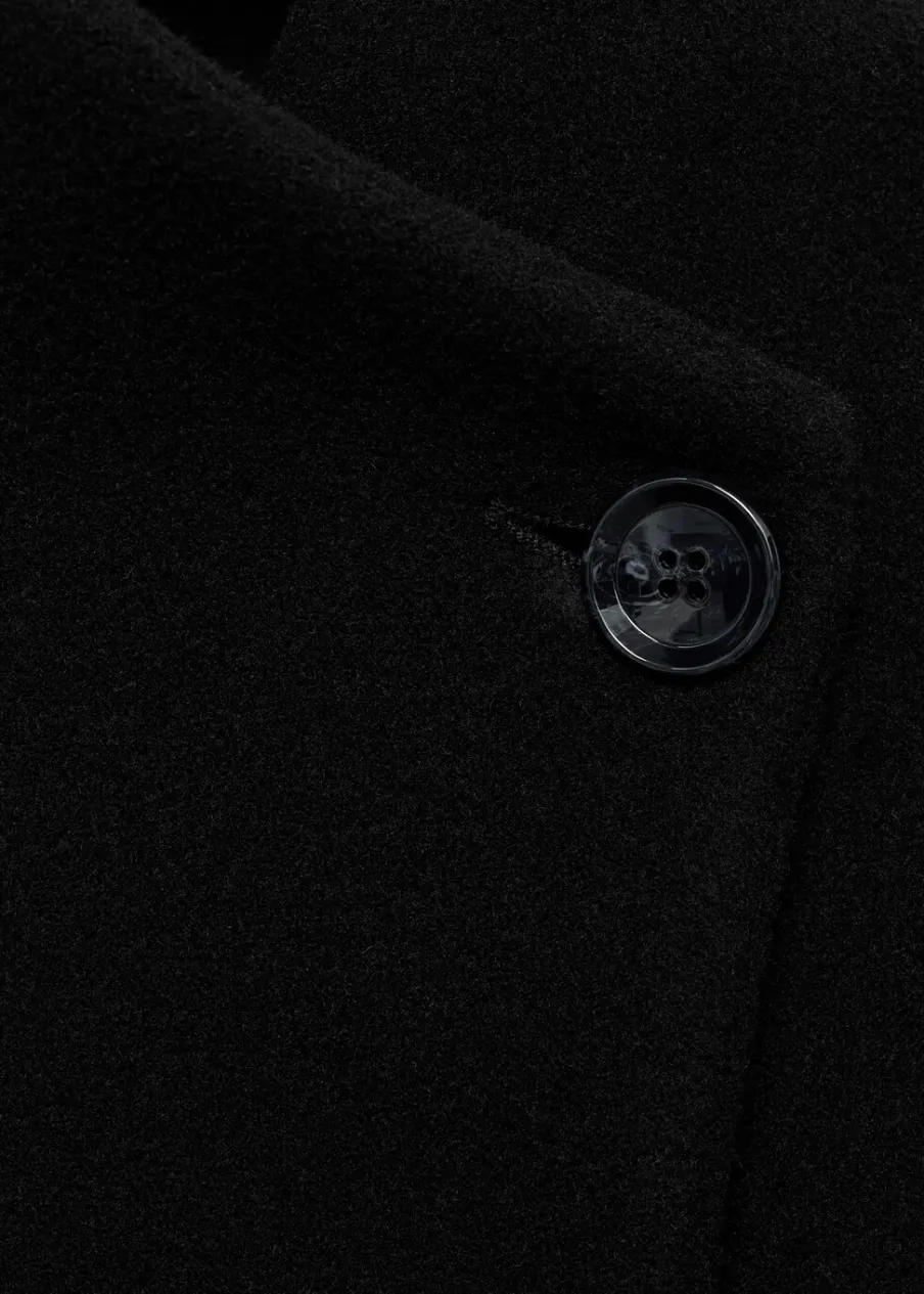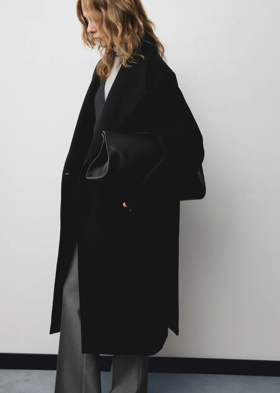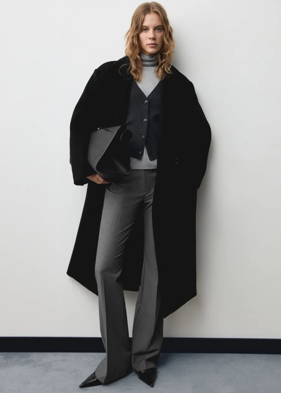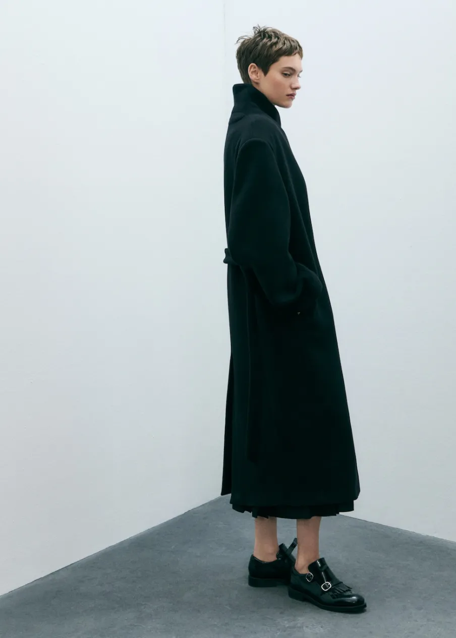 Tkanina z mieszanki wełny dziewiczej. Model prosty. Golf. Kominowy kołnierz. Długi rękaw. Kieszenie boczne. Zapięcie z przodu na guziki. Odpinane wiązanie w pasie. Wewnętrzna podszewka. Modelka ma 179 cm wzrostu i nosi rozmiar S/36.