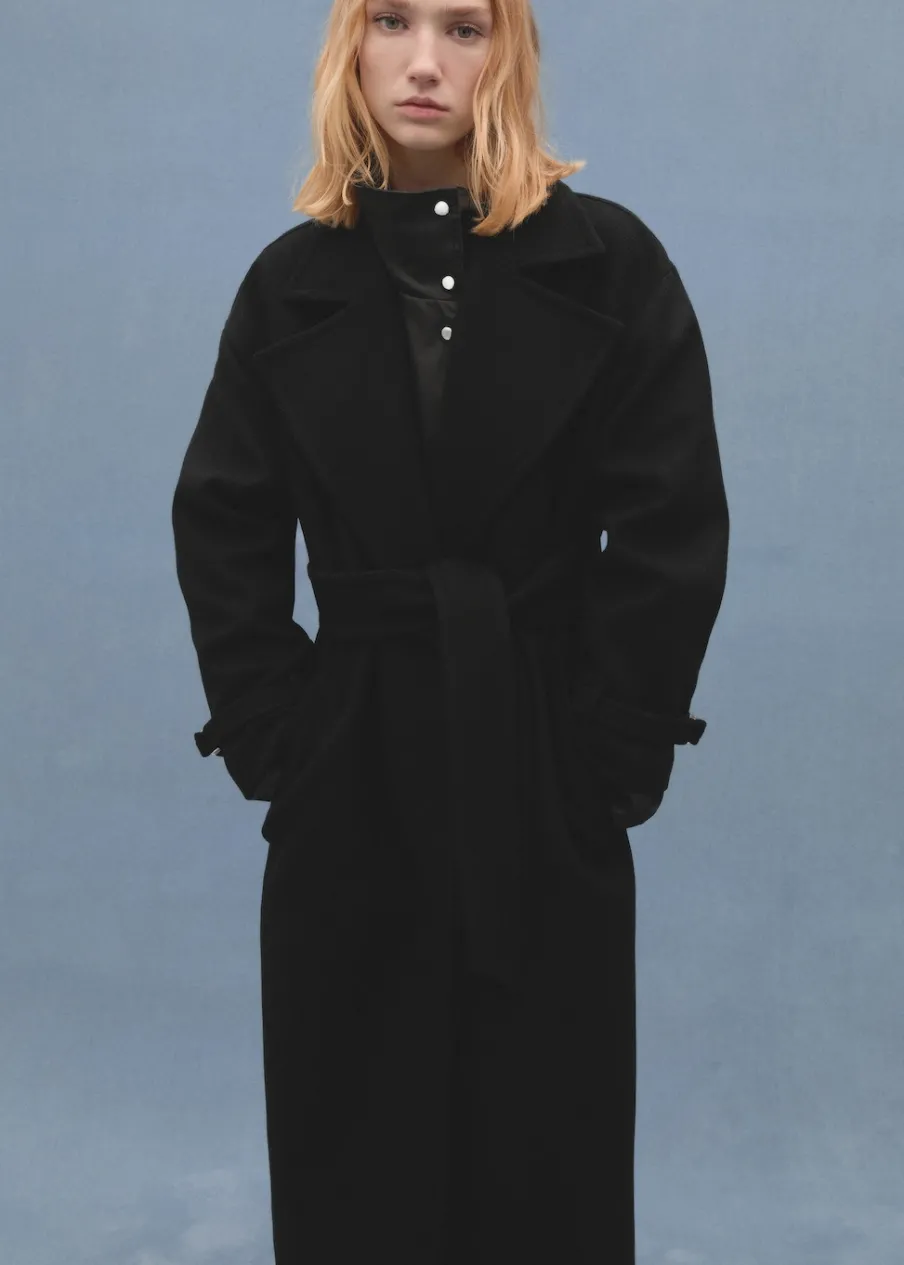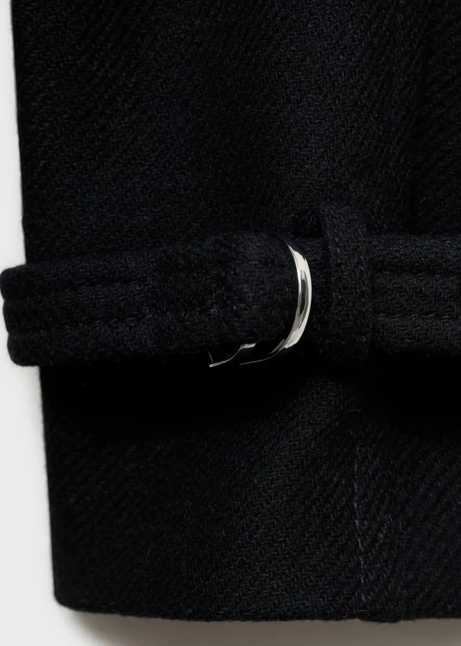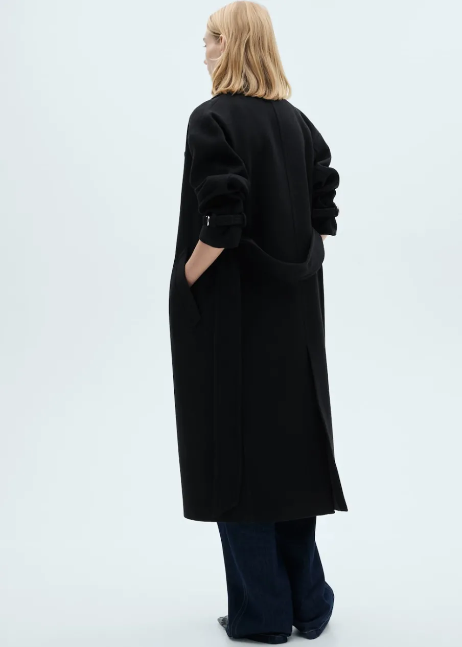 Włoska tkanina wełniana Manteco. Ciężka struktura. Model długi. Model oversize. Kołnierz z klapami. Długi rękaw. Ozdobne sprzączki na mankietach. Zapięcie na guzik z przodu. Regulowany pasek. Wewnętrzna podszewka.