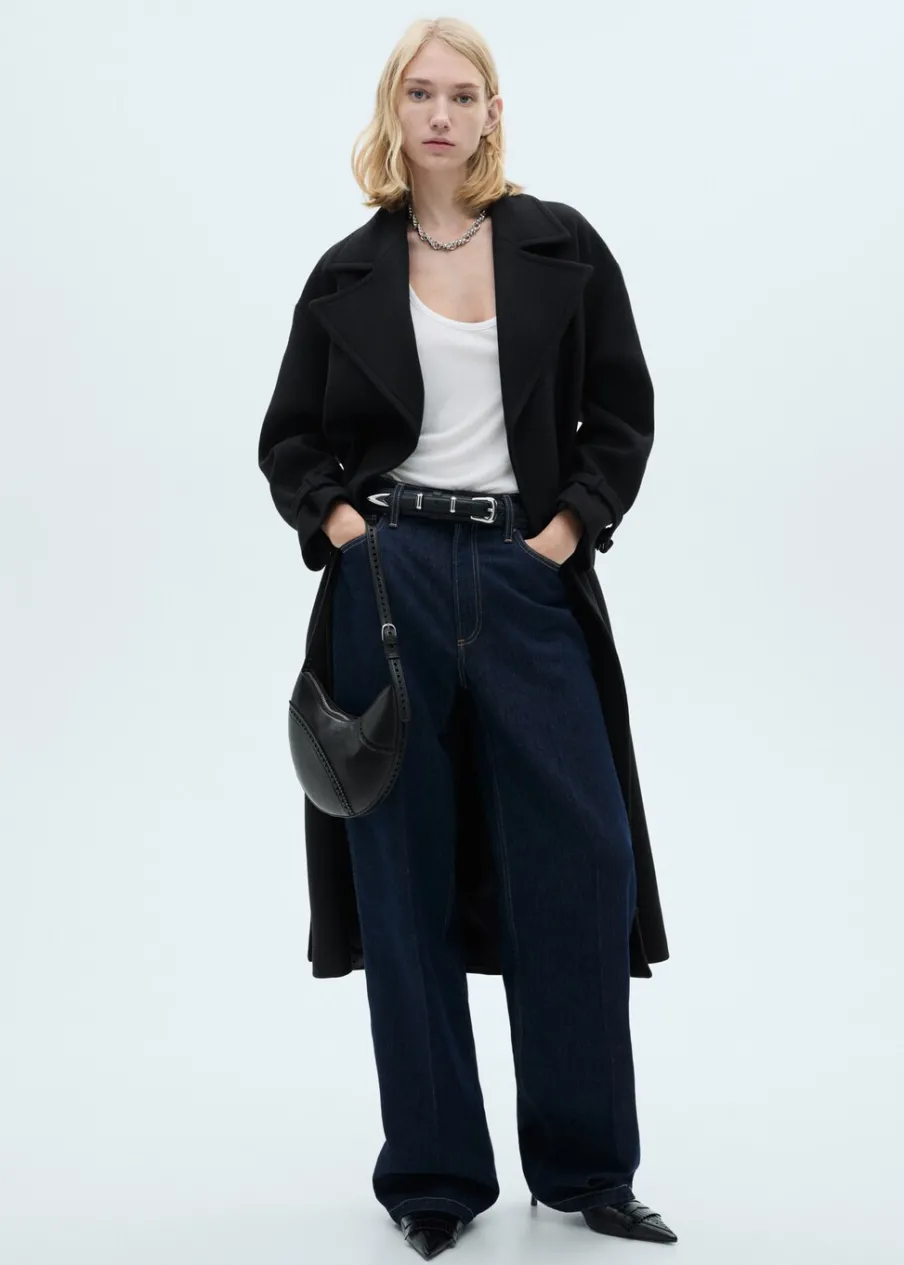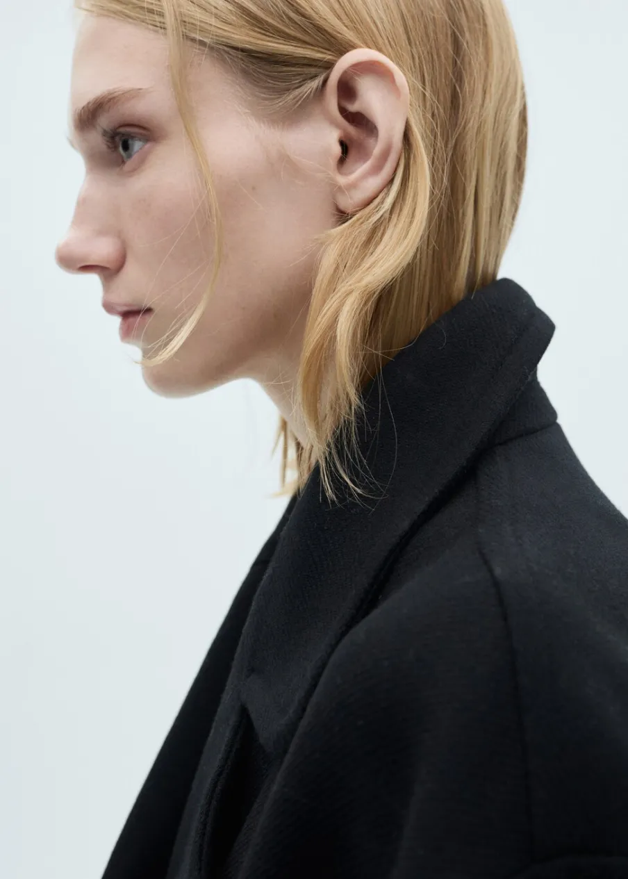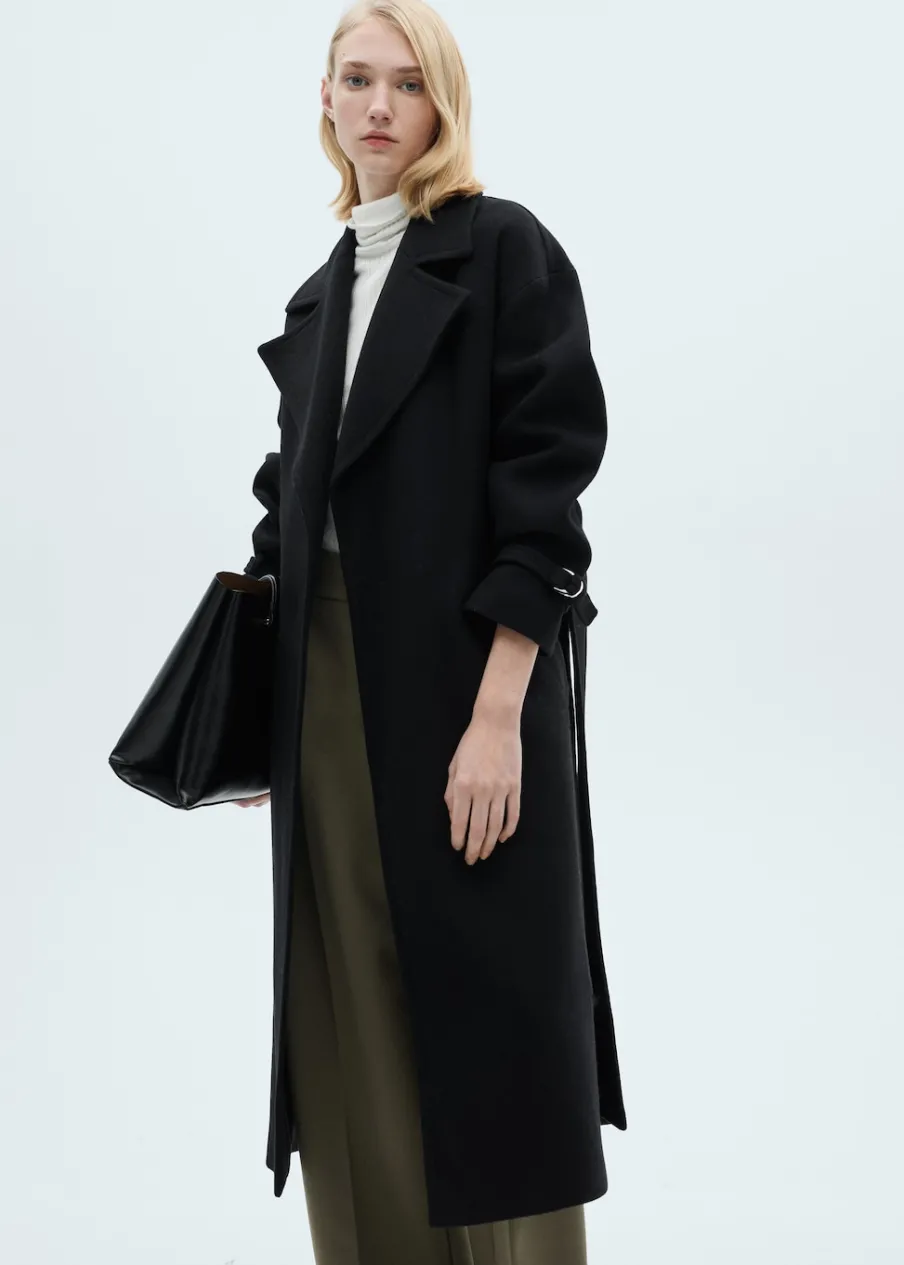 Włoska tkanina wełniana Manteco. Ciężka struktura. Model długi. Model oversize. Kołnierz z klapami. Długi rękaw. Ozdobne sprzączki na mankietach. Zapięcie na guzik z przodu. Regulowany pasek. Wewnętrzna podszewka.