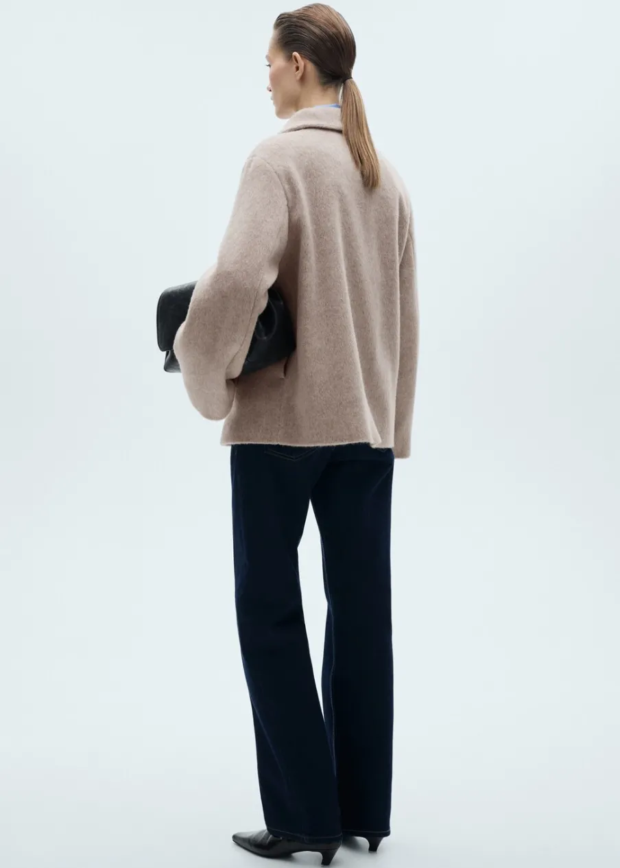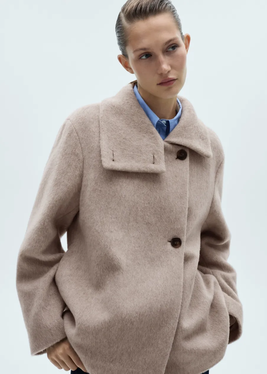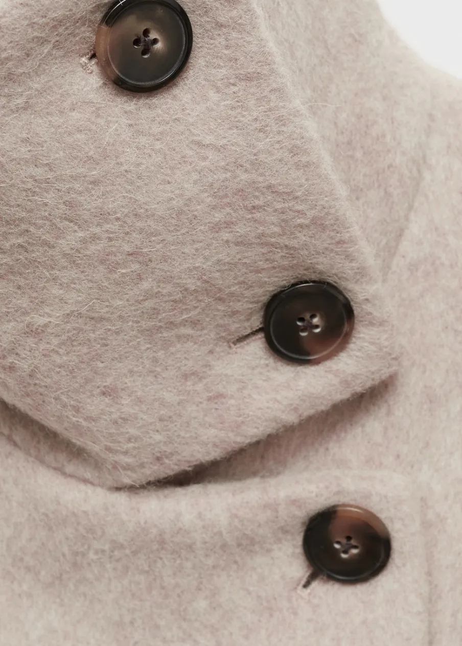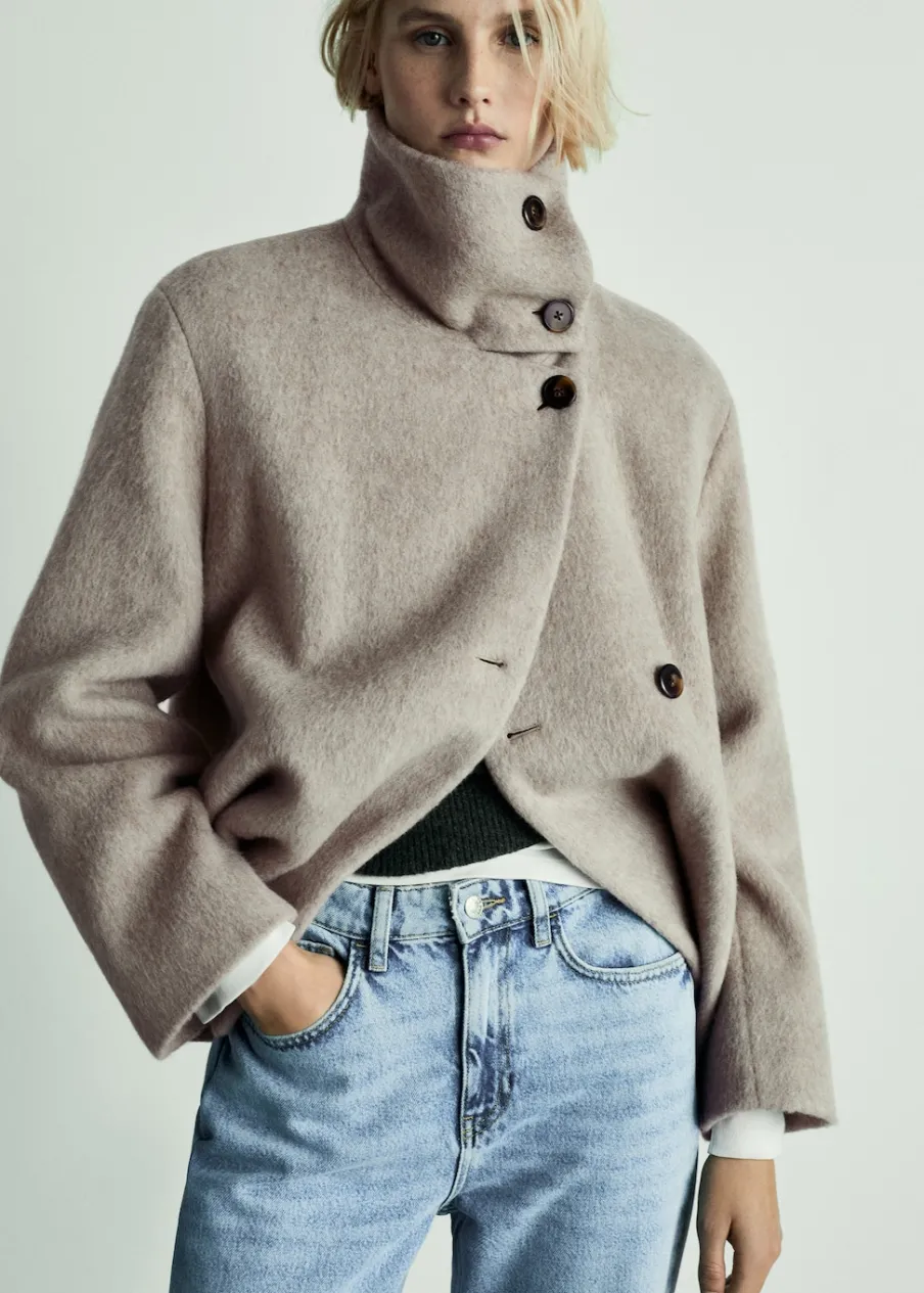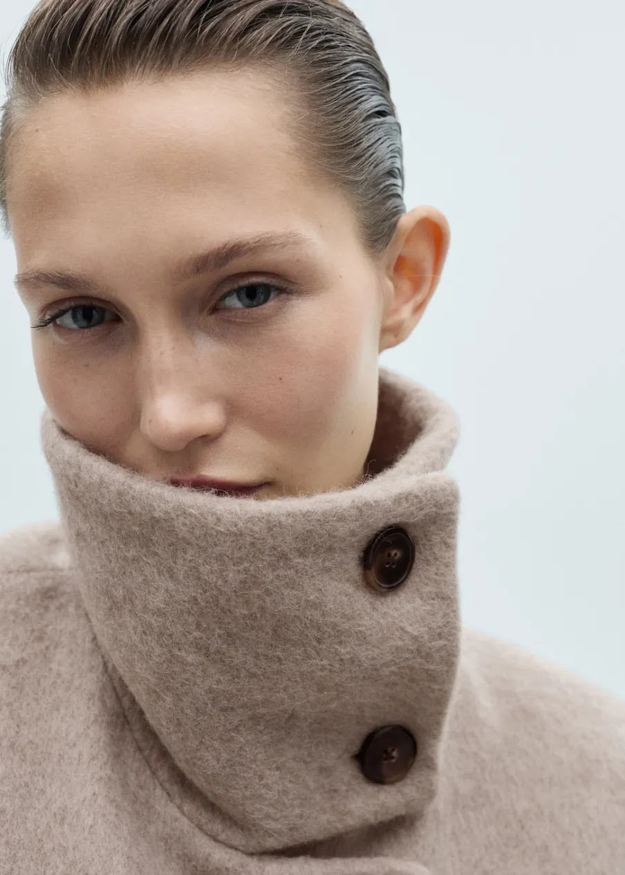 Tkanina mieszanka wełny. Ciężka struktura. Model prosty. Kominowy kołnierz. Golf. Długi rękaw. Zapięcie z przodu na guziki. Wewnętrzna podszewka. Modelka ma 178 cm wzrostu i nosi rozmiar S/36.