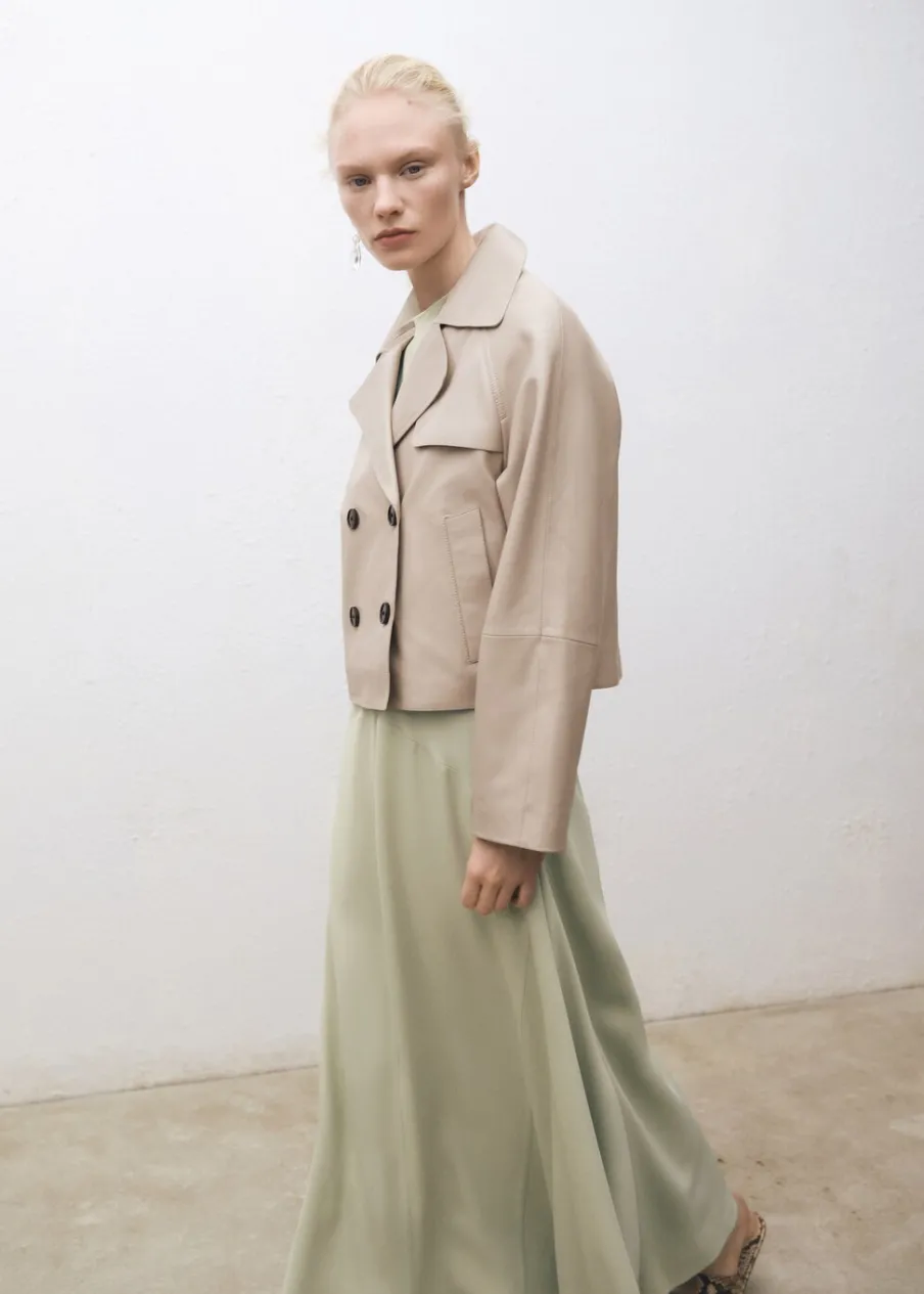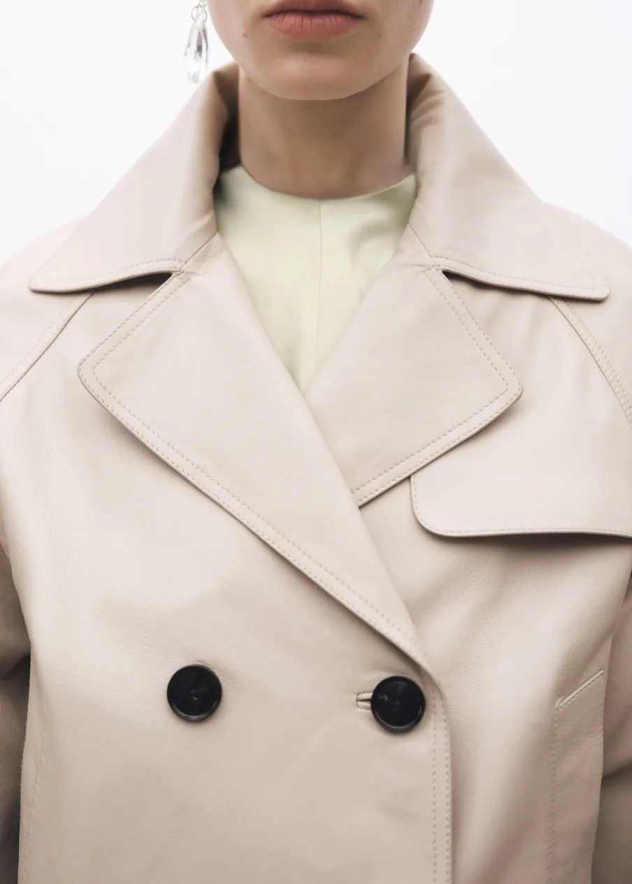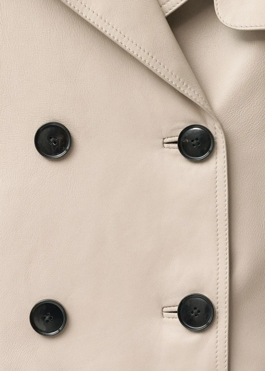 Skóra owcza 100%. Deseń crop. Model prosty. Dekolt w szpic z kołnierzykiem. Klapy z nacięciem. Długi rękaw. Dwie kieszenie boczne. Dwurzędowe zapięcie. Wewnętrzna podszewka. Kolekcja Selection.