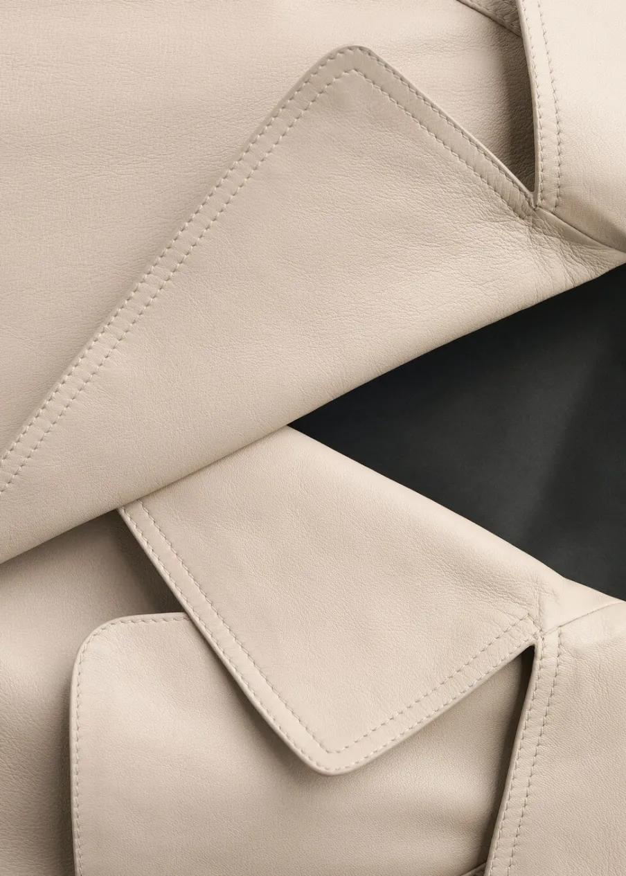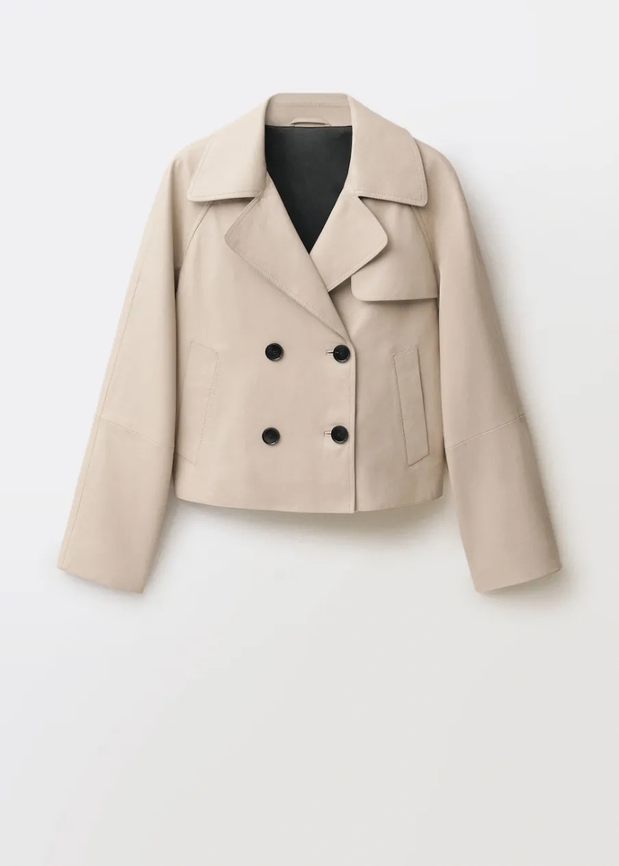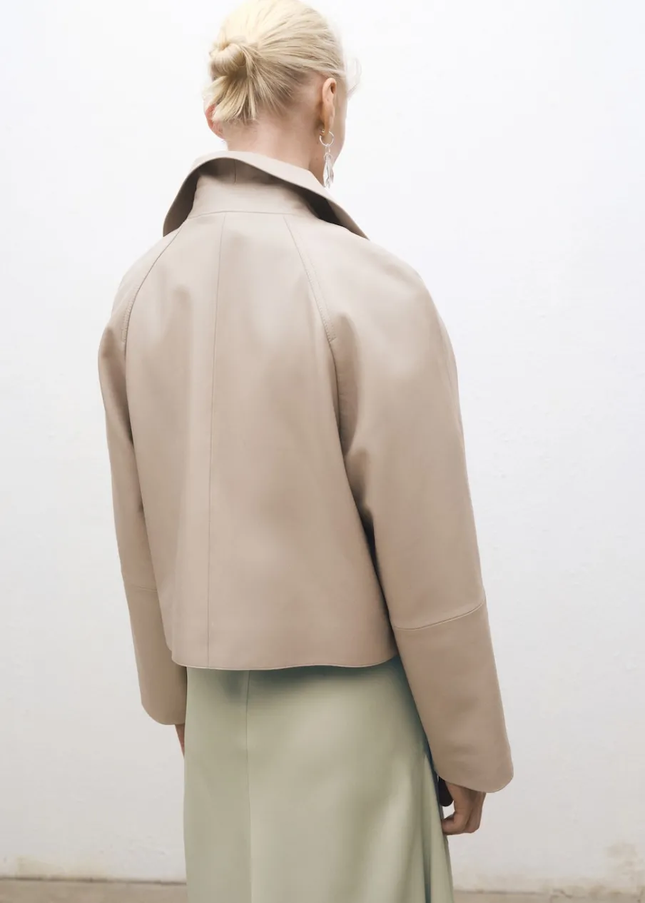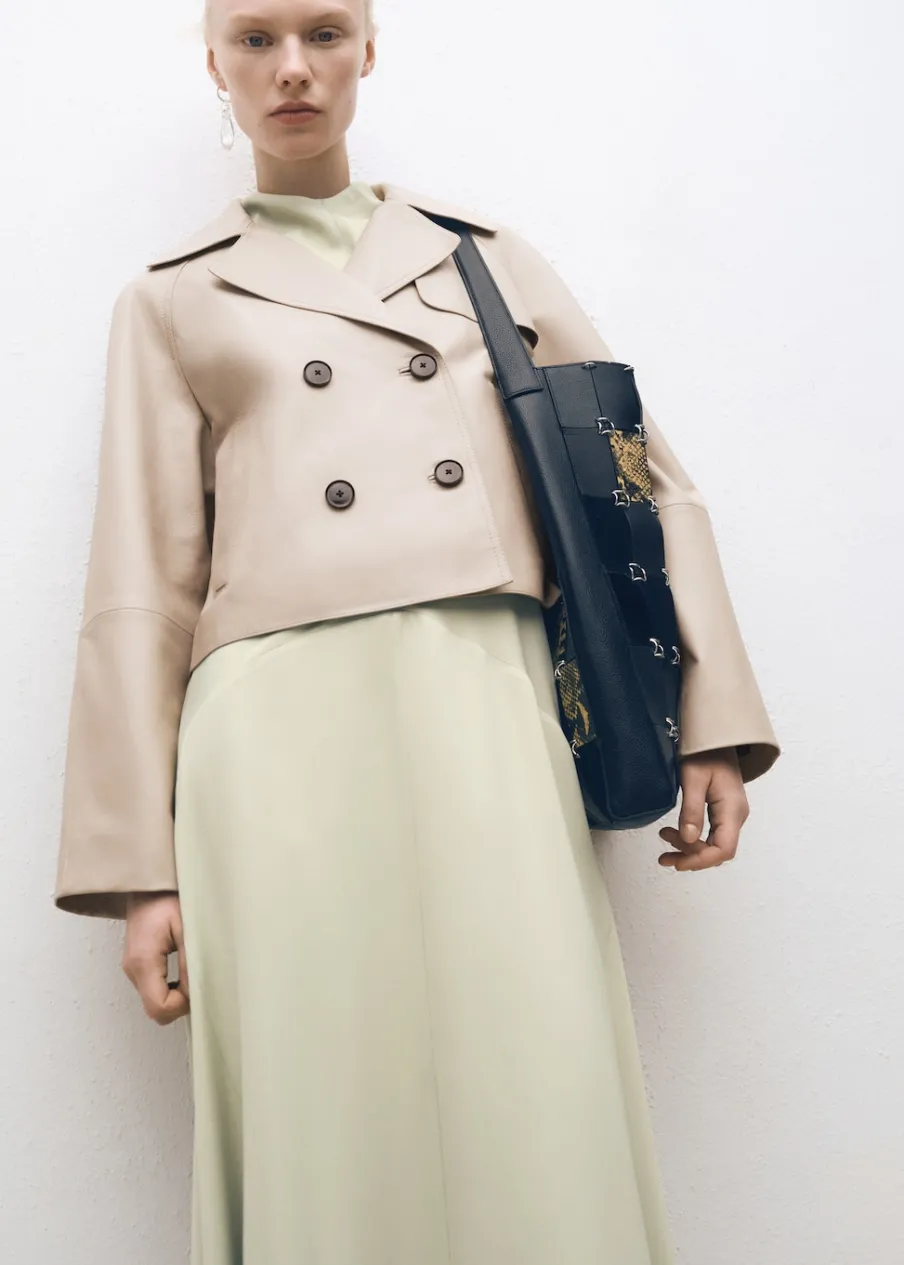 Skóra owcza 100%. Deseń crop. Model prosty. Dekolt w szpic z kołnierzykiem. Klapy z nacięciem. Długi rękaw. Dwie kieszenie boczne. Dwurzędowe zapięcie. Wewnętrzna podszewka. Kolekcja Selection.