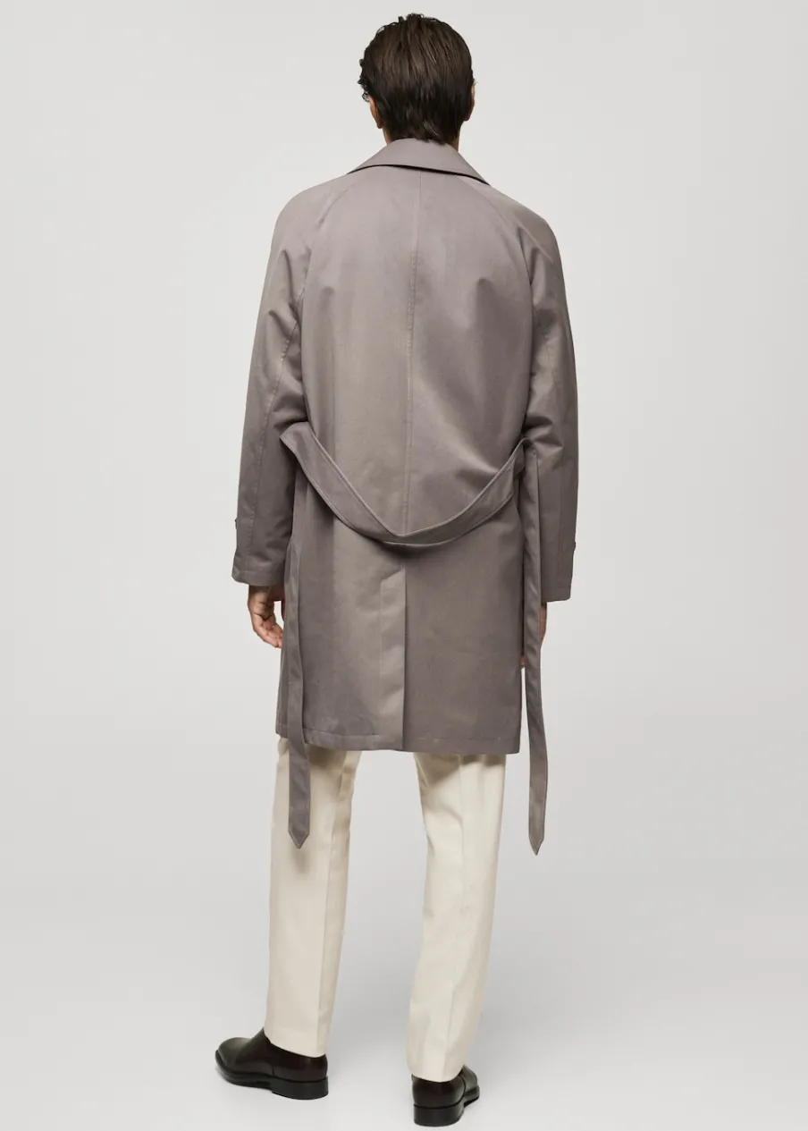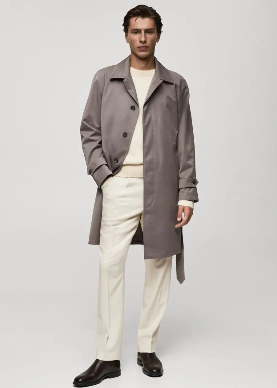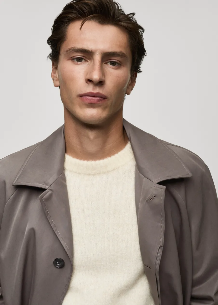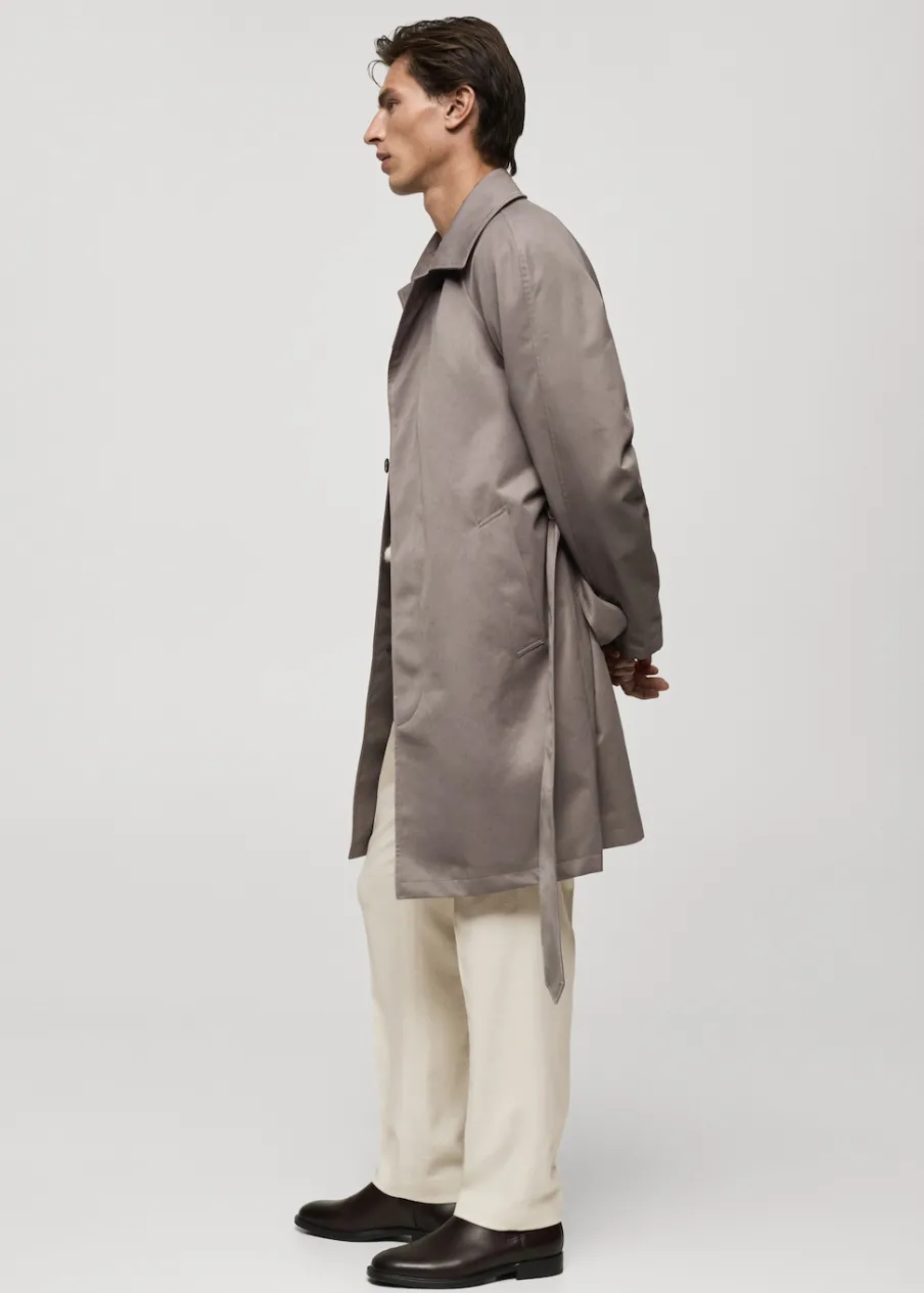 Kolekcja Selection. Klasyczny kołnierzyk. Stójka kołnierzyka z 100% wełny. Kryte zapięcie na guziki z listwą z przodu. Długie rękawy z regulowanymi szlufkami. Dwie kieszenie z wypustkami z przodu. Wiązany pasek. Rozcięcie z tyłu u dołu. Wewnętrzna podszewka. Wewnętrzna kieszeń. Model ma 190 cm wzrostu i nosi rozmiar M. Podwójna tkanina techniczna ze szmerglowanym wykończeniem, które jest komfortowe i miękkie w dotyku.
