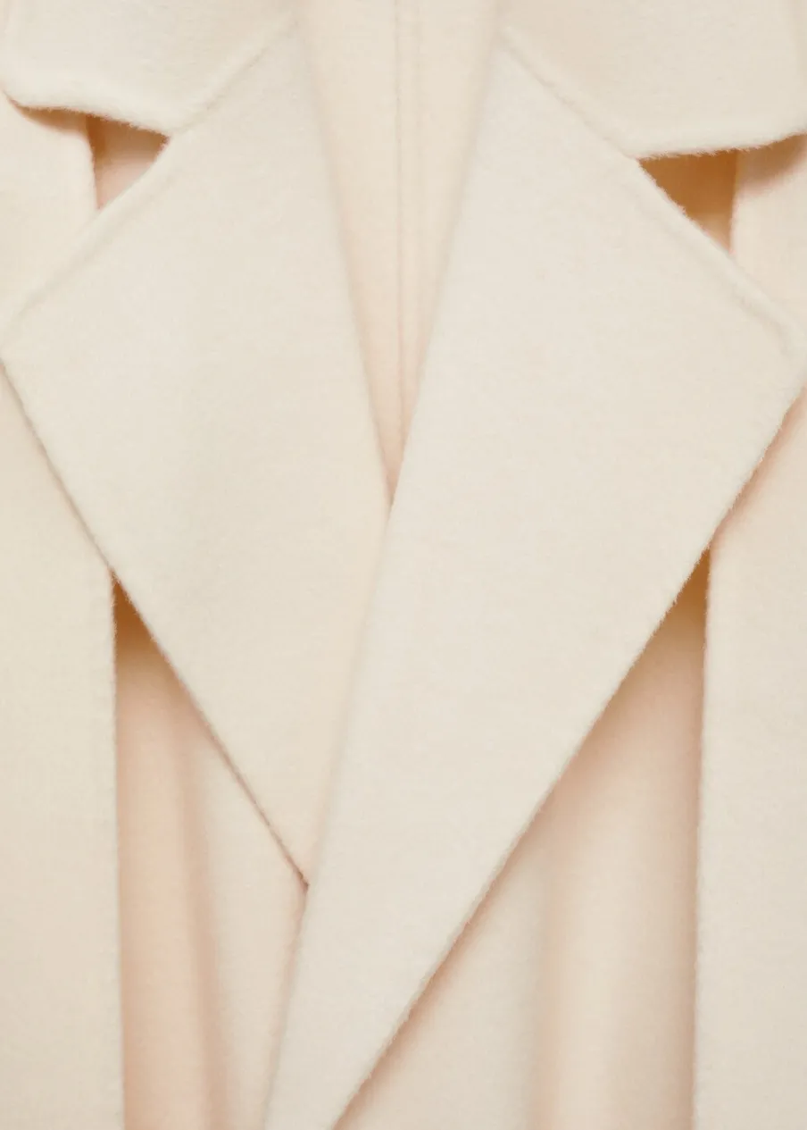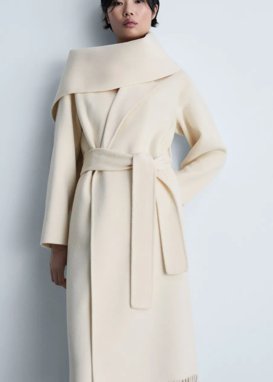 Tkanina mieszanka wełny. Model oversize. Dekolt w szpic z kołnierzykiem. Długi rękaw. Model długi. Wiązanie w pasie. Frędzlowe wykończenie. Rozcięcie z tyłu u dołu. Odpinany szalik. Modelka ma 180 cm wzrostu i nosi rozmiar S/36.