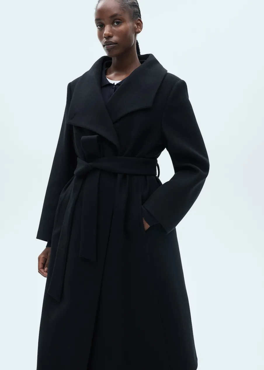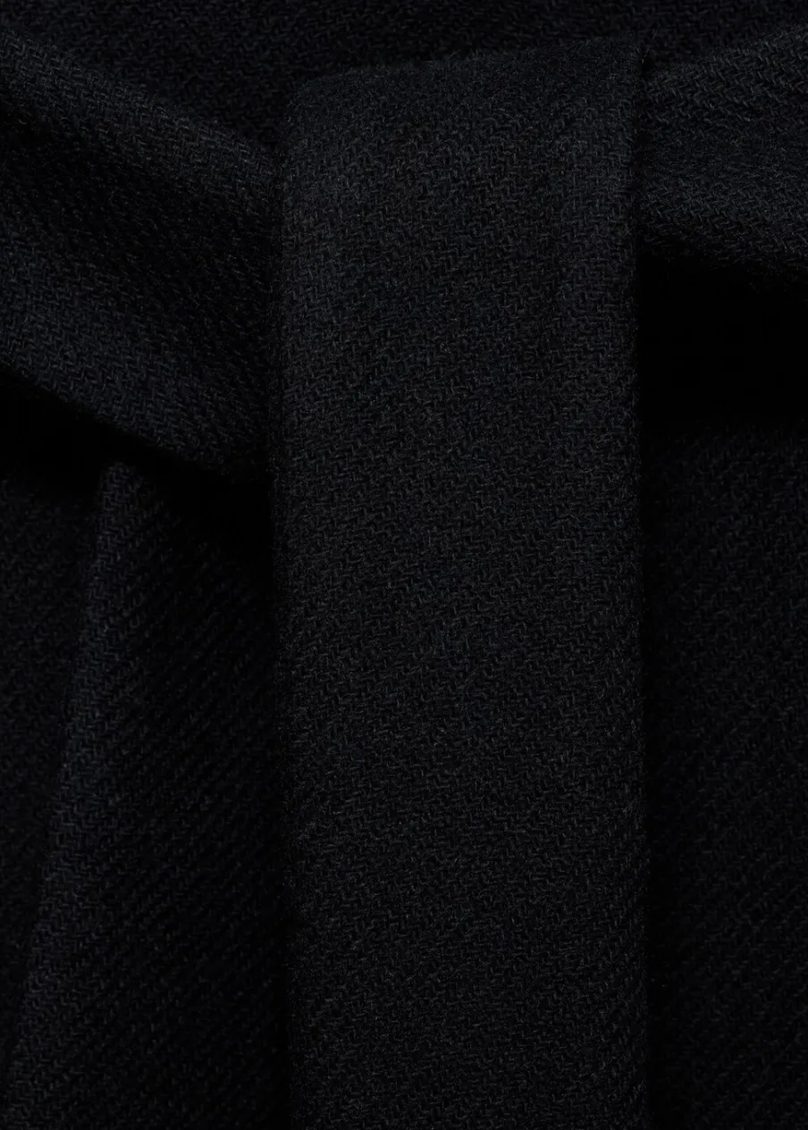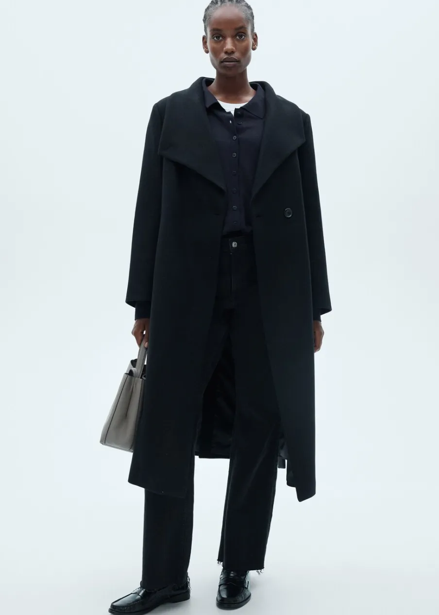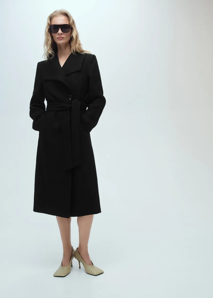 Tkanina mieszanka wełny. Model prosty. Ciężka struktura. Model długi. Dekolt w szpic z kołnierzykiem. Długi rękaw. Pasek szlafrokowy. Szlufki. Dwie kieszenie boczne. Zapięcie na guziki z przodu. Wiązanie z przodu. Wewnętrzna podszewka. Dostępne w Plus Size. Modelka ma 180 cm wzrostu i nosi rozmiar S/36.