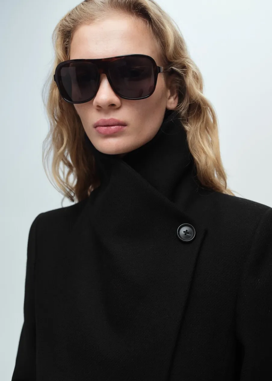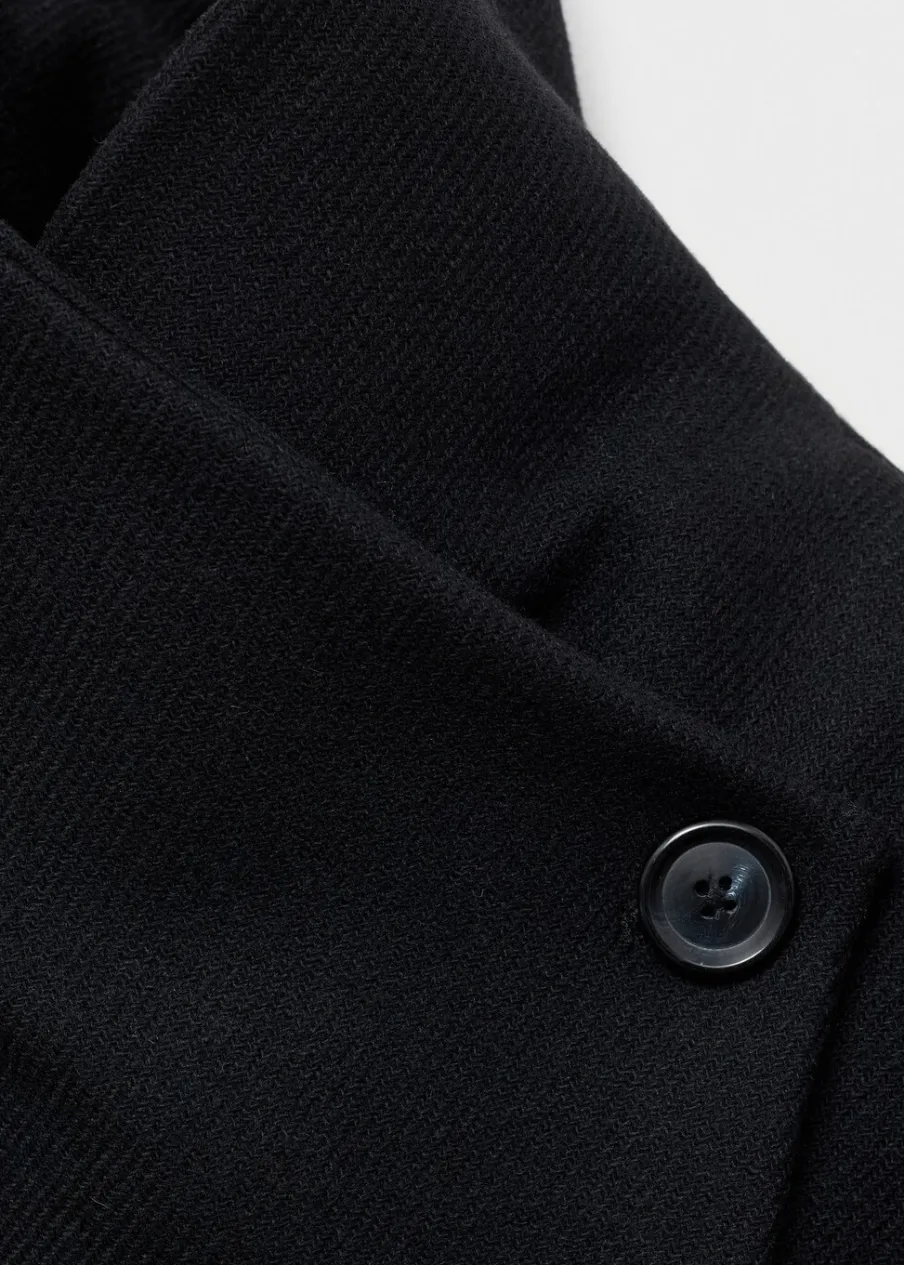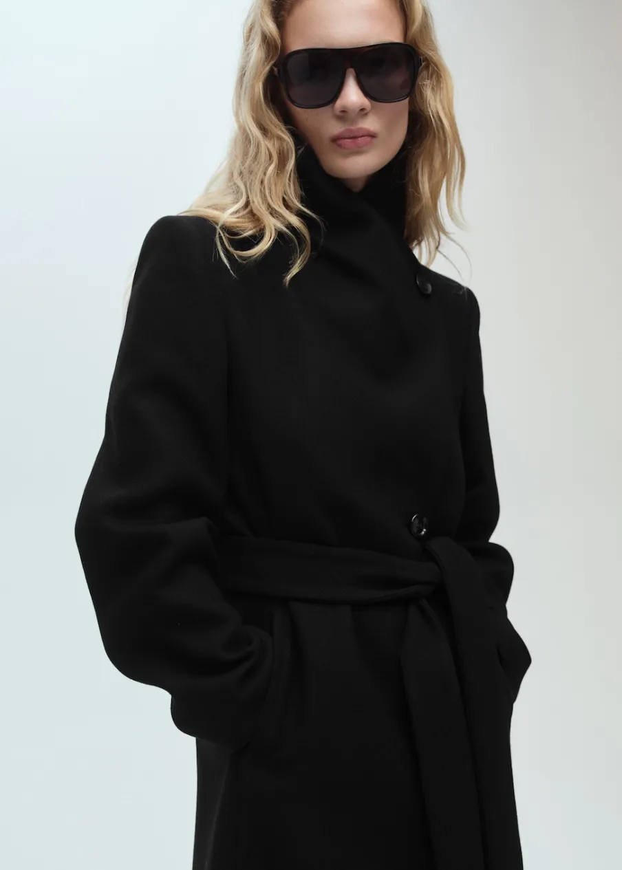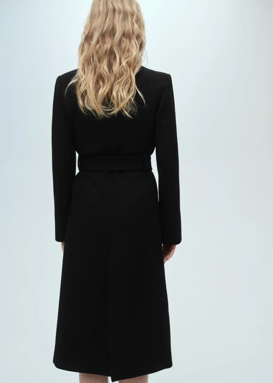Tkanina mieszanka wełny. Model prosty. Ciężka struktura. Model długi. Dekolt w szpic z kołnierzykiem. Długi rękaw. Pasek szlafrokowy. Szlufki. Dwie kieszenie boczne. Zapięcie na guziki z przodu. Wiązanie z przodu. Wewnętrzna podszewka. Dostępne w Plus Size. Modelka ma 180 cm wzrostu i nosi rozmiar S/36.