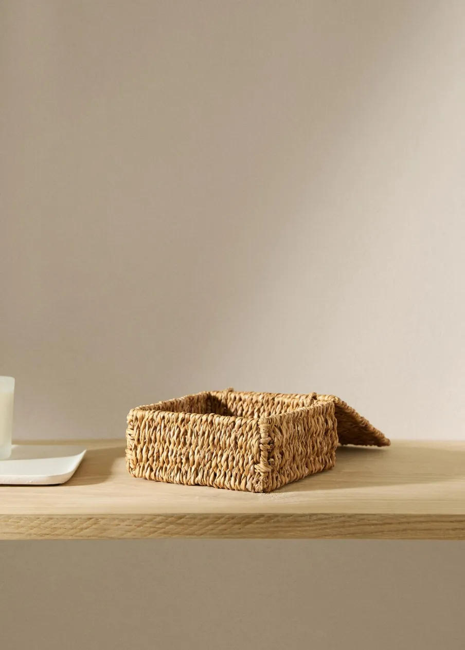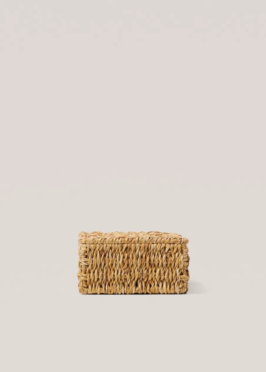 Wymiary: 17 x 17 cm. 100% pałka. Naturalne włókna. Model pleciony. Struktura z metalu. Z pokrywą. Ten model koszyka jest dostępny w 3 rozmiarach (S, M, L).