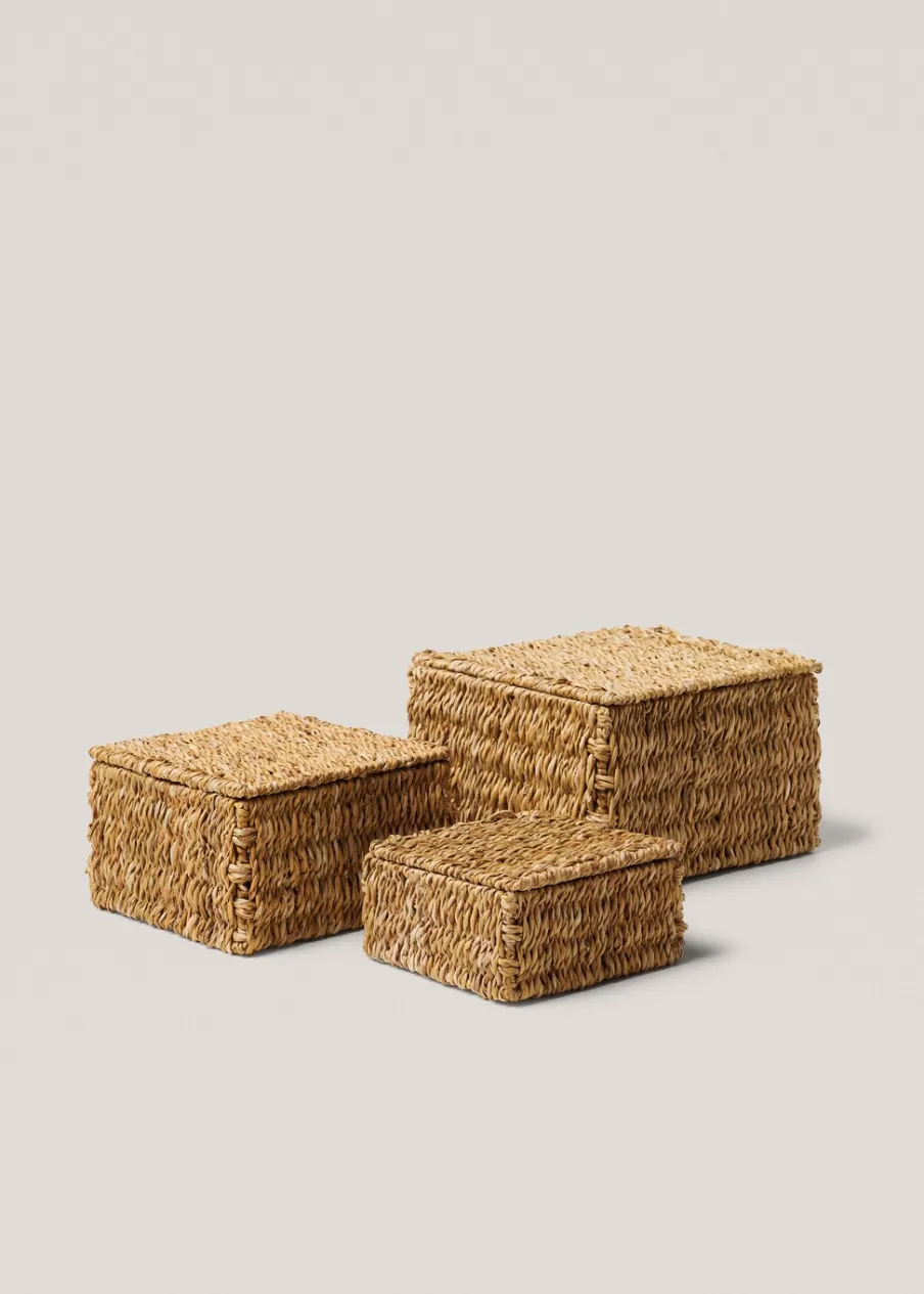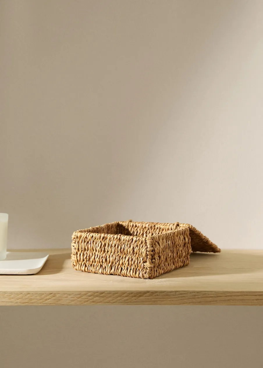Wymiary: 21 x 21 cm. 100% pałka. Naturalne włókna. Model pleciony. Struktura z metalu. Z pokrywą. Ten model koszyka jest dostępny w 3 rozmiarach (S, M, L).
