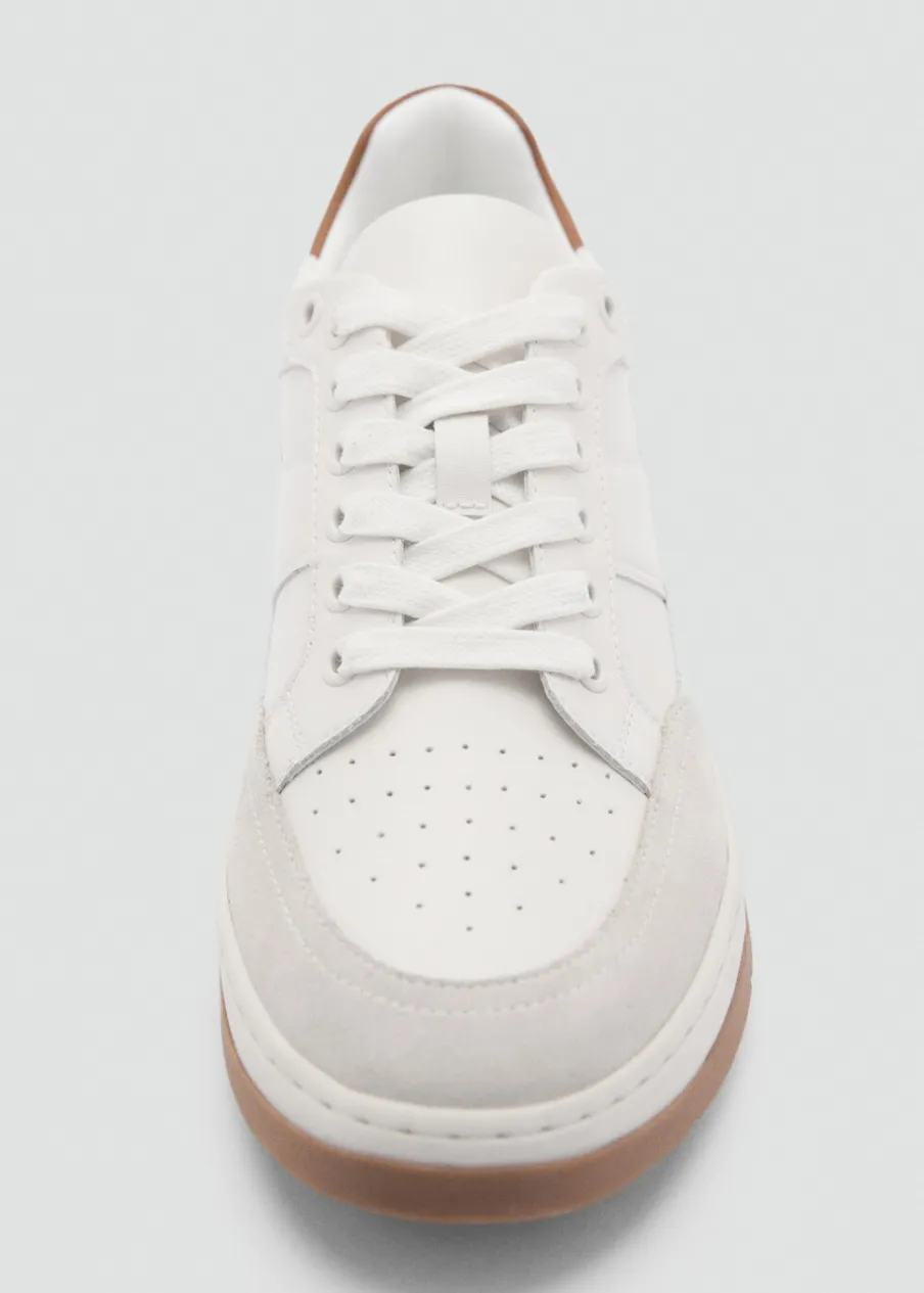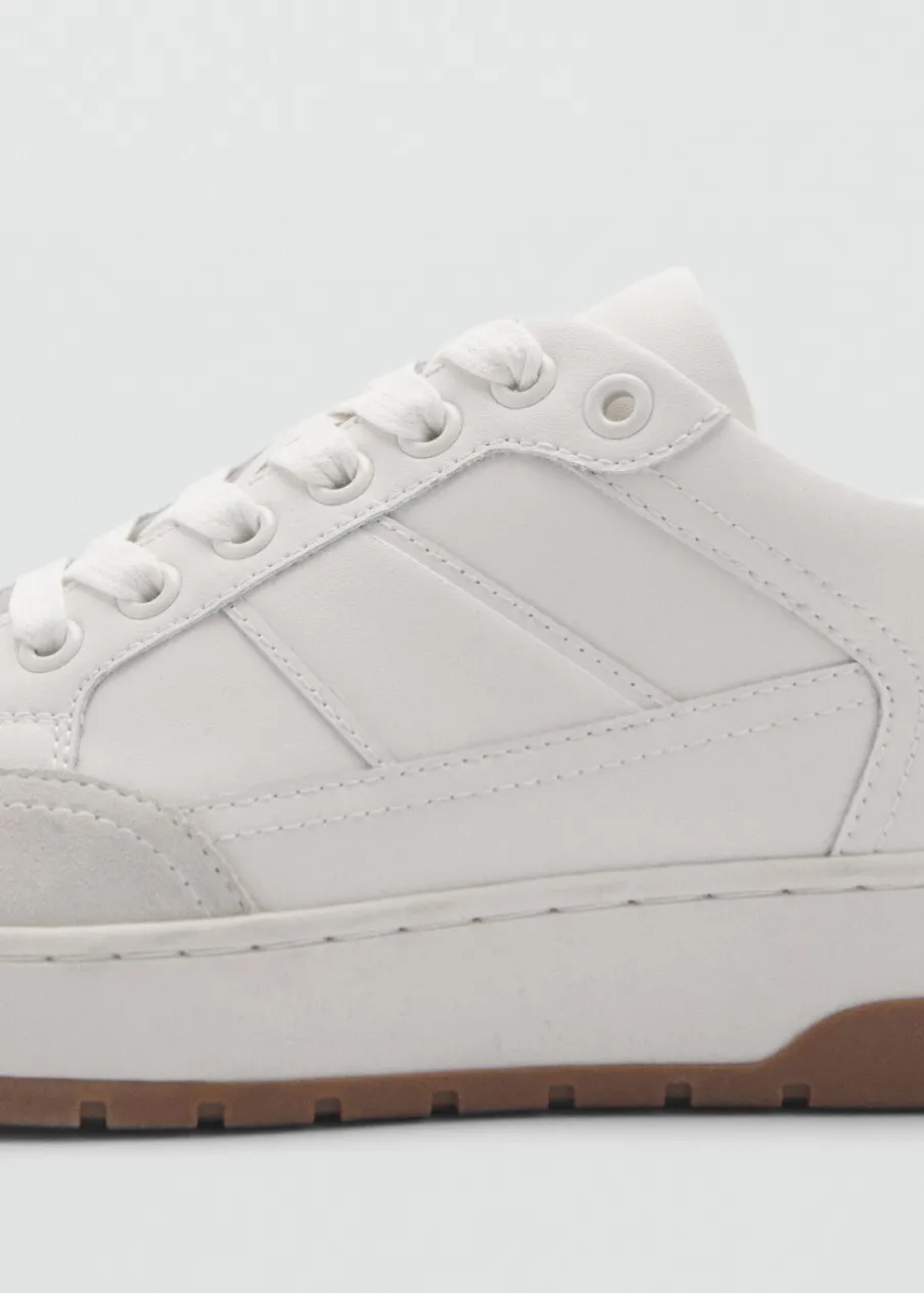 Wierzch ze skóry. Kontrastowe wstawki z dwoiny. Okrągły nosek. Stębnowane detale. Wiązanie na sznurówki. Gruba podeszwa z gumy w kontrastowym kolorze.