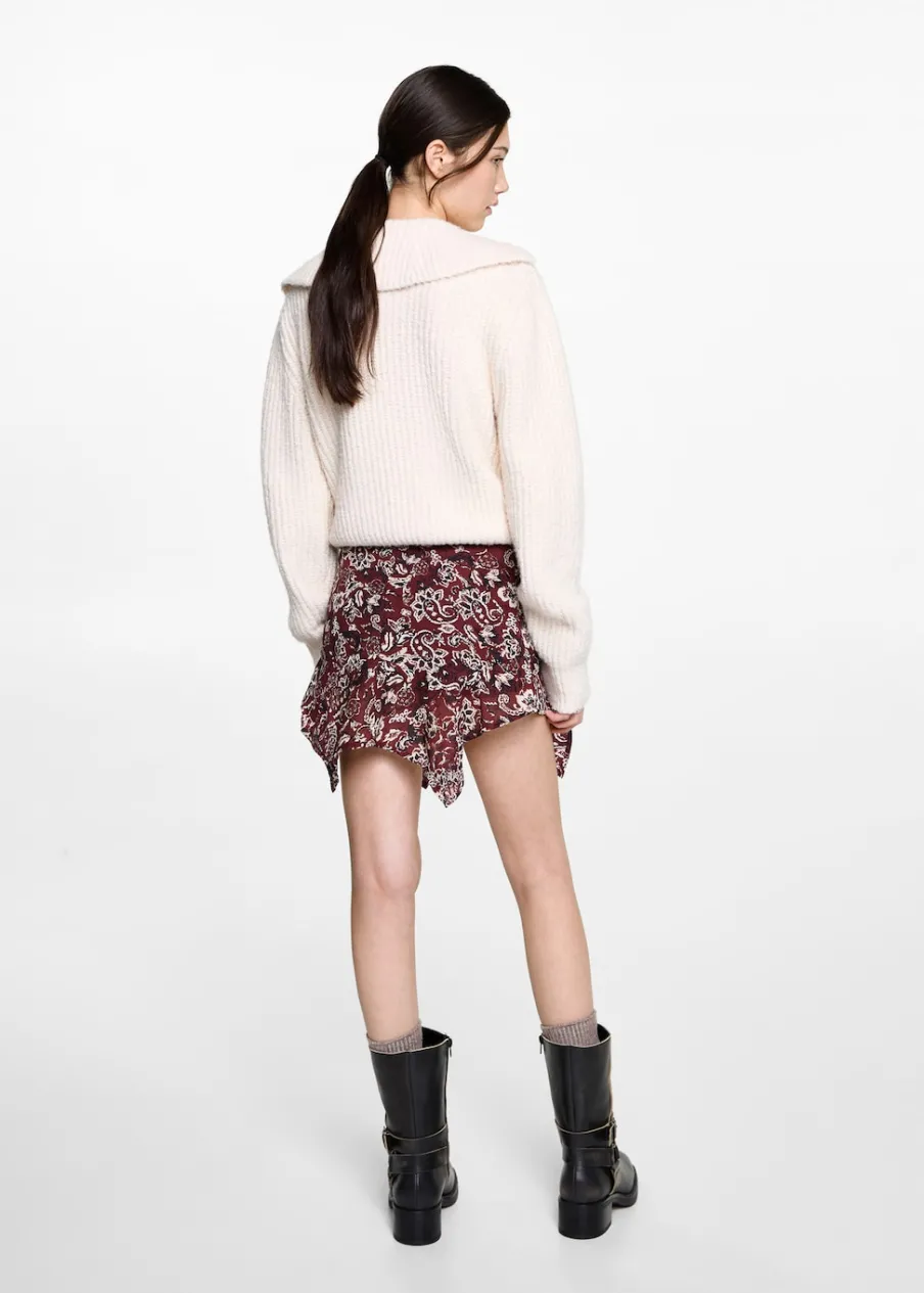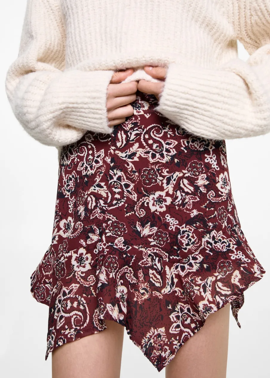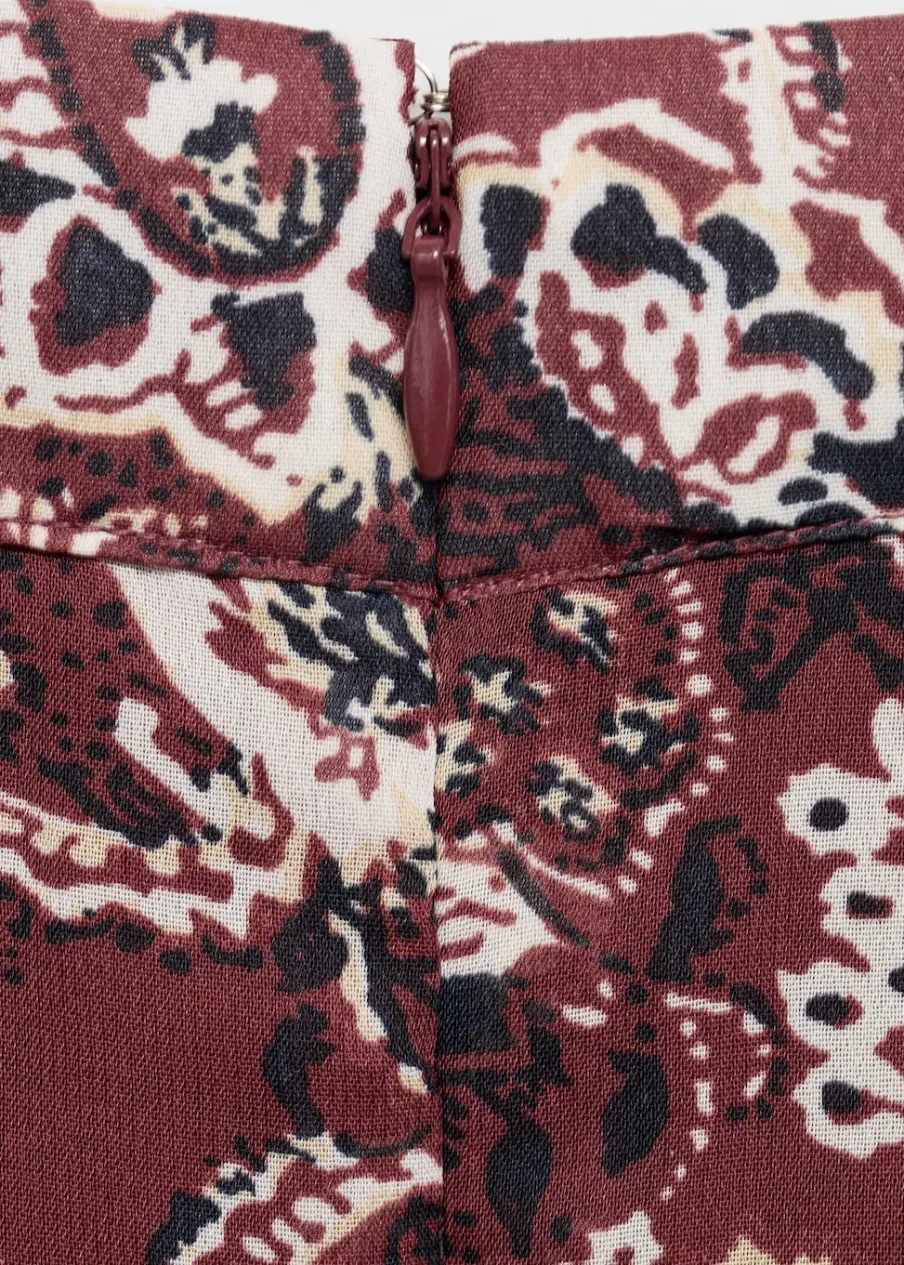 Lejąca tkanina. Nadruk. Asymetryczny krój. Krótki krój. Kryte zapięcie na zamek z boku. Modelka ma 172 cm wzrostu i nosi rozmiar M.
